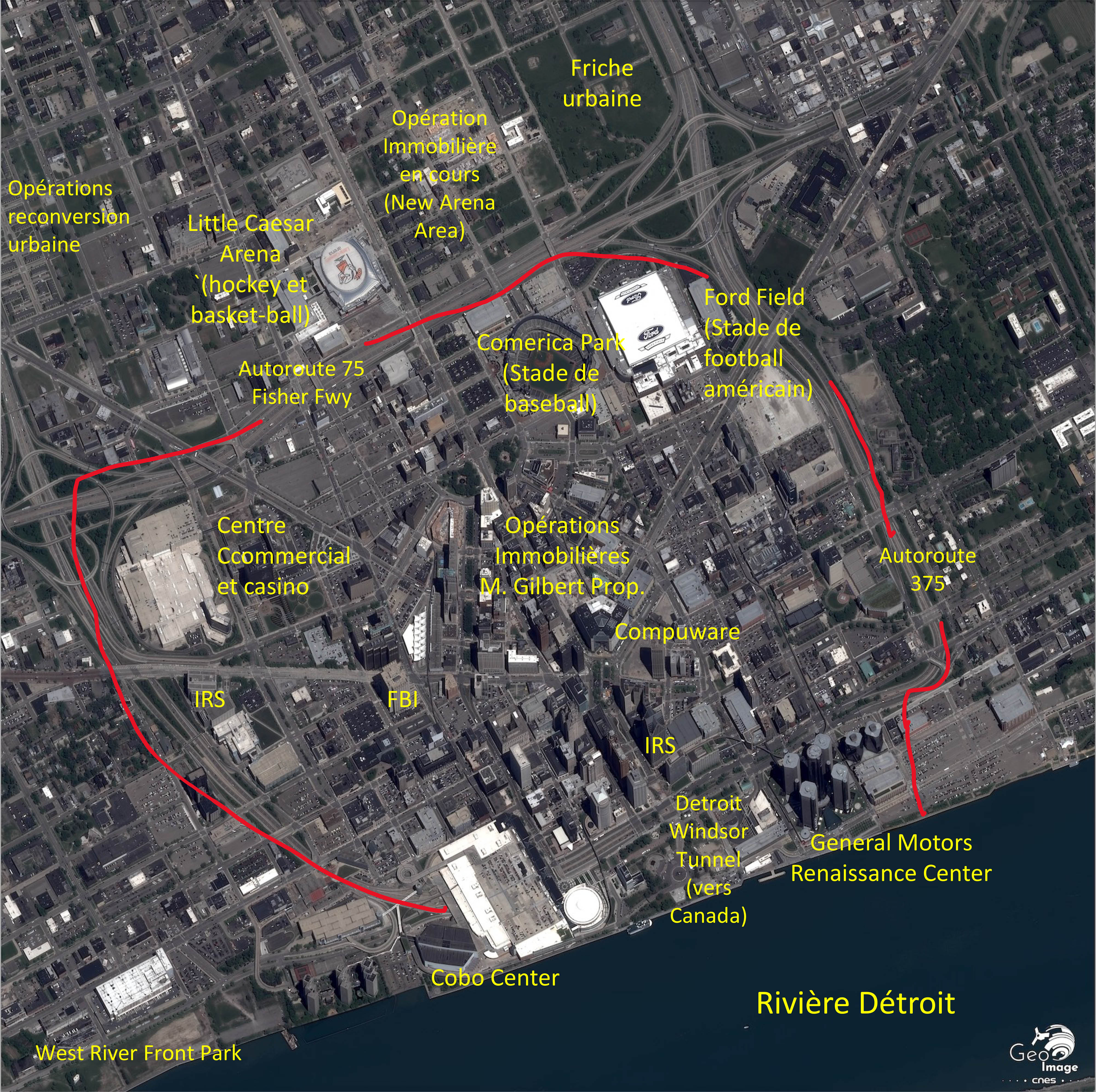 Dans Détroit, le CBD est un espace restreint de 3,5 km sur 1,5 km posé face à Windsor sur le Rivière Détroit. Il est borné et ceinturé par un vaste anneau autoroutier. Il se caractérise, comme souvent en Amérique du Nord, par l’importance de ses hauts bâtiments et la présence en particulier de tours élevées et par les vastes emprises au sol des aires de parkings qui s’expliquent par le recours généralisé à l’automobile comme moyen de transport face à des transports collectifs limités.