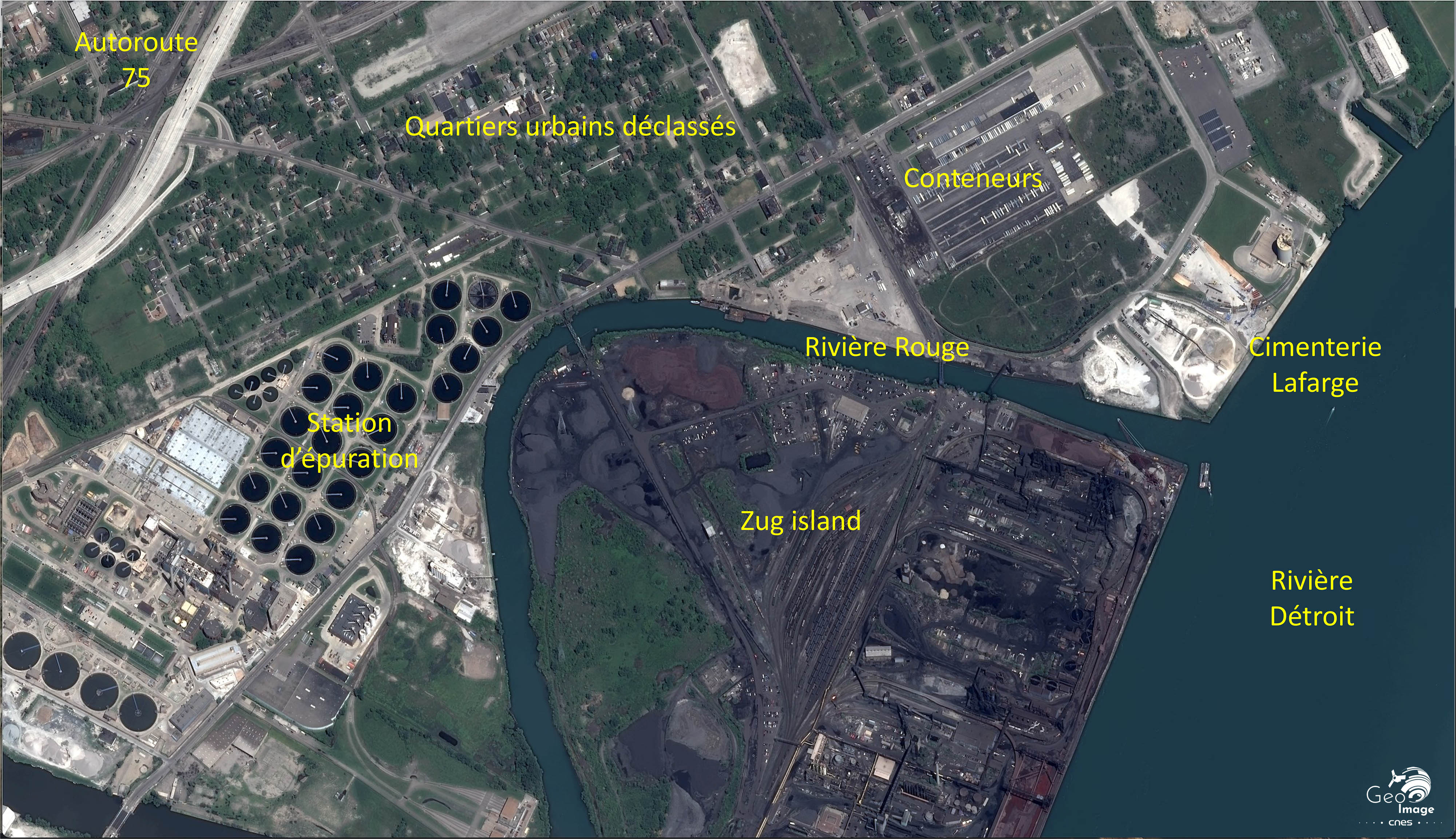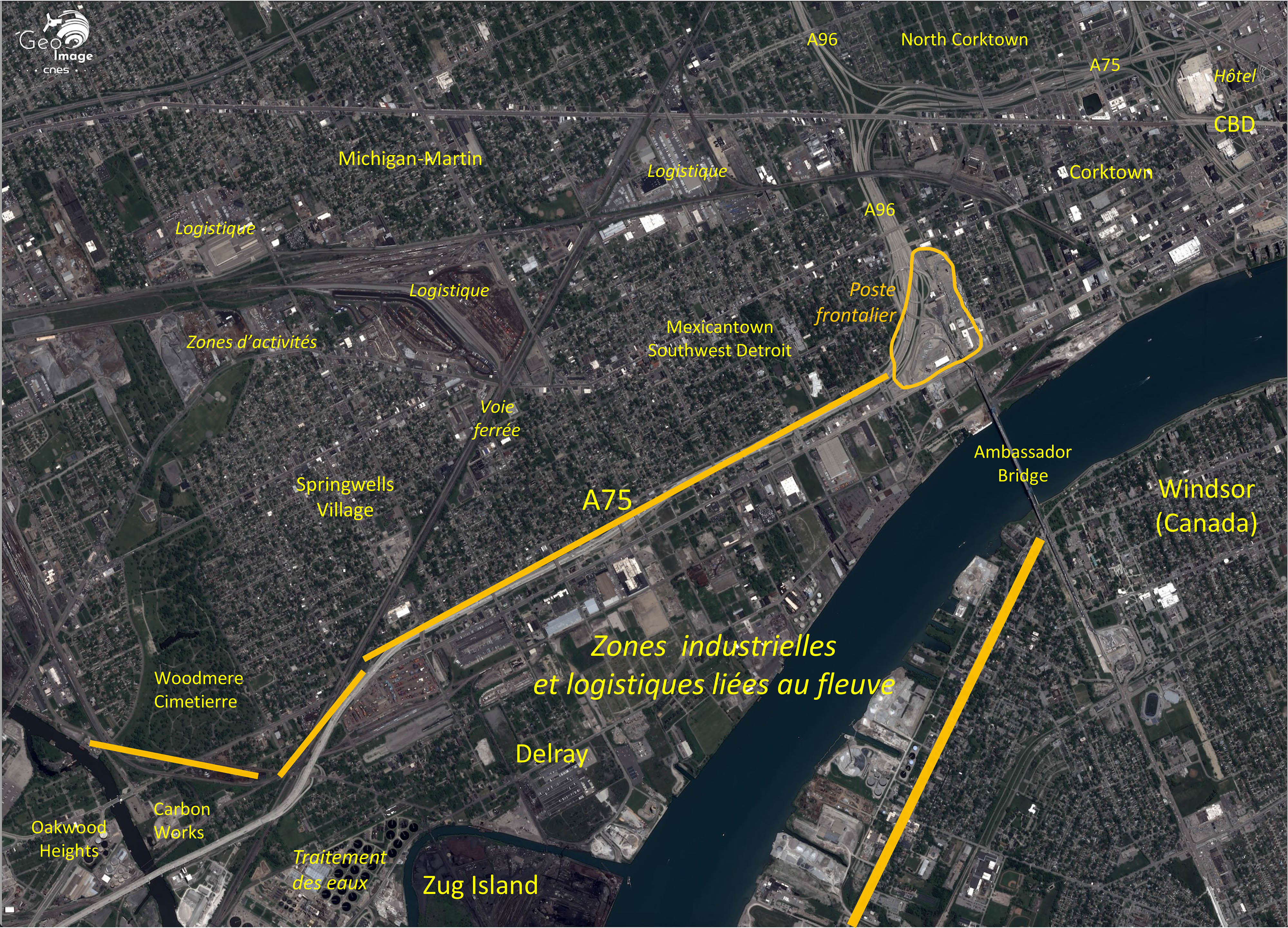 Animé par de puissants courants d’échange, la Rivière Détroit forme dans l’agglomération de Détroit/Windsor un puissant Water Front historiquement largement valorisé par les industries lourdes (sidérurgie, métallurgie, chimie, granulats...) comme en témoigne au sud-est de l’image de Détroit la basse vallée de la Rivière Rouge avec la présence de la Zug Island ou du complexe métallurgique de Ford à Dearborn. L’essor historique de l’automobile à Détroit s’explique donc fondamentalement par les liens tissés avec les secteurs amont - charbon et acier, sidérurgie et métallurgie - grâce aux Grands Lacs.