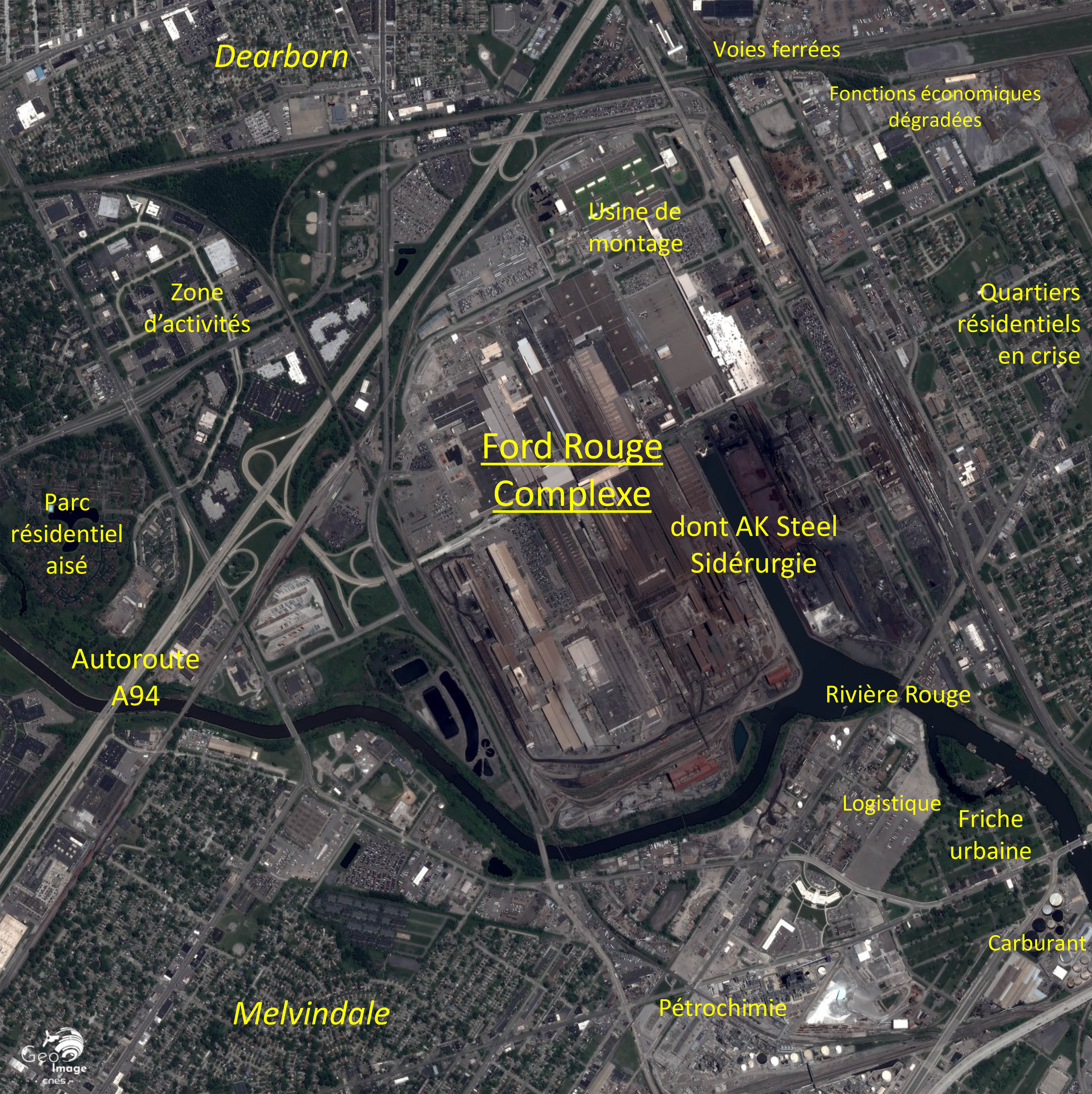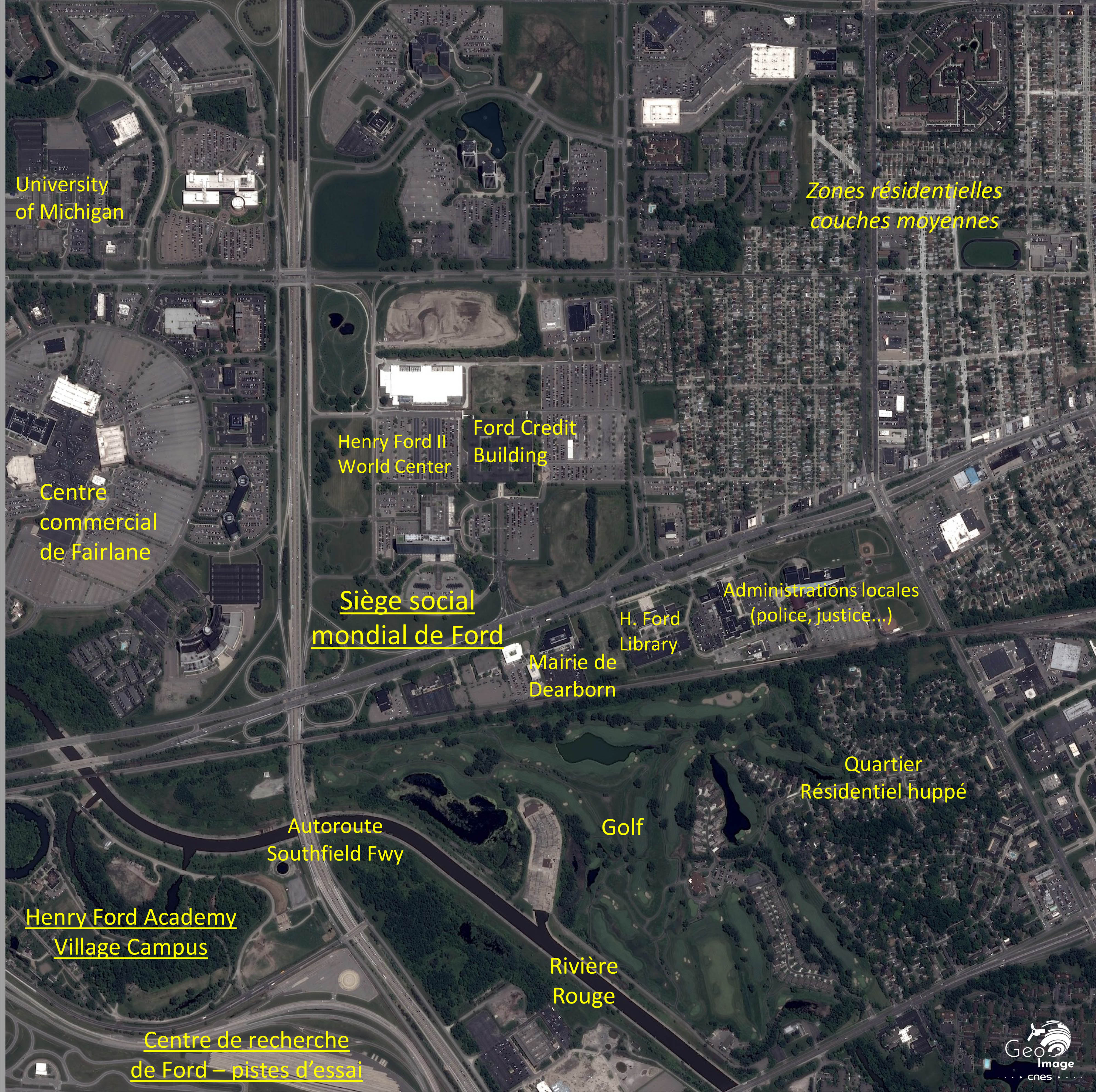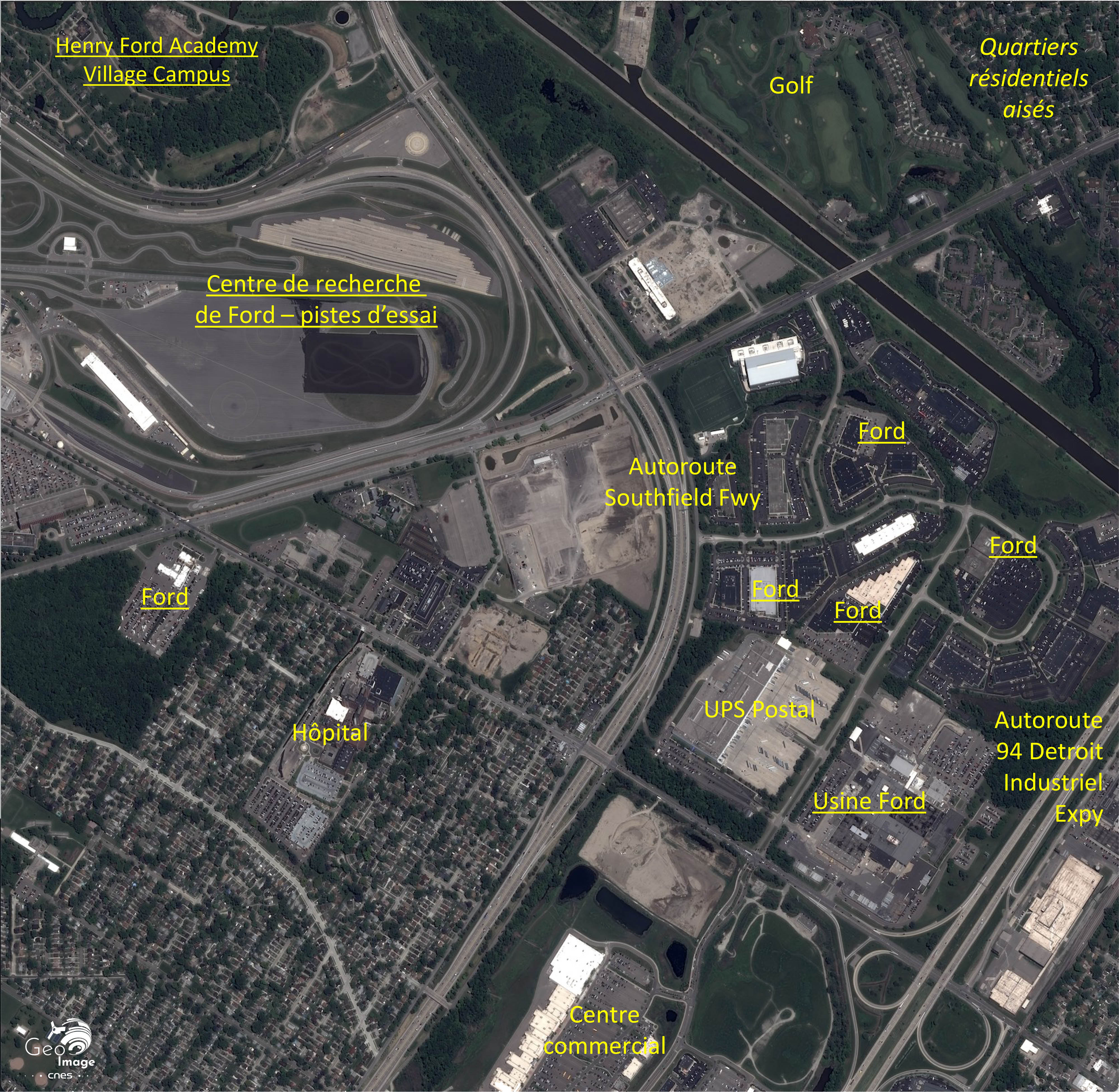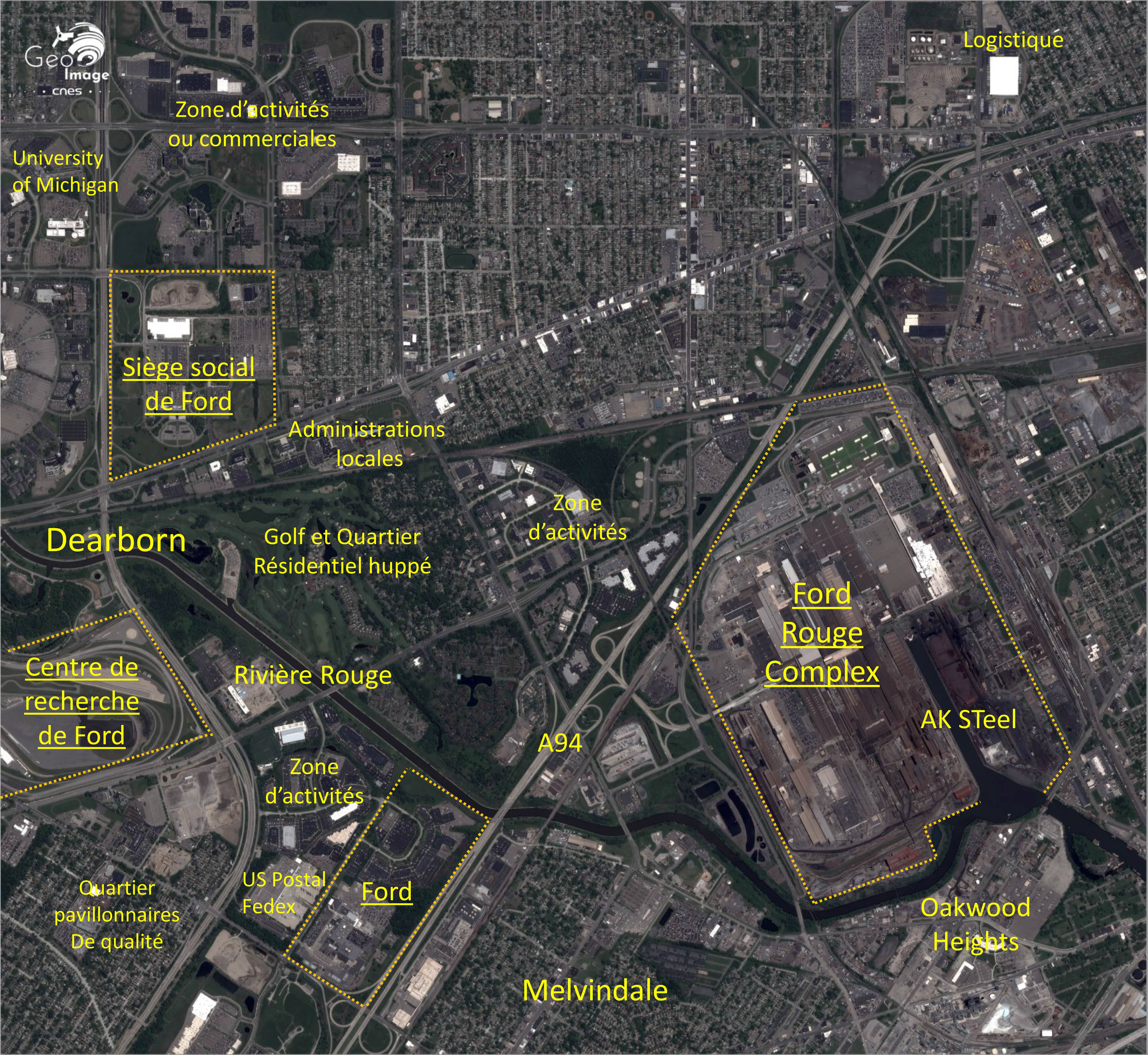 Traversée par la petite Rivière Rouge, fortement aménagée, et par la A94, cette image couvre l’ouest de Détroit et une partie de la commune de Dearborn. Nous sommes ici dans le royaume historique de la firme automobile Ford. Dans le comté de Wayne, Ford emploie aujourd’hui 40 500 salariés, contre 33 000 en 2010 ; il y est de très loin le 1er employeur et le premier contribuable. A lui seul, ce fief territorial - intégré dans l’aire urbaine de Détroit, mais largement autonome - est emblématique de la « Motor City » que fut et reste Détroit. Sur cette seule image, Ford emploie 23 000 salariés dans sept sites principaux et dans une multitude d’annexes répartis dans les différentes zones d’activités.