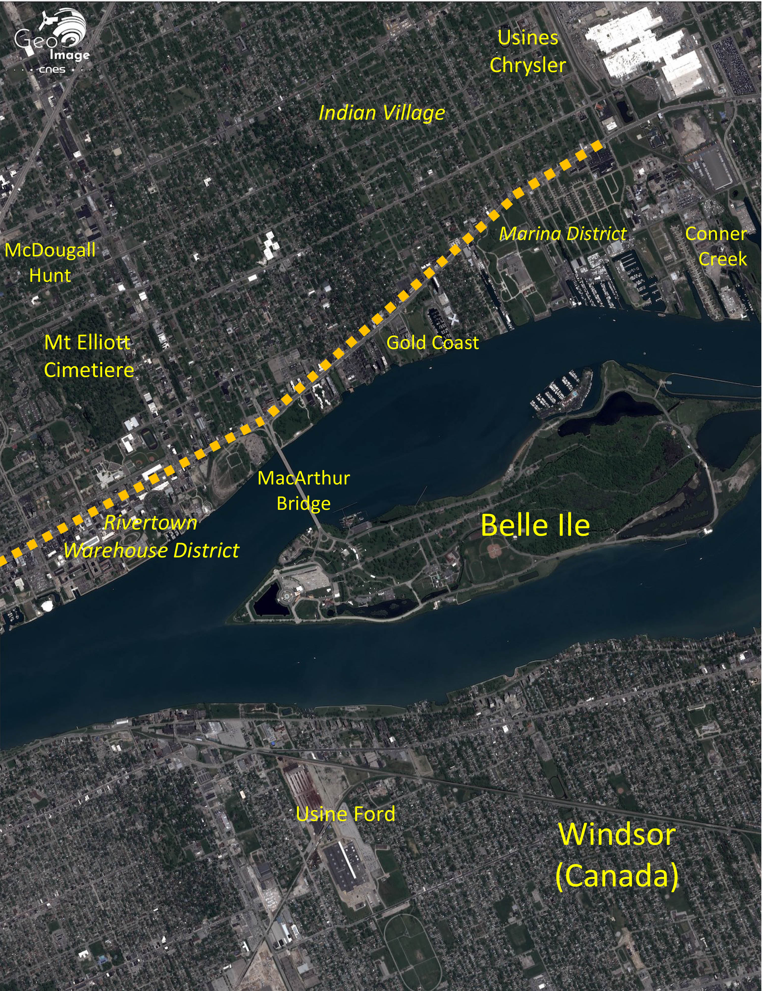 Cette image couvre l’est de Détroit et l’East Riverfront qui fait face à Belle Ile, transformée en zone de récréation. Au nord de Conner Creek se trouve une des dernières grandes usines de montage automobile de la commune de Détroit qui appartient au groupe Chrysler/Stellantis.