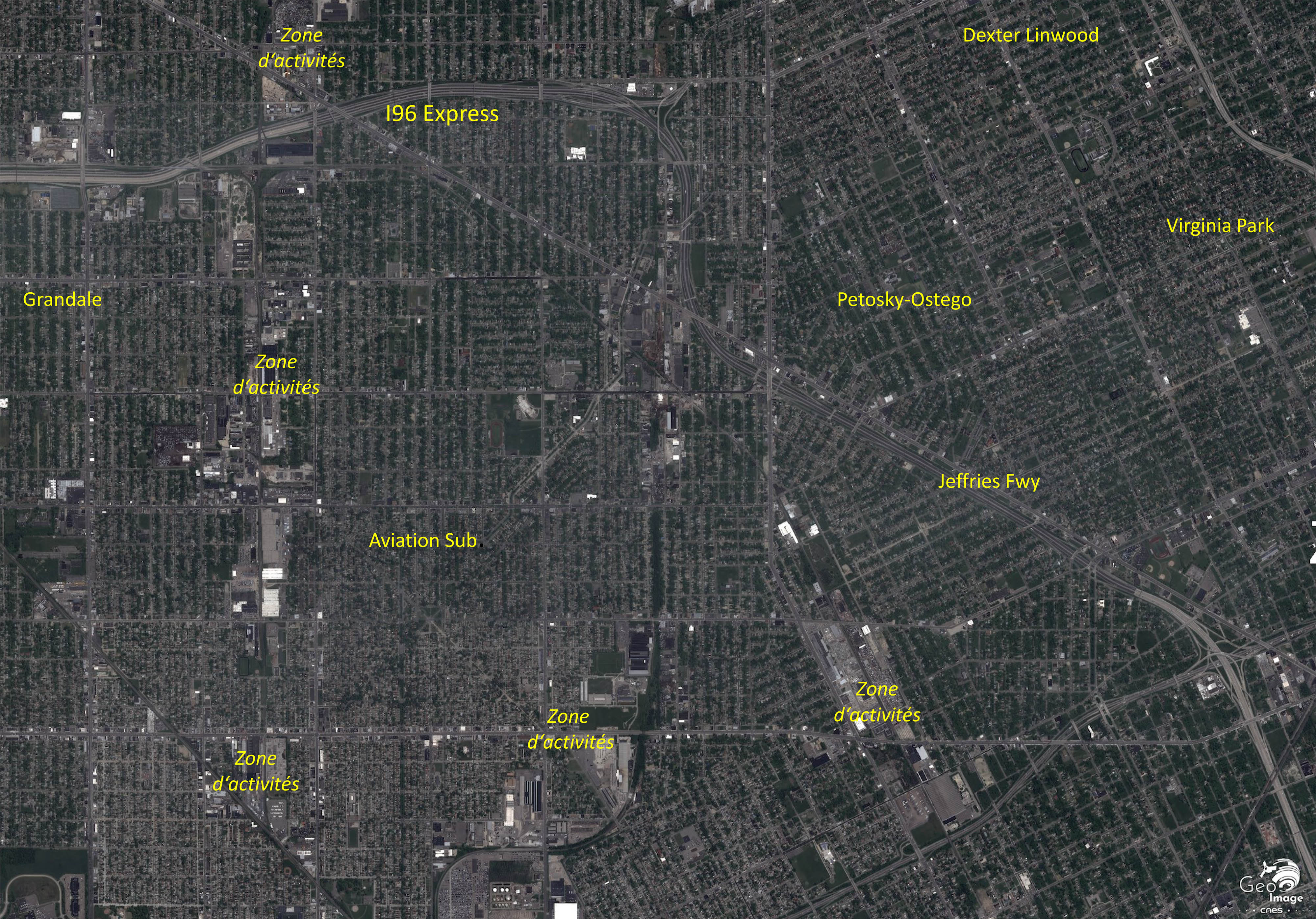 Cette image couvre le nord-ouest de la ville de Détroit. L’espace est traversé par une série de grandes voies autoroutières comme l’I96 Express ou la Jeffries FWY dont les liens donnent lieu à d’immenses échangeurs. Certains axes polarisent les zones d’activités et les zones commerciales.
