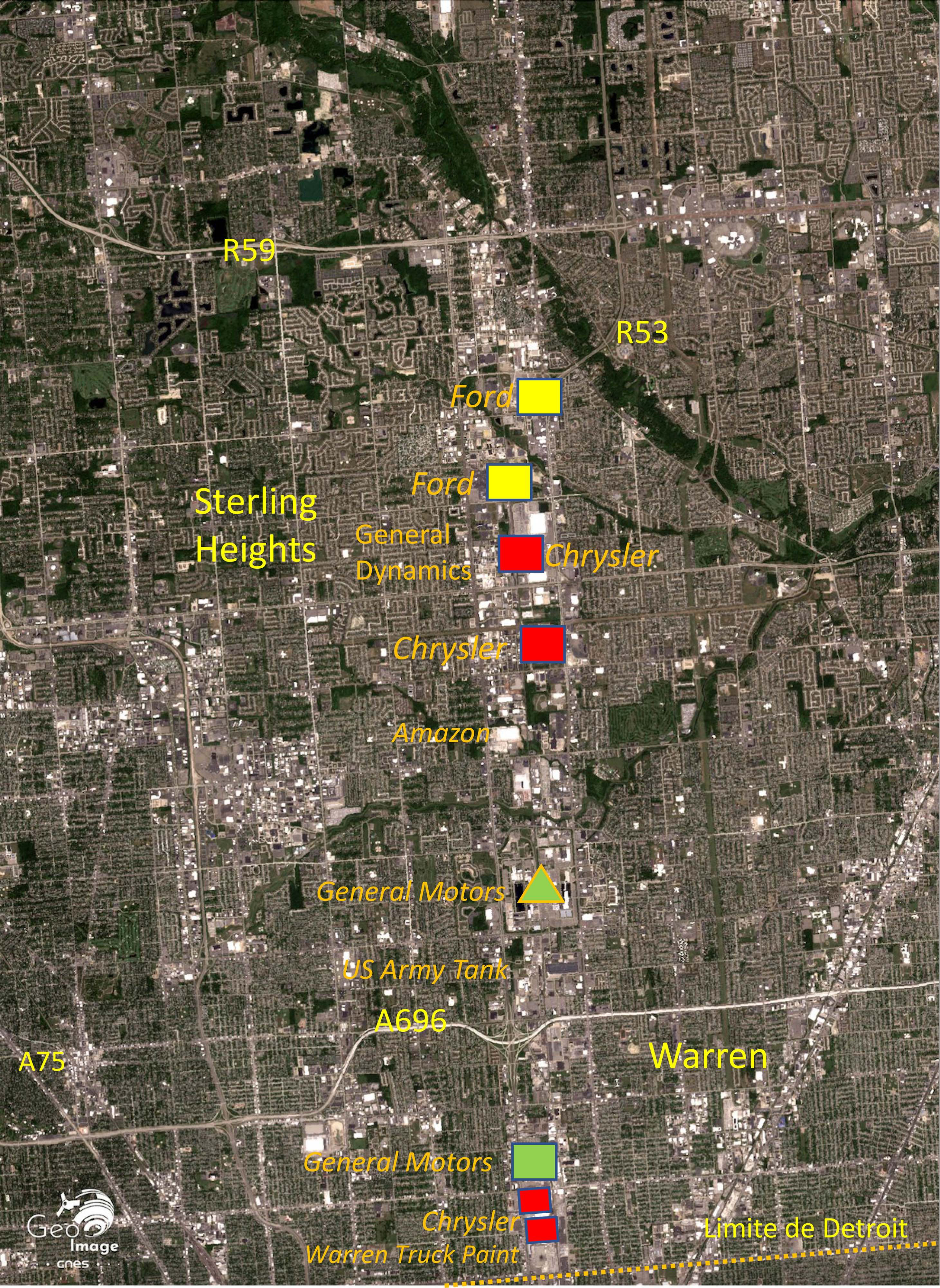 Juste au nord de Détroit, un grand axe nord/sud de 15 km bien visible sur l’image se déploie sur les communes de Warren et Sterling Heights, situées dans le comté de Macomb. Il polarise huit sites automobiles majeurs de Chrysler (4), General Motors (2) et Ford (2). Avec ses 41 000 salariés, c’est le premier pôle automobile de l’aire métropolitaine avec des usines de mécanique fournissant les équipements de base et deux usines de montage.