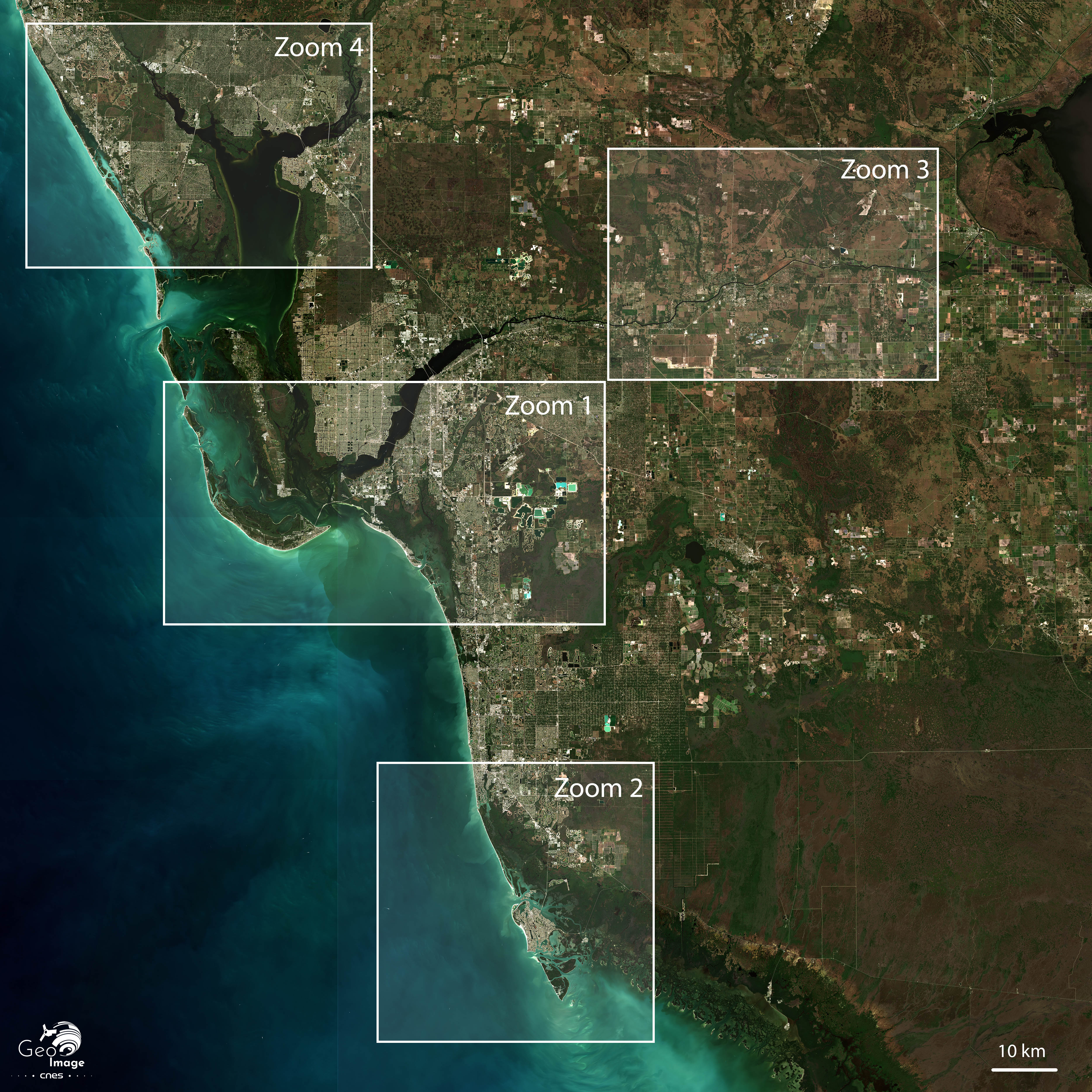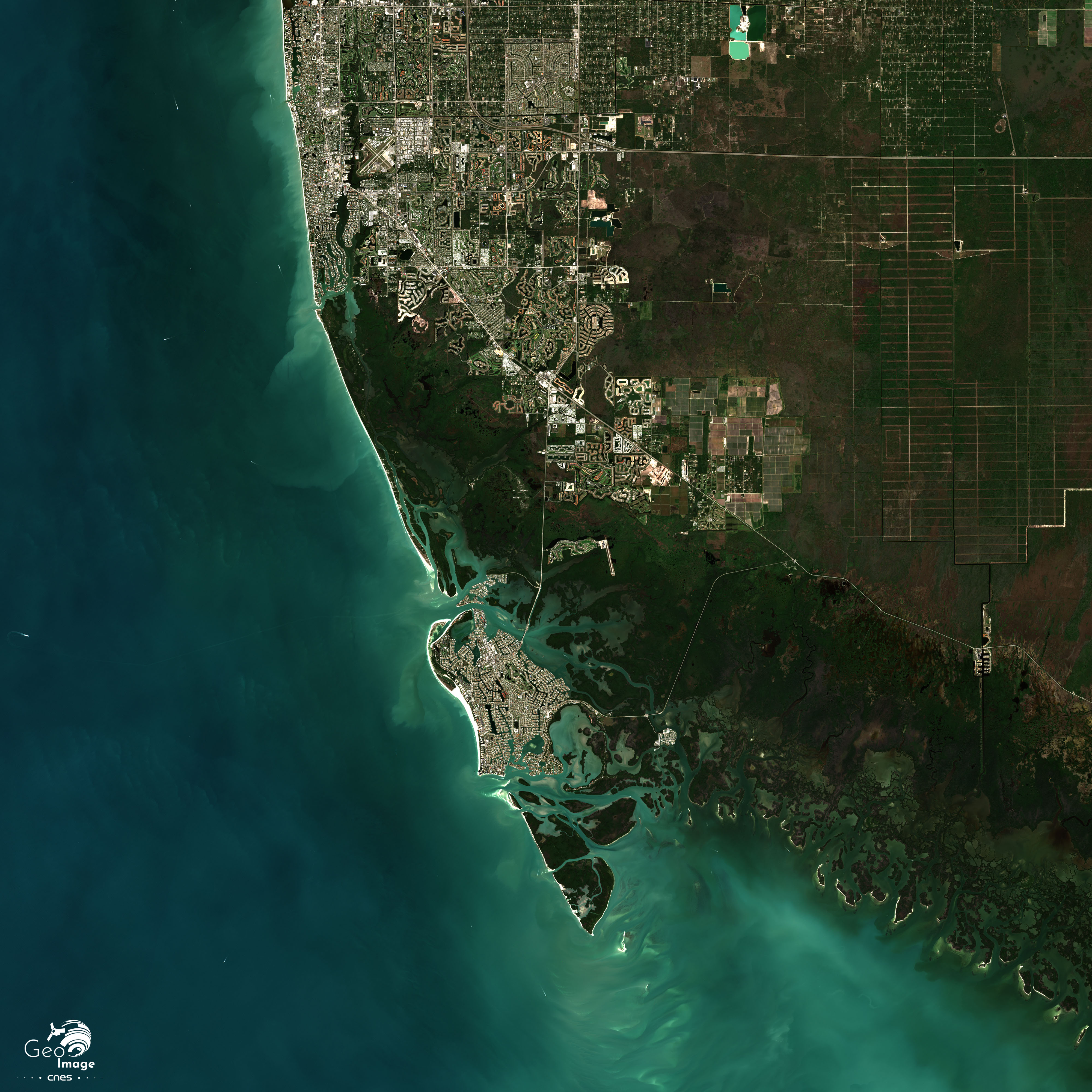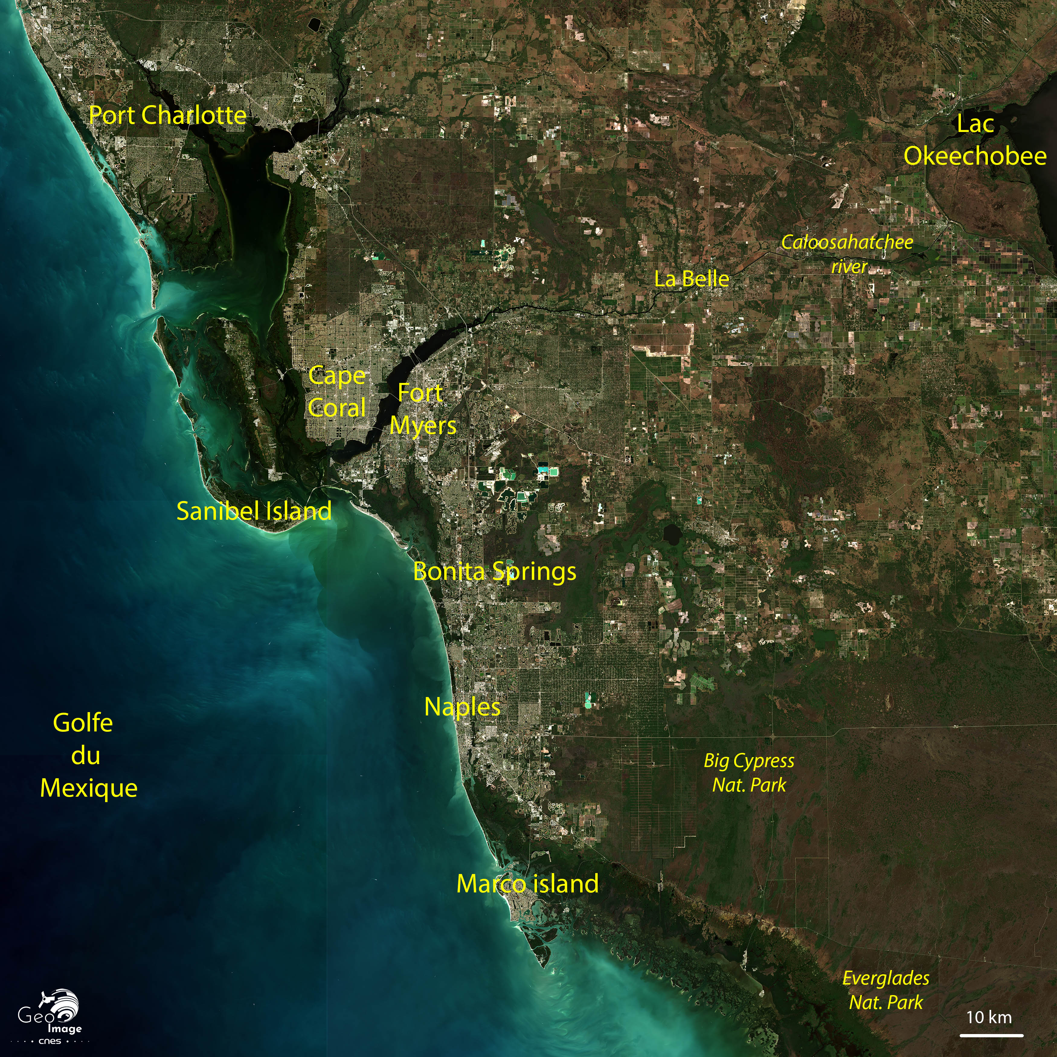 La photographie satellite couvre le littoral sud-ouest de la Floride. Bordée par le golfe du Mexique, l’image s’étend du Parc National des Everglades au sud jusqu’à Port Charlotte et l’embouchure de la Peace River au nord en direction de la métropole de Tampa - St Petersburg. Hormis le lac Okeechobee au nord-est, c’est une diagonale littorale qui s’étire sur 160 kilomètres entre Everglades City au sud et le Comté de Charlotte au Nord.