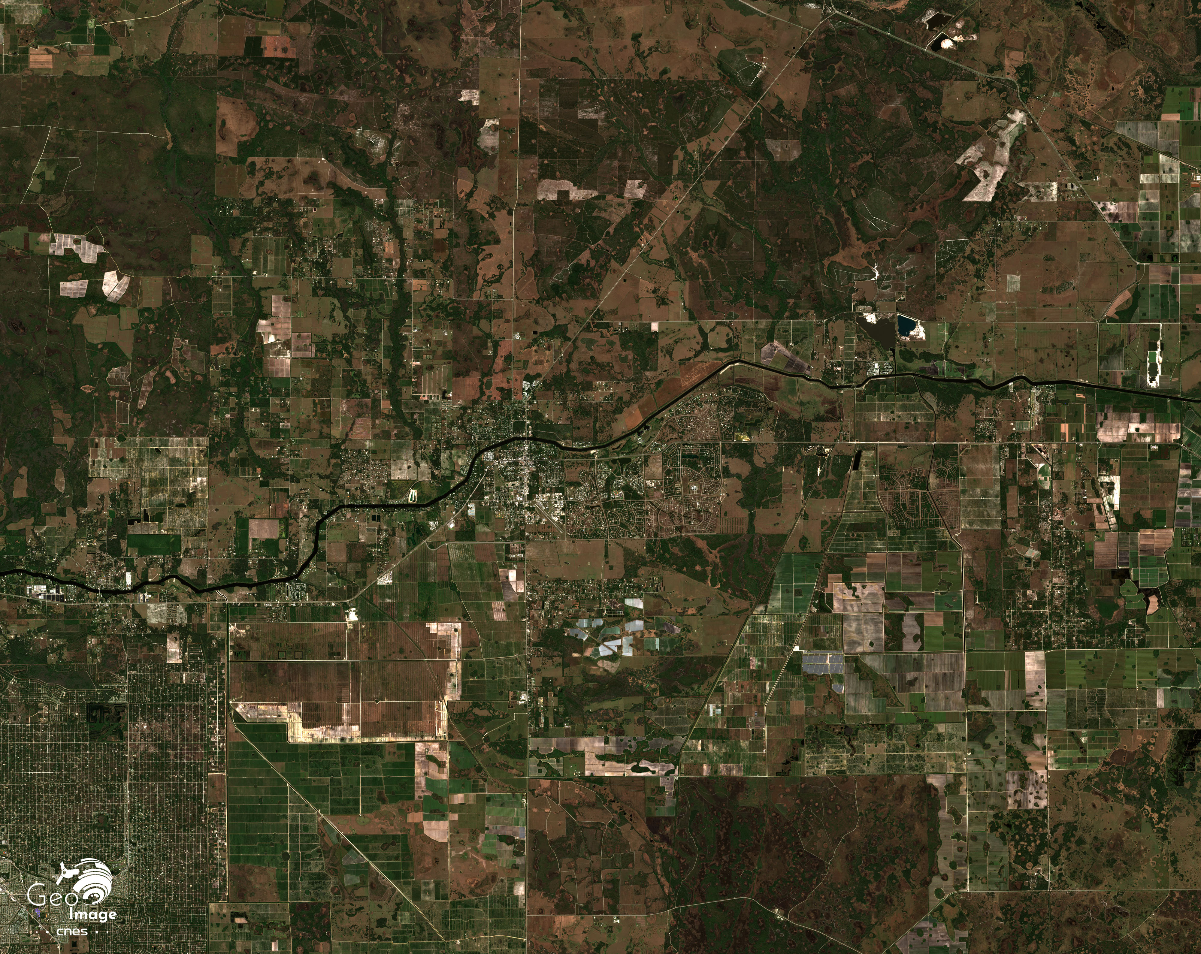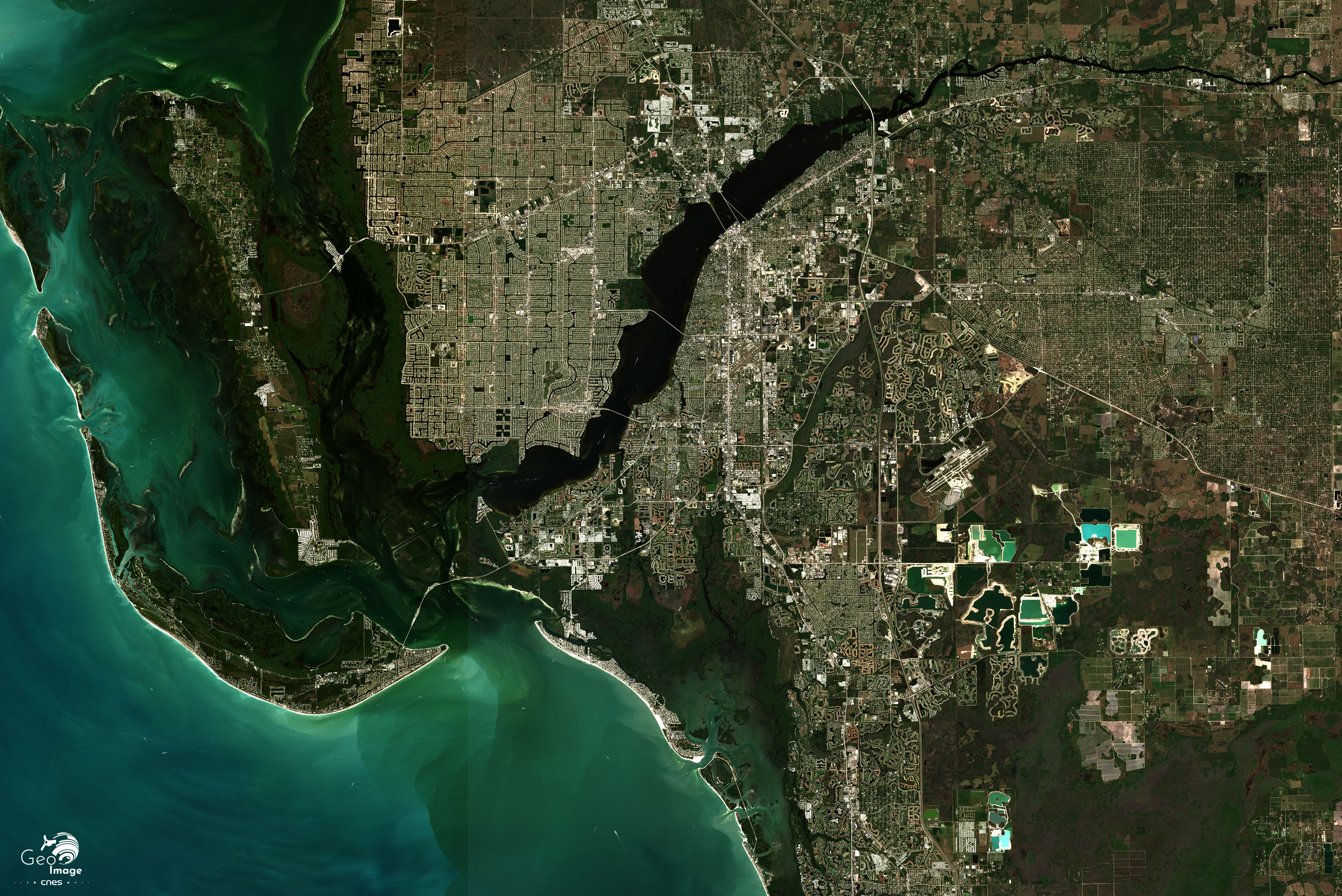 La rivière Caloosahatchee, longue de plus de 100 kilomètres, est aménagée depuis le XIXème siècle, pour permettre l’agriculture et l’irrigation. Reliée par un canal au lac Okeechobee, elle est au cœur d’une région rurale qui prolonge le vaste espace agro-industriel sucrier du centre de la Floride. Sur la photographie satellite, les champs rectangulaires sont visibles à la limite des espaces protégés et surtout le long du fleuve. Mais l’agriculture et l’irrigation sont aujourd’hui nettement concurrencées par l’urbanisation. Le débit du fleuve est de plus en plus réduit tant l’eau est prélevée. Face à une ressource au total limitée, les concurrences fonctionnelles sont ici assez vives.