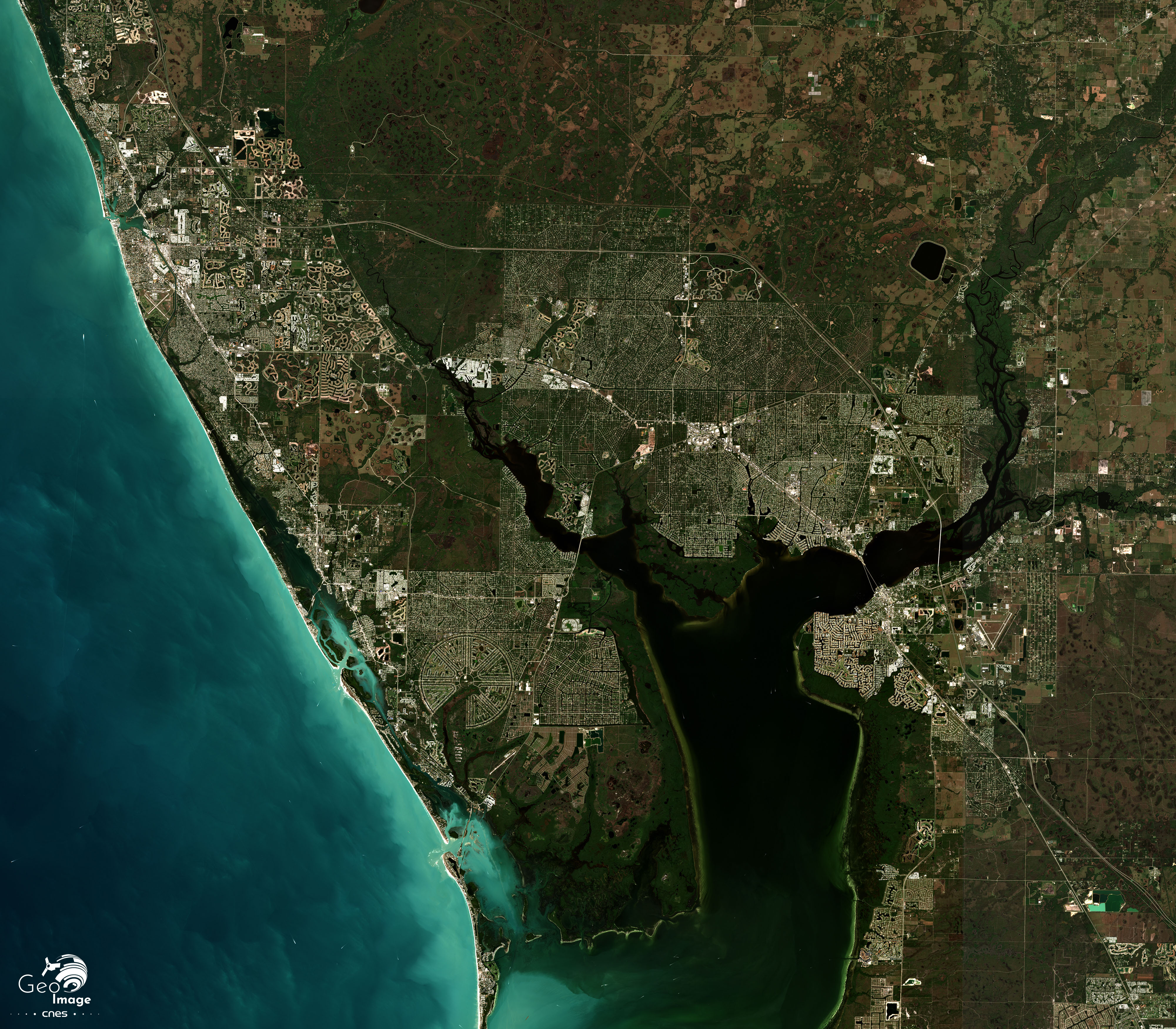 Le littoral, autour d’Estero Island, alterne entre de longues plages de sable et des réserves comme celle de San Carlos Bay – Bunch Beaches Reserve qui protègent les lagunes et les mangroves originelles sur le littoral. Le moindre espace non protégé est conquis par le tourisme comme à Punta Rassa à l’extrémité occidentale de l’image où se situent plusieurs Resorts notamment un très vaste appartenant à la chaîne Mariott. La concurrence entre tourisme et protection de l’environnement est particulièrement forte comme le montre l’occupation quasi-totale du lido insulaire qui tranche nettement avec la lagune et les mangroves.
