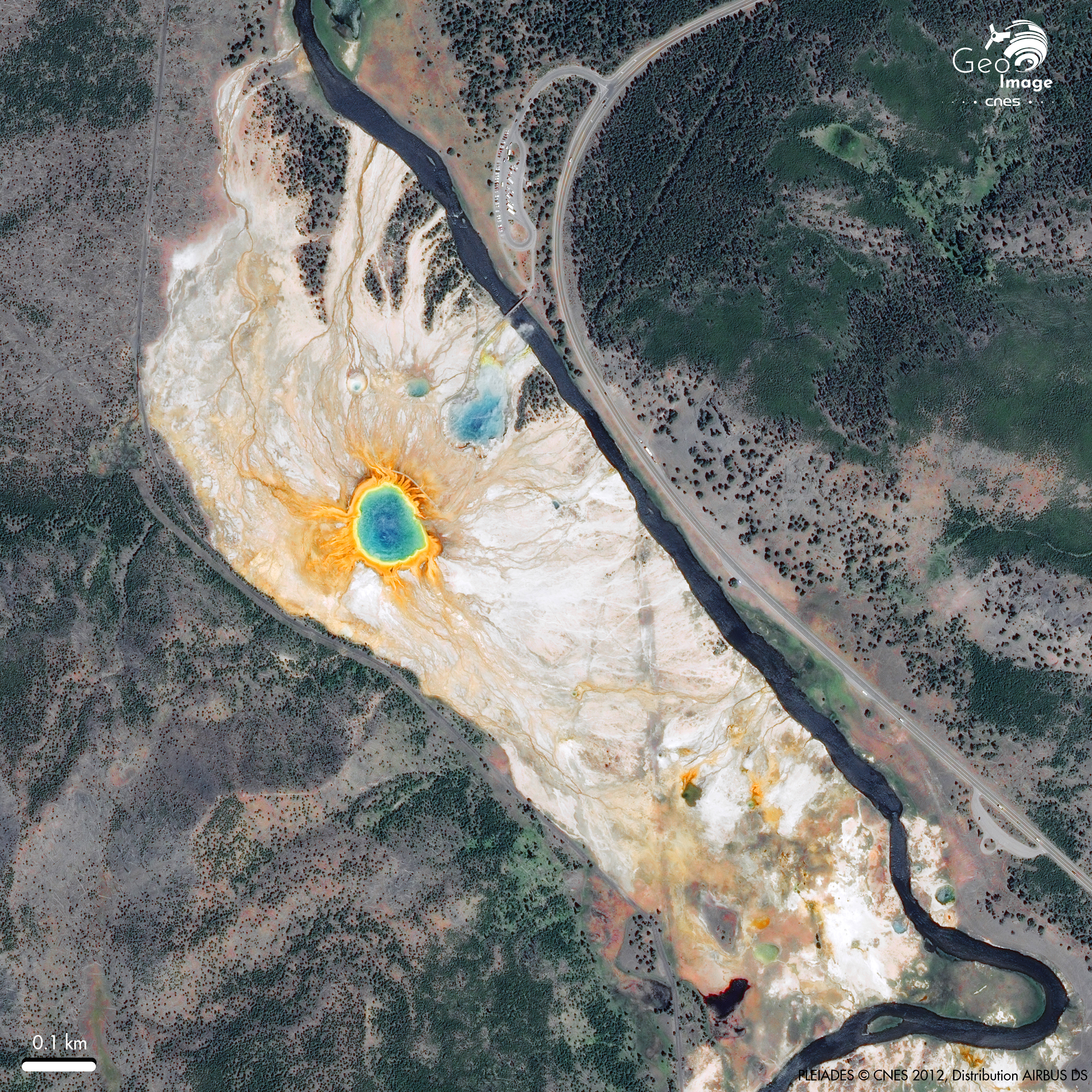 Cette source thermale emblématique est la plus grande des États-Unis et l’une des plus grandes au monde. Elle correspond à une gigantesque source d’eaux chaudes, dont la température peut atteindre 70 °C, fournissant plus de 2 000 litres d’eau par minute. Née dans un cratère géant d’un diamètre de plus de 110 mètres et de 40 mètres de profondeur, elle doit ses couleurs vives à la présence de divers oxydes minéraux ainsi qu’à des colonies d’organismes thermophiles — des bactéries et archées adaptées à ces températures extrêmes — qui colorent les eaux et les bordures de nuances allant du bleu profond au vert, jaune, orange et or.