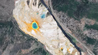Nous sommes ici sur le site du Grand Prismatic Spring, dans le Parc national de Yellowstone, créé dès 1872, situé dans le nord-ouest des États-Unis. Le parc s’étend sur les États fédérés du Wyoming, où se situe cette image, de l’Idaho et du Montana. Du parking, un pont puis un cheminement adapté permettent d’accéder à ce site naturel exceptionnel.
