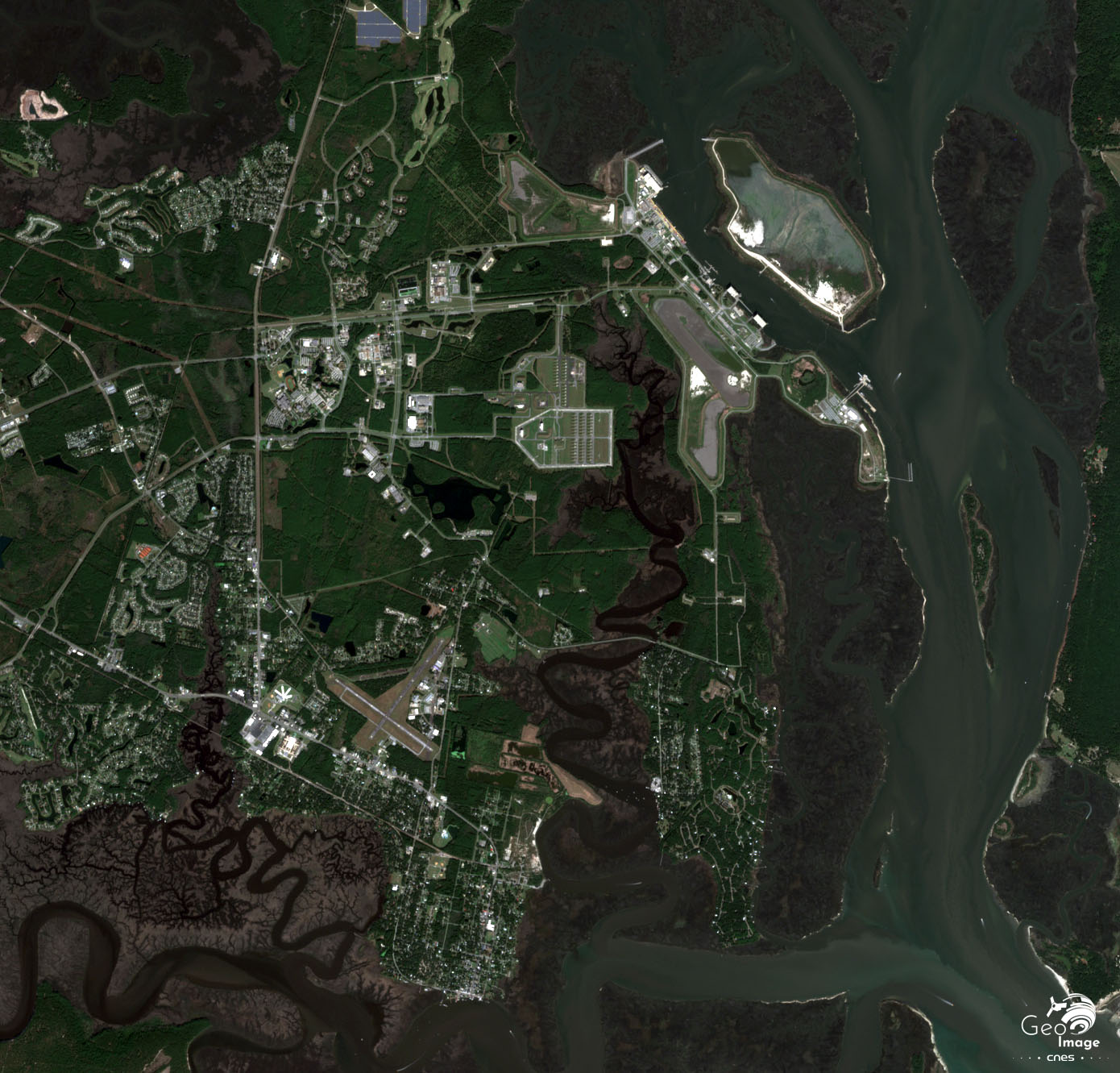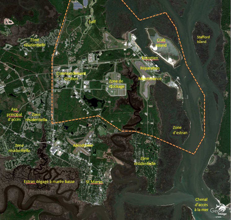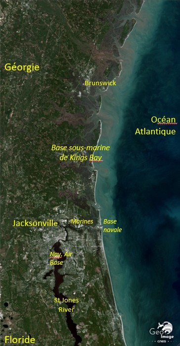 Enfin au centre de l’image se trouve la base sous-marine nucléaire de Kings Bay, bien repérable par ses infrastructures (cf. zoom 1). C’est avec Bangor dans la région de Seattle, au Nord-Ouest des Etats-Unis, l’une des deux bases navales accueillant les sous-marins à propulsion nucléaire équipés de missiles balistiques à têtes nucléaires multiples. Avec 6 SNLE, contre 8 à Bangor, Kings Bay est - pour l’instant du moins, du fait de la montée à terme du potentiel chinois dans l’ile d’Hainan - la seconde base navale au monde par la puissance des armements nucléaires qui y sont stockés et mis en œuvre. A titre de comparaison, la base française de l’Ile longue dans la rade de Brest accueille quatre SNLE.