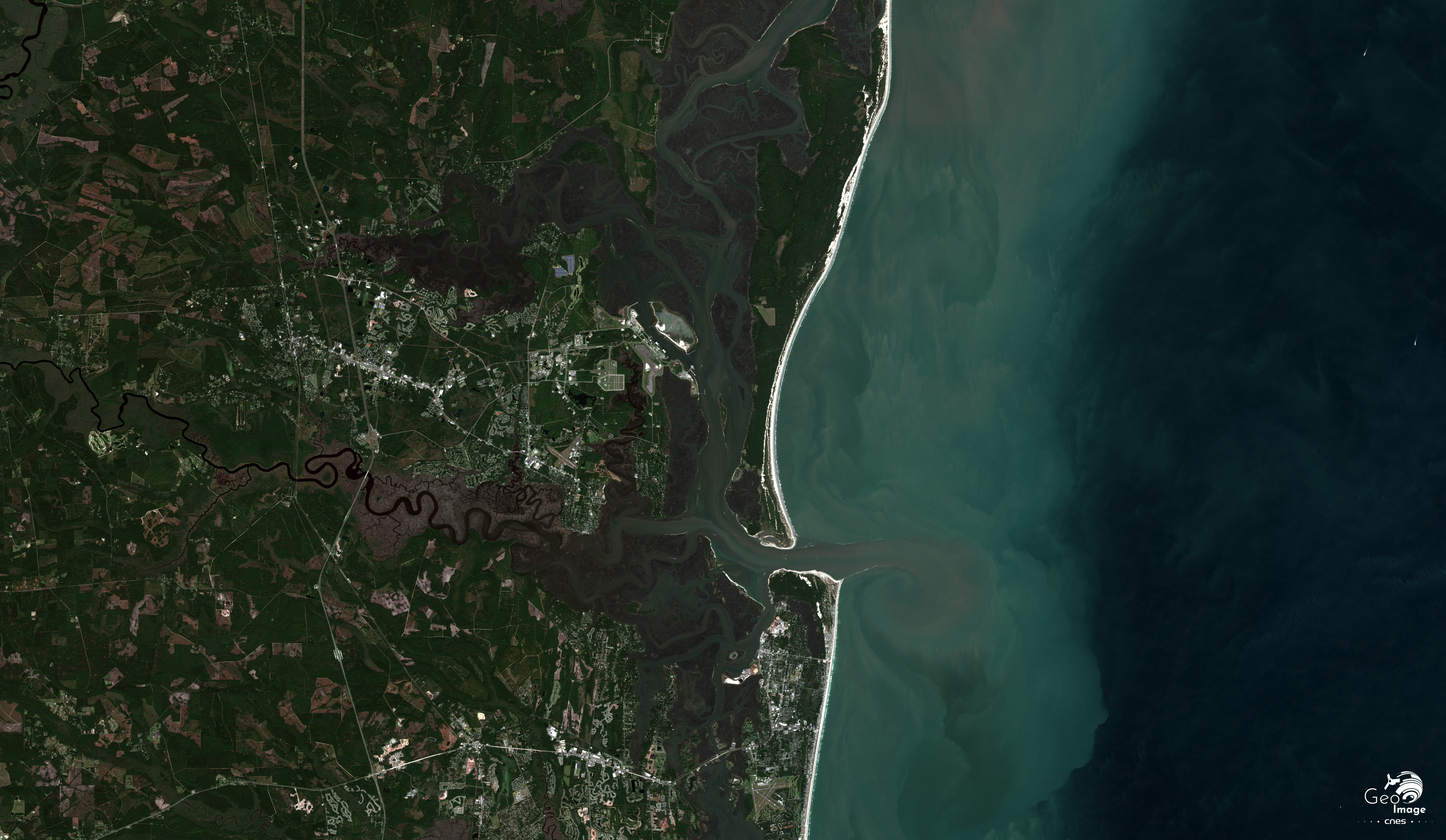 Ces cordons dunaires littoraux isolent donc à l’intérieur une zone amphibie de lagunes, de marais et d’estrans de 5 à 10 km de large, bien identifiable sur l’image. Souvent, les rivières peinent à franchir le cordon littoral, à travers des passes (sound ou entrance) plus ou moins larges et puissantes.