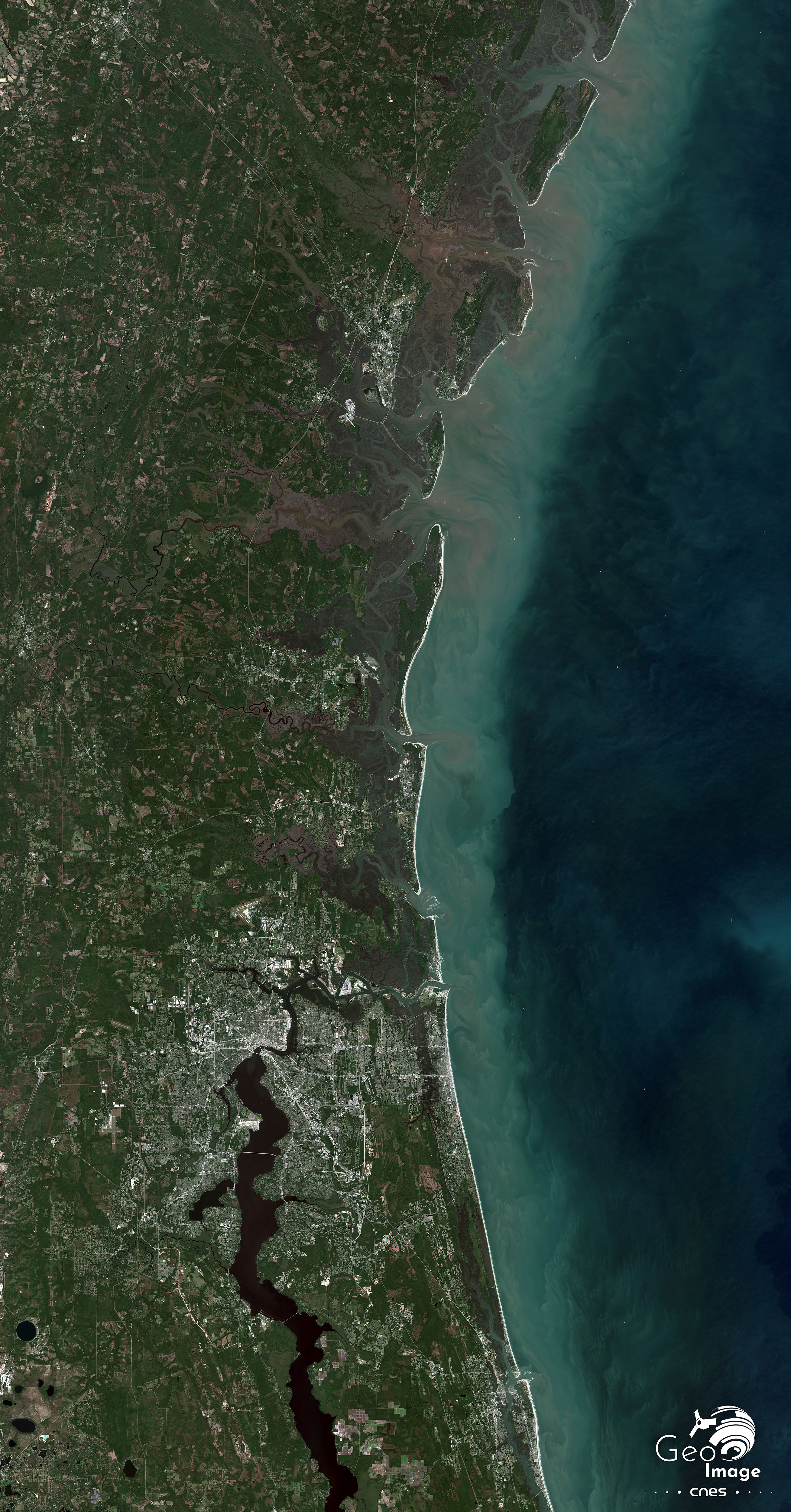 Cette image couvre la région littorale du Sud-Est des Etats-Unis, à la limite entre la Géorgie au nord et la Floride au Sud. On distingue particulièrement bien les dynamiques littorales (charge sédimentaire brune des rivières littorales et de la zone de contact). Au sud, la métropole de Jacksonville est bien visible avec la St Johns River dont on repère bien la masse sombre parallèle vers le sud au rivage. 40 km plus au nord, la base navale sous-marine nucléaire de Kings Bay est elle aussi facilement repérable.