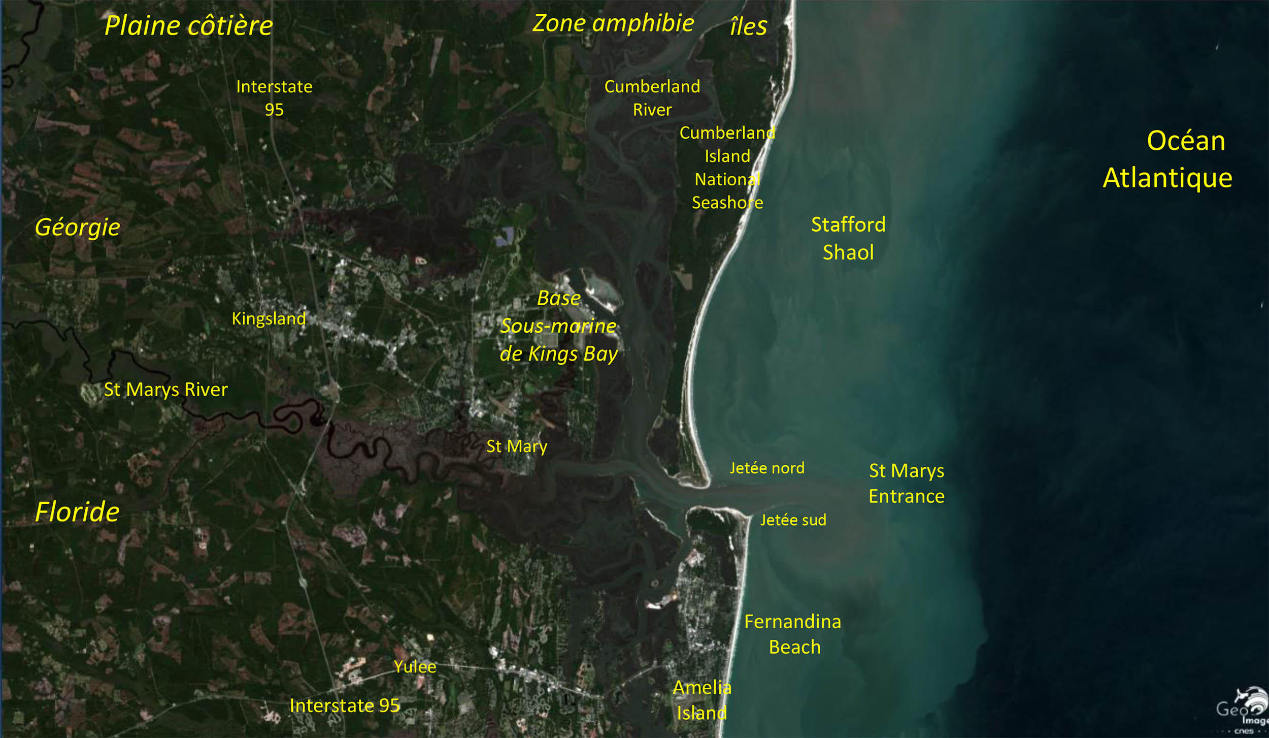 L’image satellite couvre une région littorale organisée par trois ensembles naturels bien identifiables : à l’ouest un ensemble de collines d’altitude moyenne sans grands reliefs et largement boisées. A l’est, au contact de l’océan Atlantique, deux iles très longues mais étroites séparées l’une de l’autre par l’estuaire de la St Marys : Cumberland Island au nord, Amelia Island au sud. Enfin, entre ces deux milieux un vaste système amphibie de criques, de marais et de vasières qui apparaît d’autant mieux que l’image est prise à marée basse et dégage donc un très large estran, terme qui définit l’espace alternativement couvert et découvert par le jeu des marées. Nous sommes ici par 30°48 Nord et 81°31 Ouest dans le Sud-Est des Etats-Unis, la rivière St Marys marquant la limite entre les Etats fédérés de la Géorgie, au nord, et de la Floride, au sud.