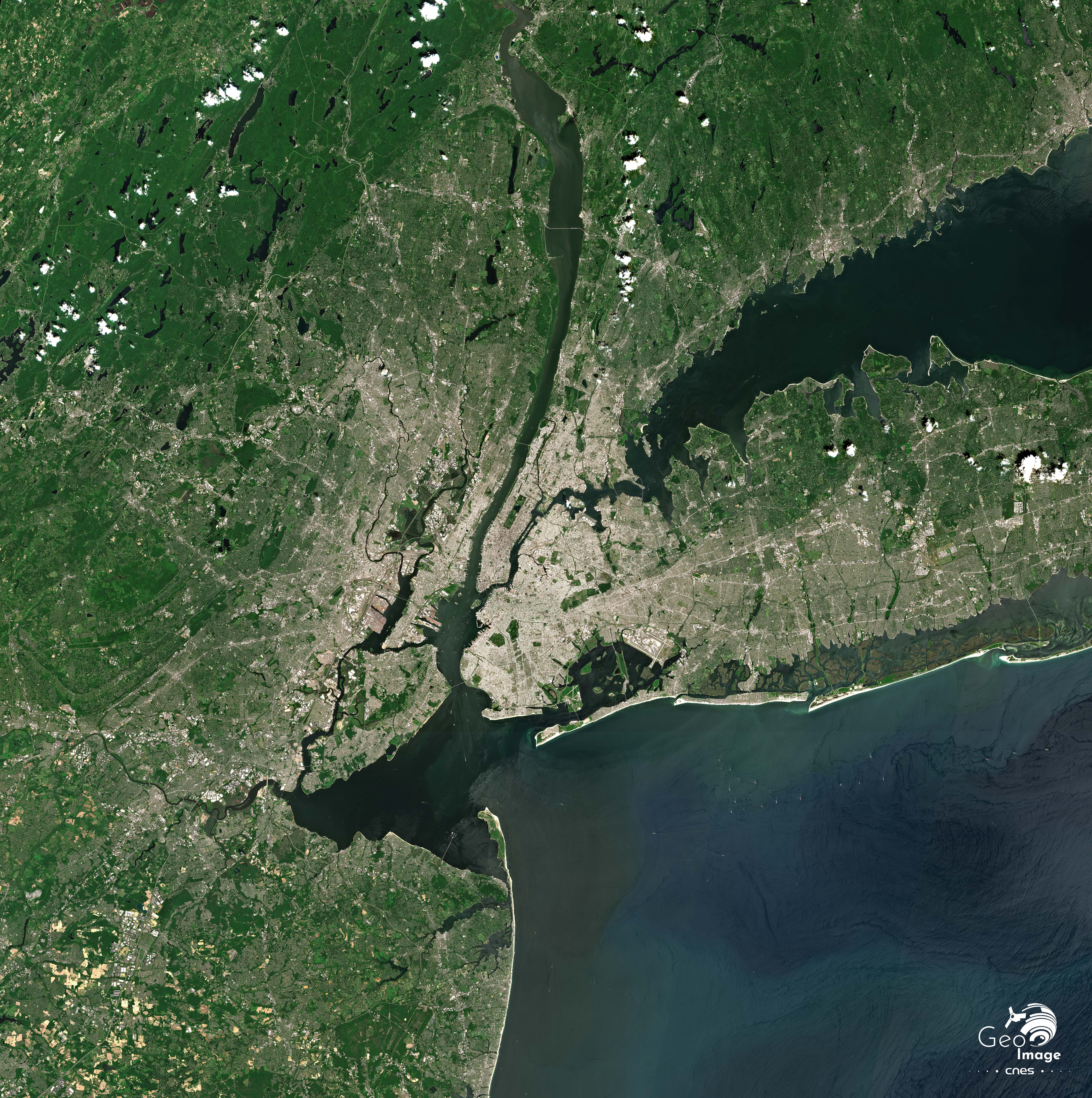 Couvrant l’embouchure du fleuve Hudson sur la Côte Est des États-Unis, l’image englobe ici une superficie de plus de 7.000 km2 sur les 34.494 km2 occupés par le Grand New York. Cette côte basse de 10 mètres d’altitude en moyenne culmine à 125 mètres à Staten Island (Tod Hill). Dans l’angle nord-ouest de l’image, de nombreux lacs sont visibles. Ils parsèment une petite chaîne collinaire à 160 mètres d’altitude, sur le flanc Est des Appalaches du Nord, dans un axe sud-ouest/nord-est entre les villes de Morristown et Mahwah dans le New Jersey. La rive ouest de l’Hudson, au nord de Fort Lee, s’élève doucement vers le nord de 86 à 138 mètres : ce sont les New Jersey Palisades, une ligne de falaises, au fort potentiel touristique et récréatif, recouvertes de forêts, repérables ici à la couleur verte.