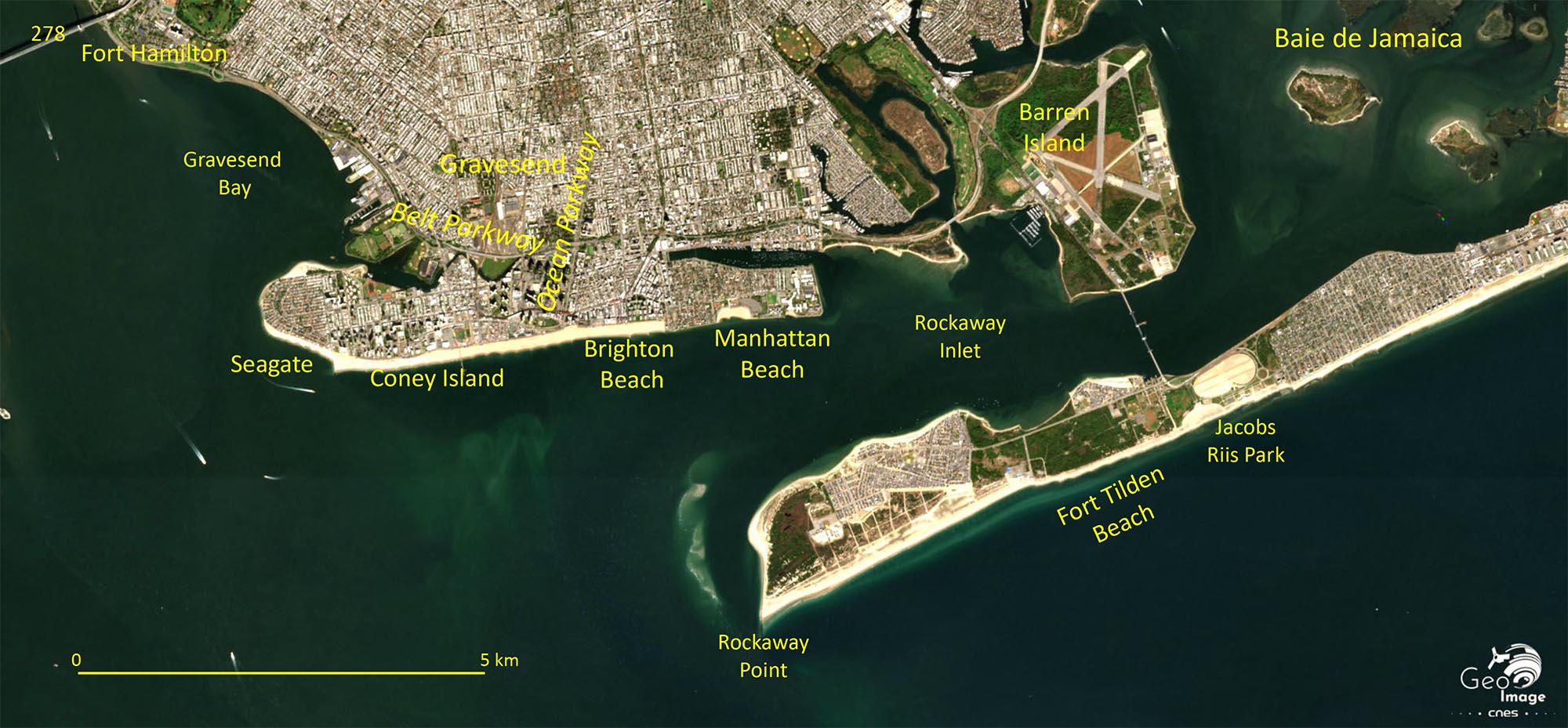 Au sud de Brooklyn, Coney Island - « coney » signifiant lièvre en néerlandais - était jusqu’en 1940 une île de 6,5 km de long sur moins de 1 km de large. A cette date, l’ouverture de la Belt Parkway, bien visible sur l’image, comble le Coney Island Creek, la rattache à Brooklyn et relie Manhattan à Long Island.