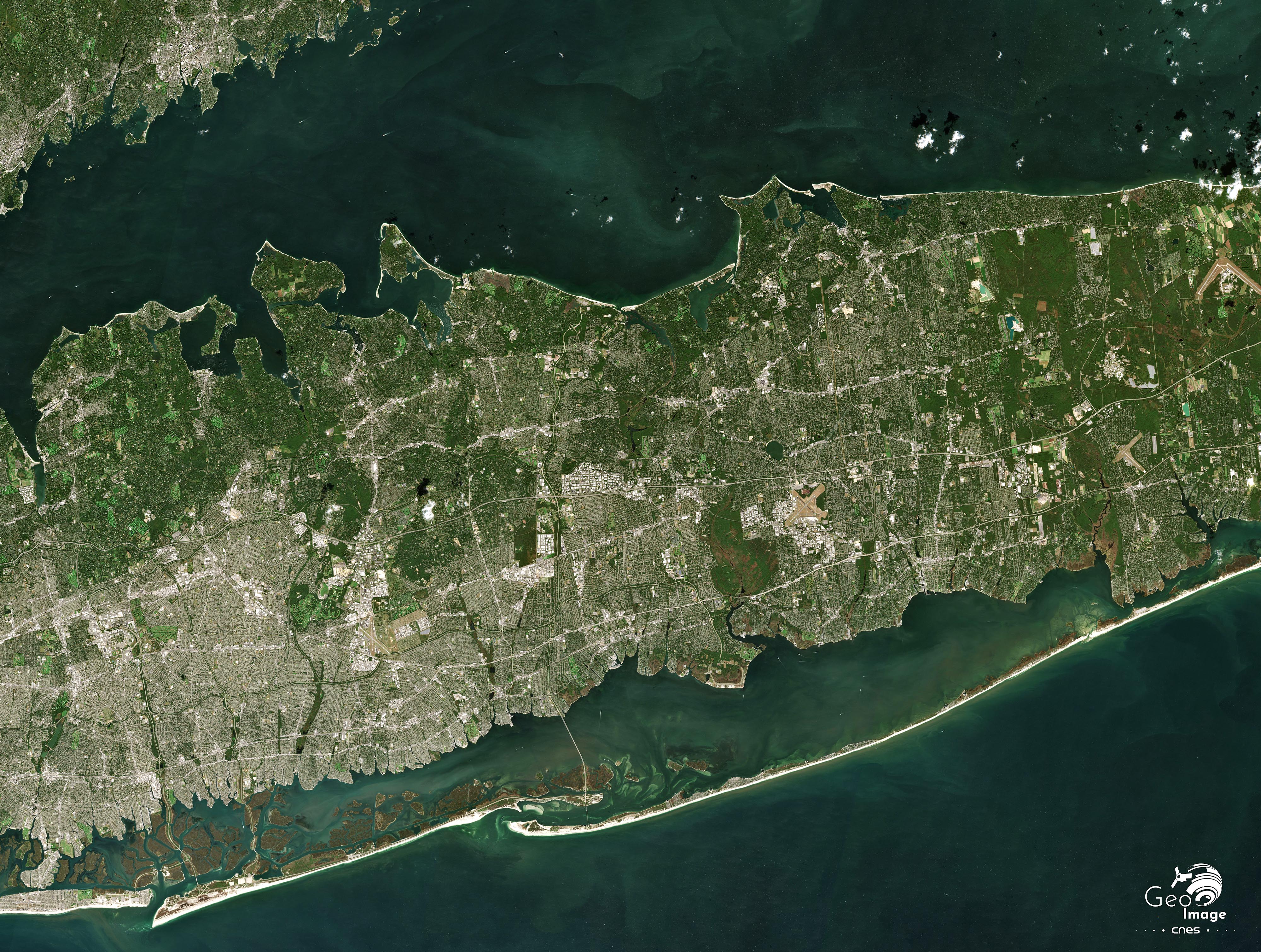Au sud de l’image, les quartiers de Manhattan et du Bronx se détachent nettement. Les plans en damier du réseau viaire sont encore visibles à cette échelle. Sans être absolument réguliers, ils sont ponctués d’espaces verts : golfs et parcs, et restent identitaires de la ville américaine.