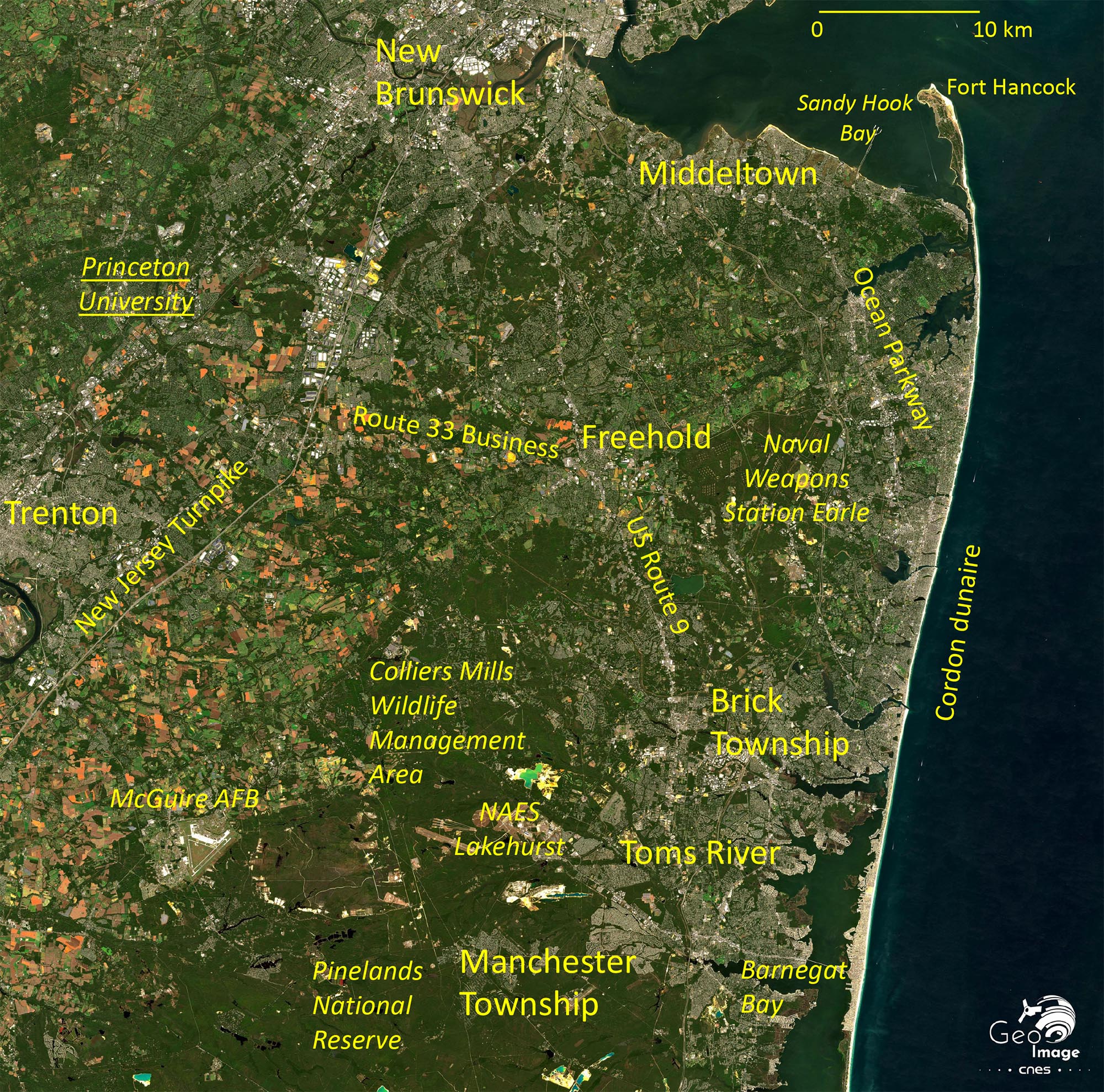 Entre Freehold et la NAES Lakehusrt, l’espace est clairement multifonctionnel. Ainsi, entre Freehold et Brick Township, à l’ouest de l’US Route 9, les formes de peuplement mitent l’espace rural (lotissements, terrains de golfs en vert vif) forestier (en vert foncé), dans un gradient de densités décroissantes d’est en ouest. La Colliers Mills Wildlife Management Area est une zone de gestion de la faune faisant partie de la Pinelands National Reserve, qui occupe toute la partie sud de l’image. Elle a été créée en 1978 et classée réserve de biosphère en 1988. Le bornage de cette réserve est bien visible, mais n’empêche pas les formes de peuplement ponctuelles, strictement délimitées, comme Manchester Township. C’est aussi à la lisière de cette réserve que deux carrières d’extraction de sables, alimentant l’industrie du BTP, sont repérables à partir des lacs ici formés. Nous sommes donc ici dans un espace aux fonctions à la fois environnementales, résidentielles, industrielles et récréatives.