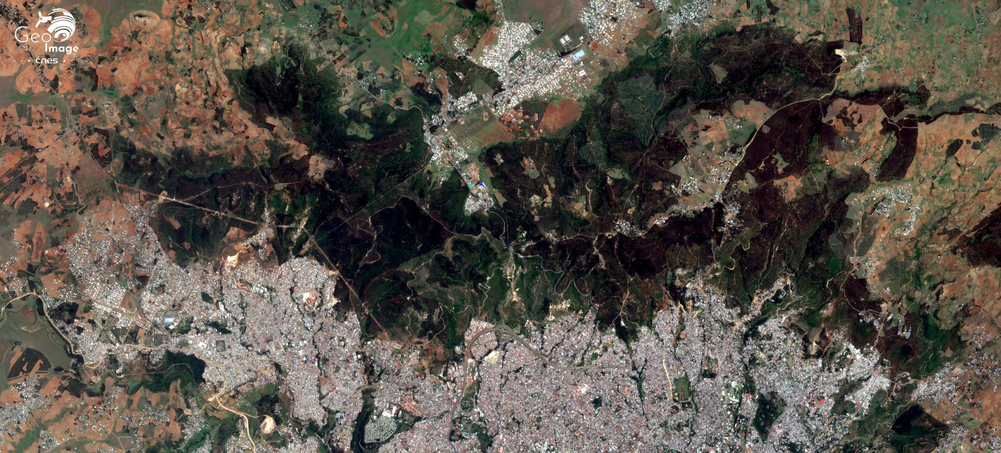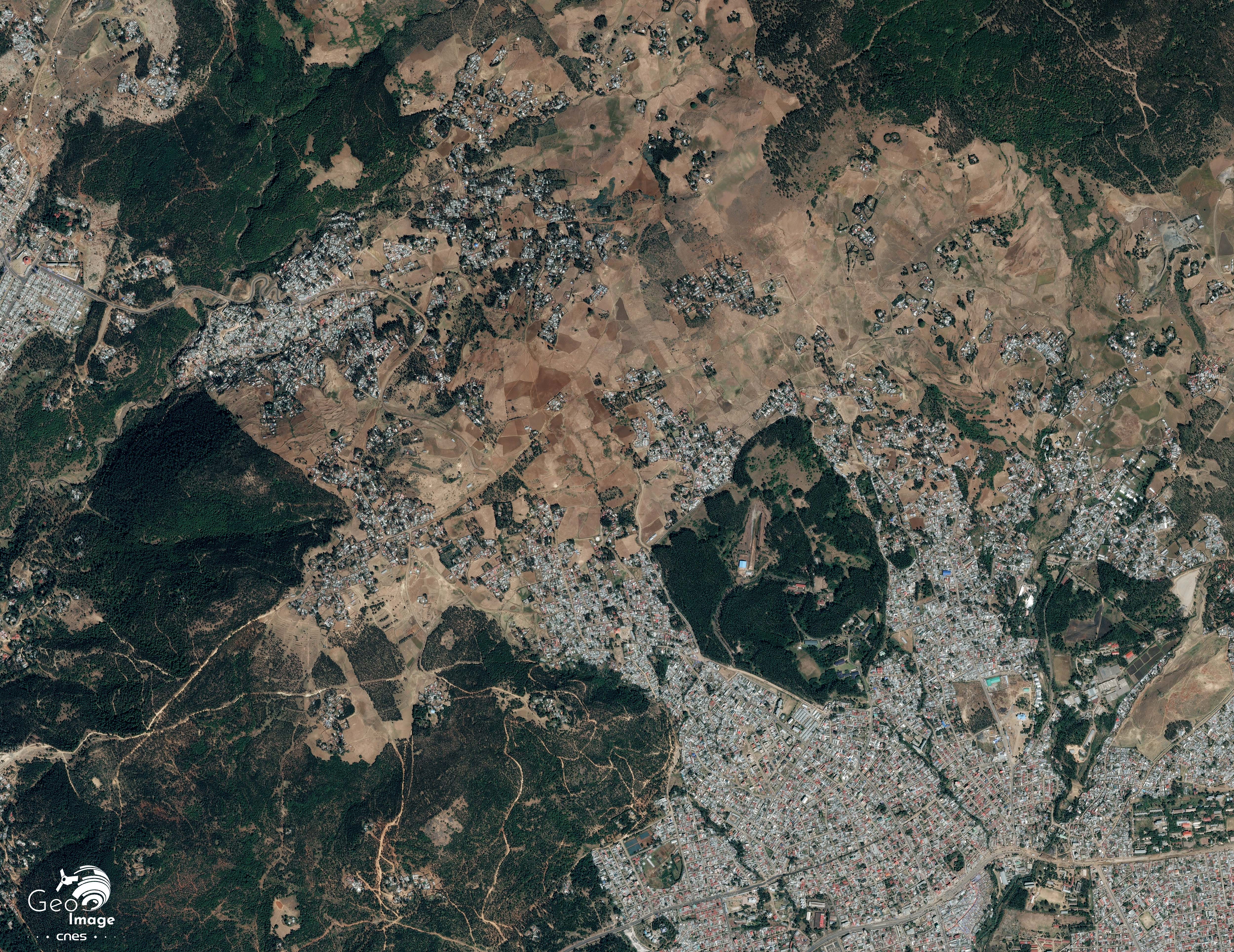 L’agglomération d’Addis Abeba dans son cadre régional des hautes terres bordant la vallée du Grand Rift (image en couleurs naturelles, de résolution native à 10 m prise par le satellite Sentinel-2B).