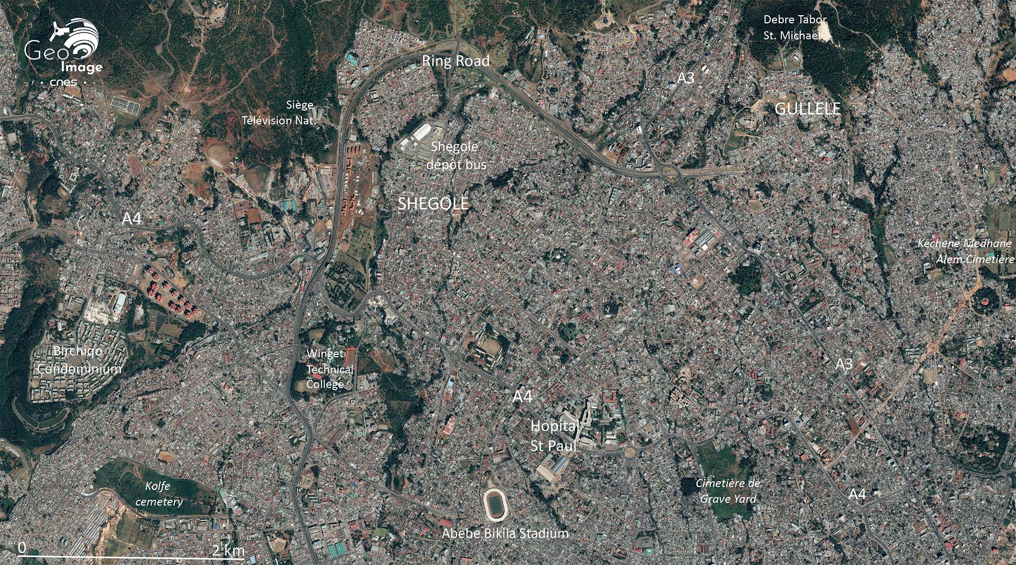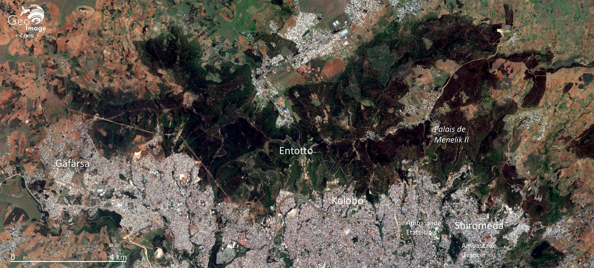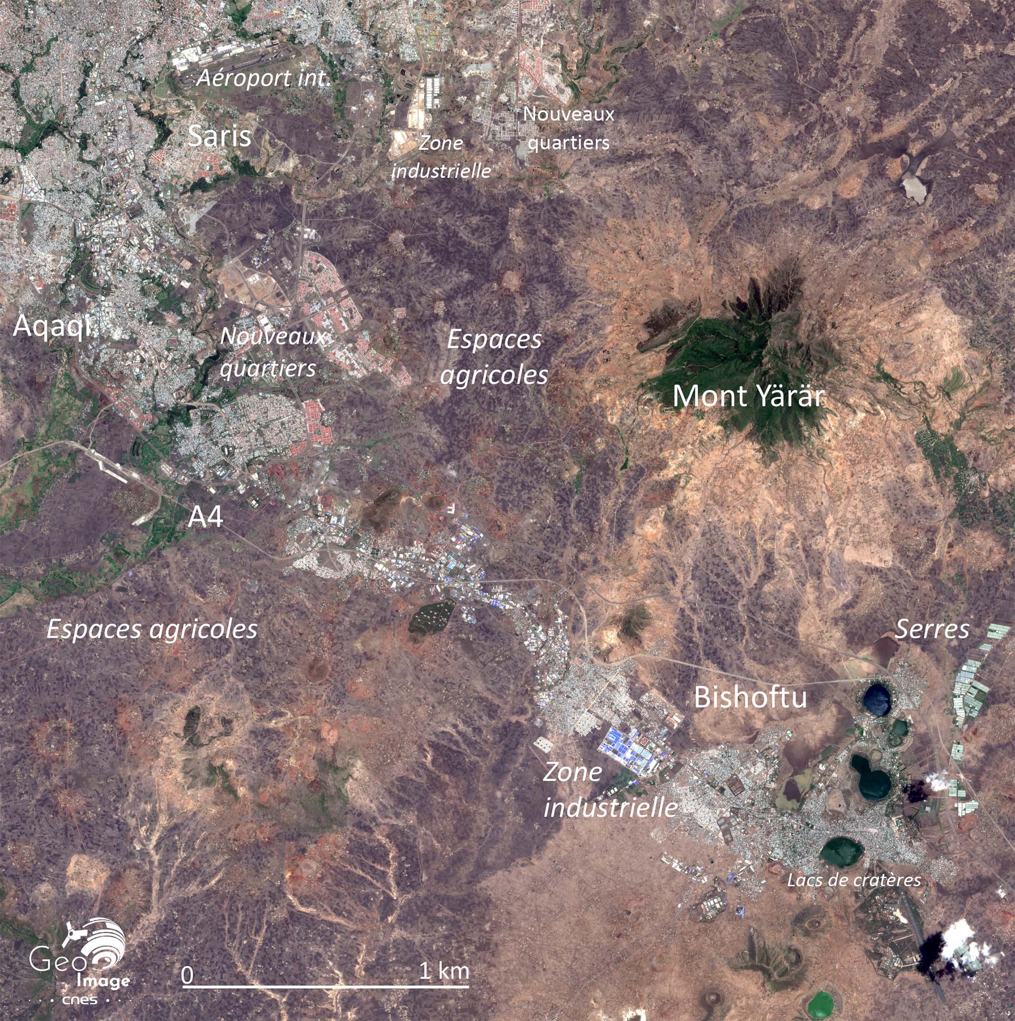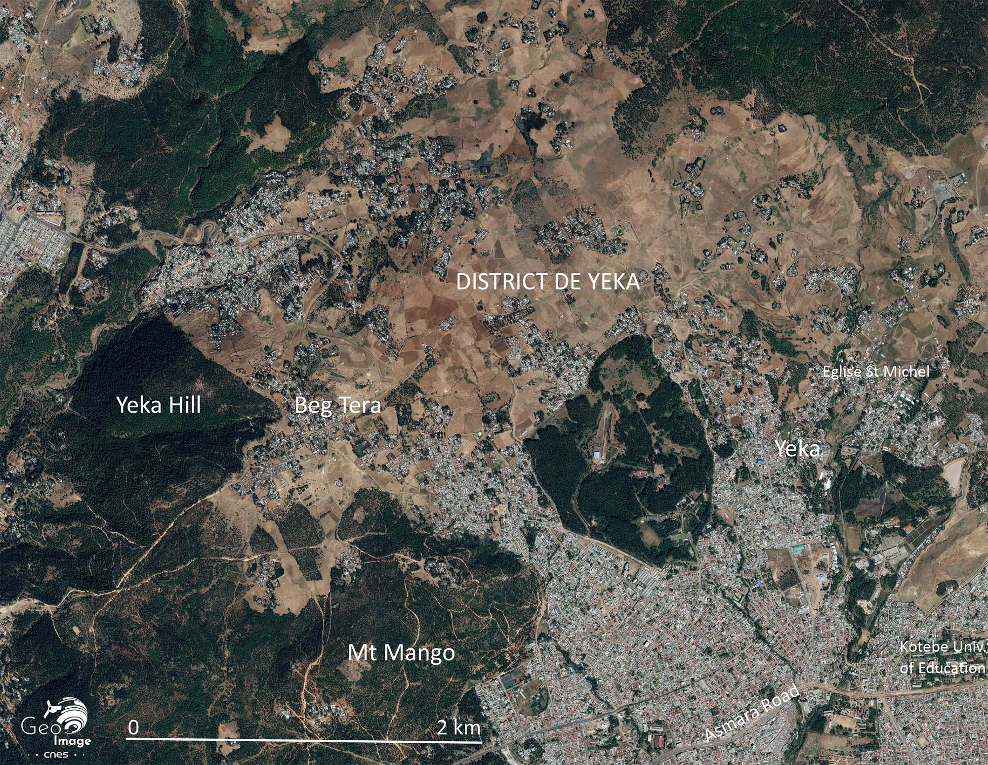 Cette image couvre une partie du district de Yeka qui recoupe le Nord-Est de la ville. Cou-vrant 85,5 km2, il est peuplé de 337 500 habitants, soit une densité de 3 950 hab./km2. Elle témoigne de l’avancée du front urbain qui gagne progressivement tout l’espace rural et agri-cole par mitage progressif des terroirs de Beg Tera ou Yeka.