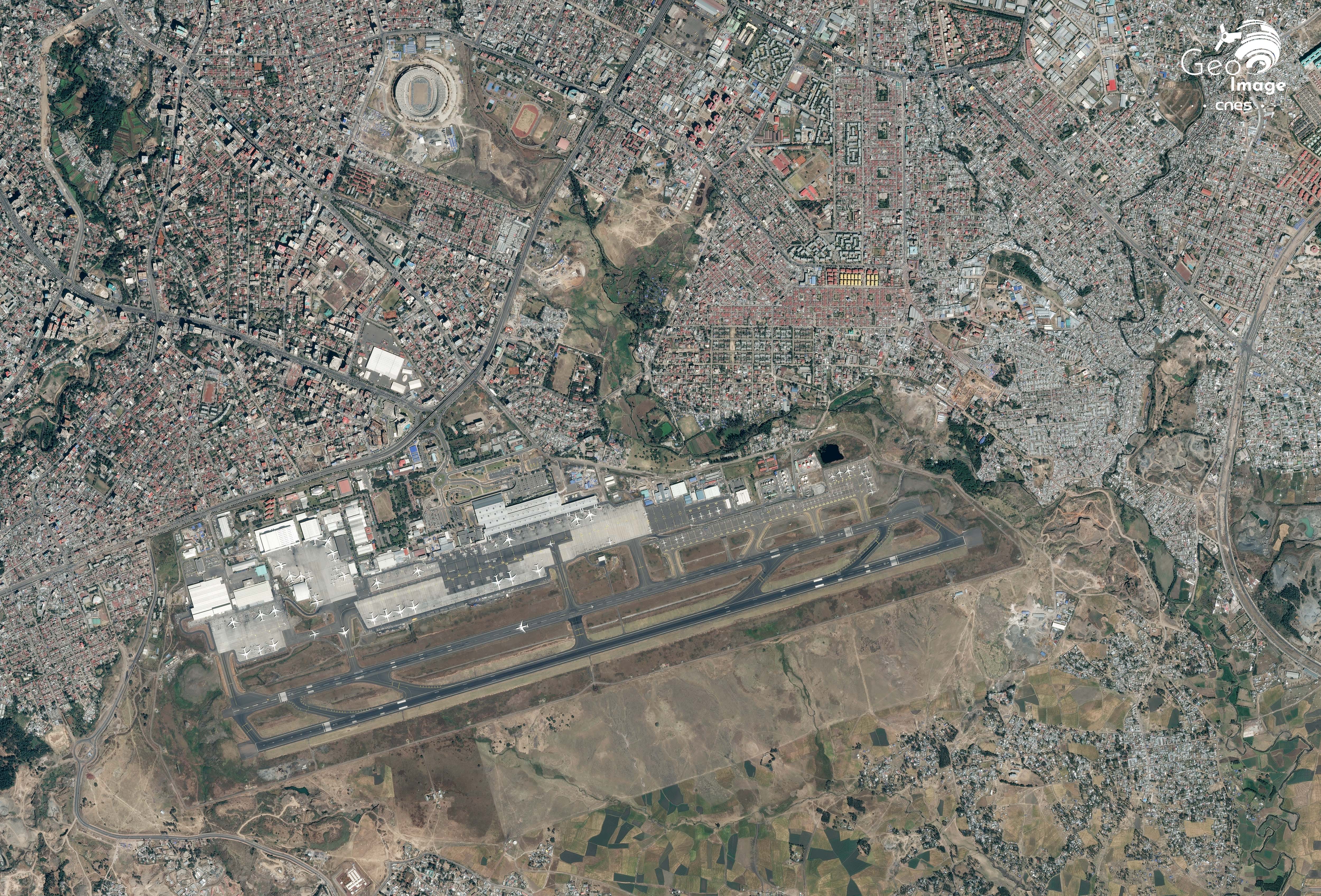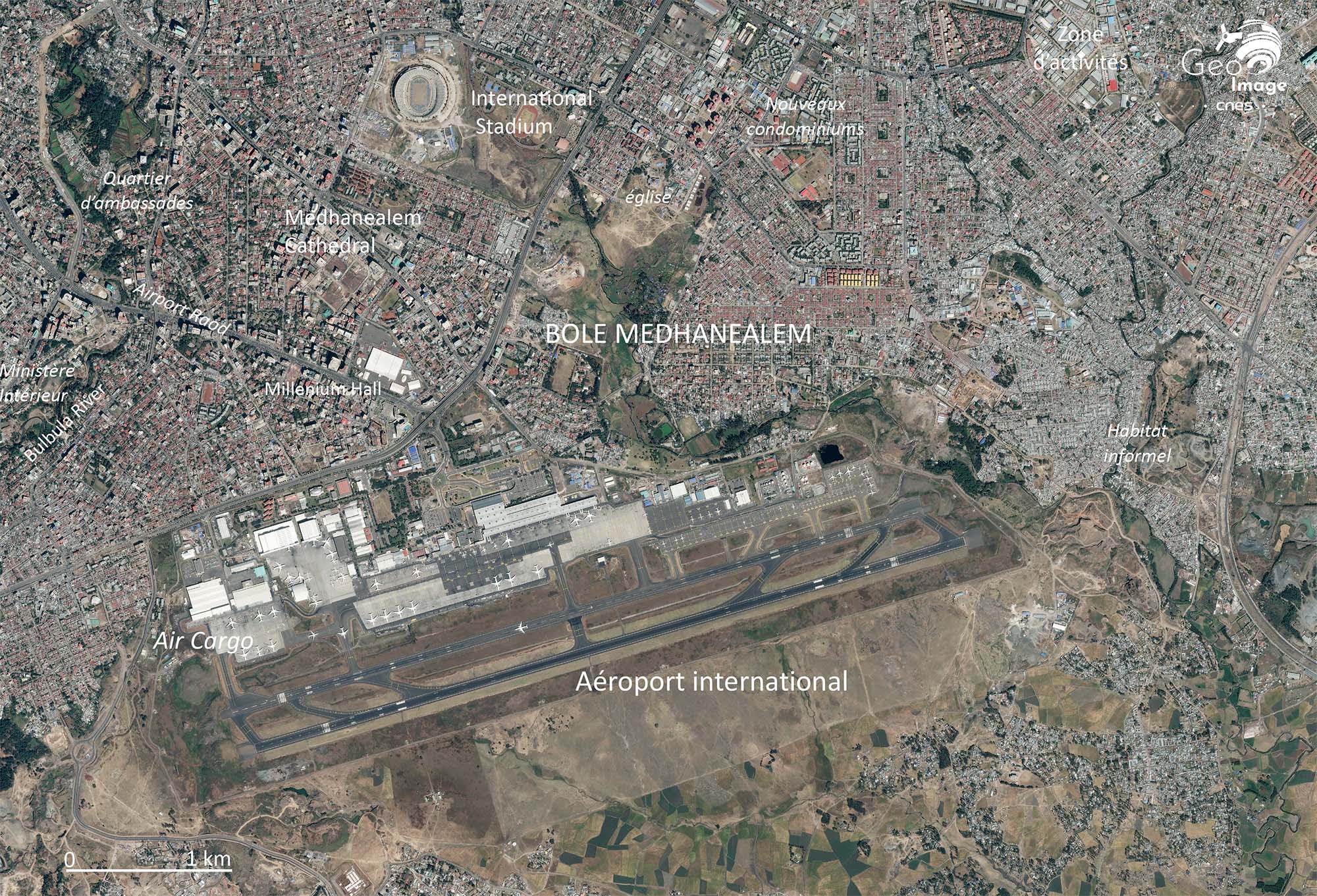 Situé au sud-est de la ville, le district de Bole couvre 122 km2 et est peuplé de 330 000 habi-tants. Sur l’image il est structuré par l’aéroport international qui se trouve à 2334 m. d’altitude. Principal hub de la compagnie Ethiopian Airlines, c’est l’un des grands pôles aéroportuaires du continent africain. Ouvert en 1962 au détriment de celui de Lidetta dont les pistes s’avéraient trop courtes, il a connu une succession d’agrandissements (nouveaux terminaux, tout de con-trôle, parkings...) en 1997, 2003, 2012 et 2019. En 2006, un nouveau terminal pour les avions de fret aérien est ouvert en lien avec l’ouverture du pays et son insertion croissance dans la mondialisation (cf. exportations de fleurs coupées...).