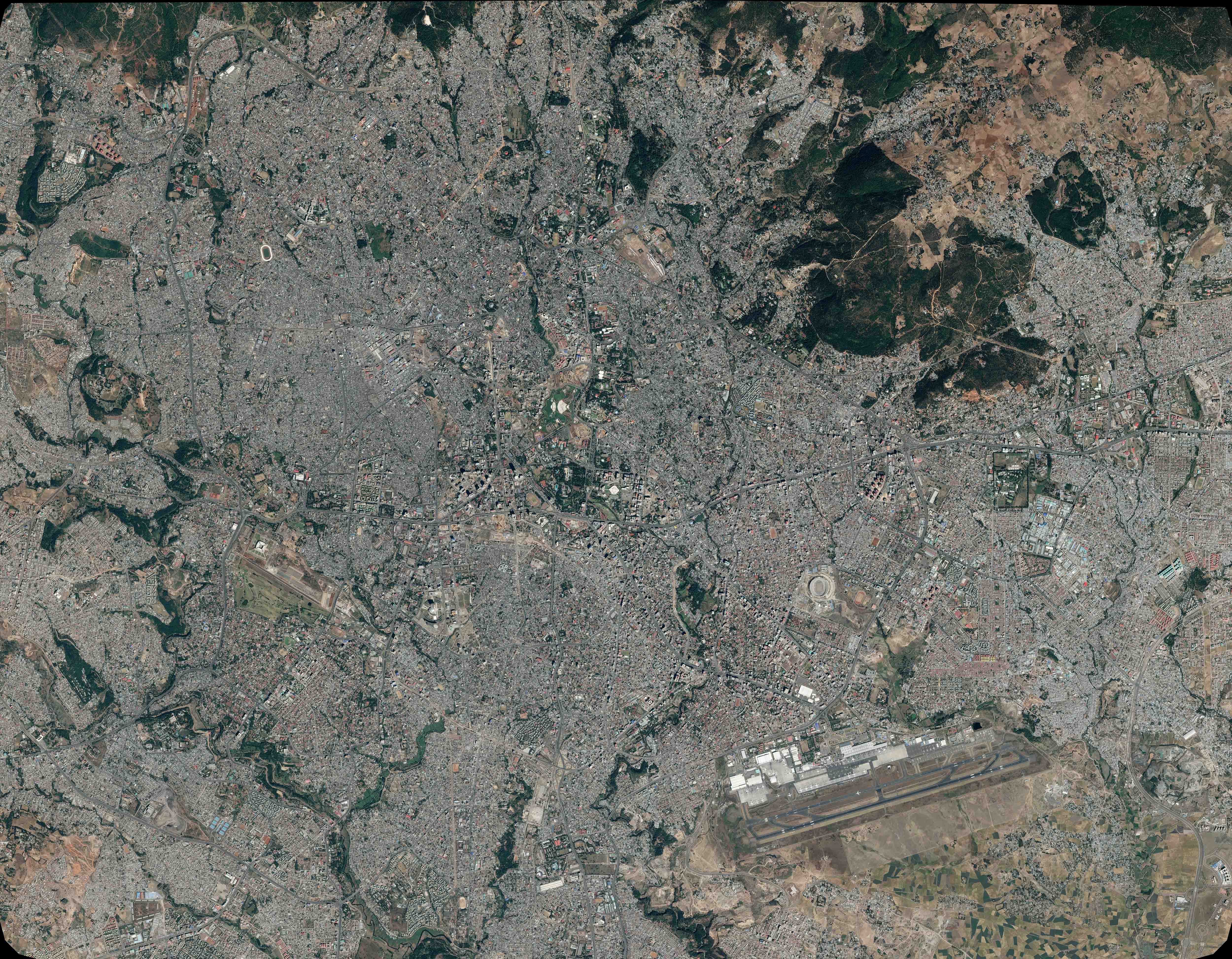 Bloqué au Nord par Entotto, le flot urbain déferle vers le Sud-Est entre des volcans éteints isolés, les uns démantelés, Furi (2838 m) au Sud-Ouest et Yerer (3099 m) à l’Est, et les autres couronnés de lacs de cratères comme à Bishoftu, à l’Est, et au Zuqwala (2 989 m) plus au Sud. En 1991 déjà, les villes de Dukem et d’Aqaqi et leurs usines et entrepôts, furent incluses dans les limites de la capitale fédérale.