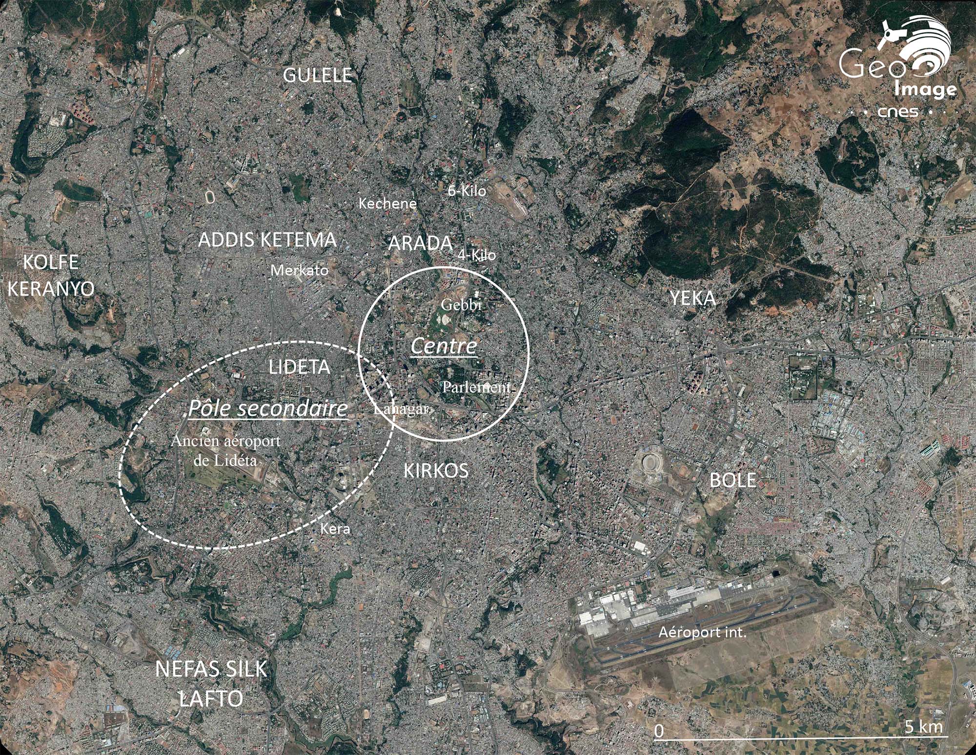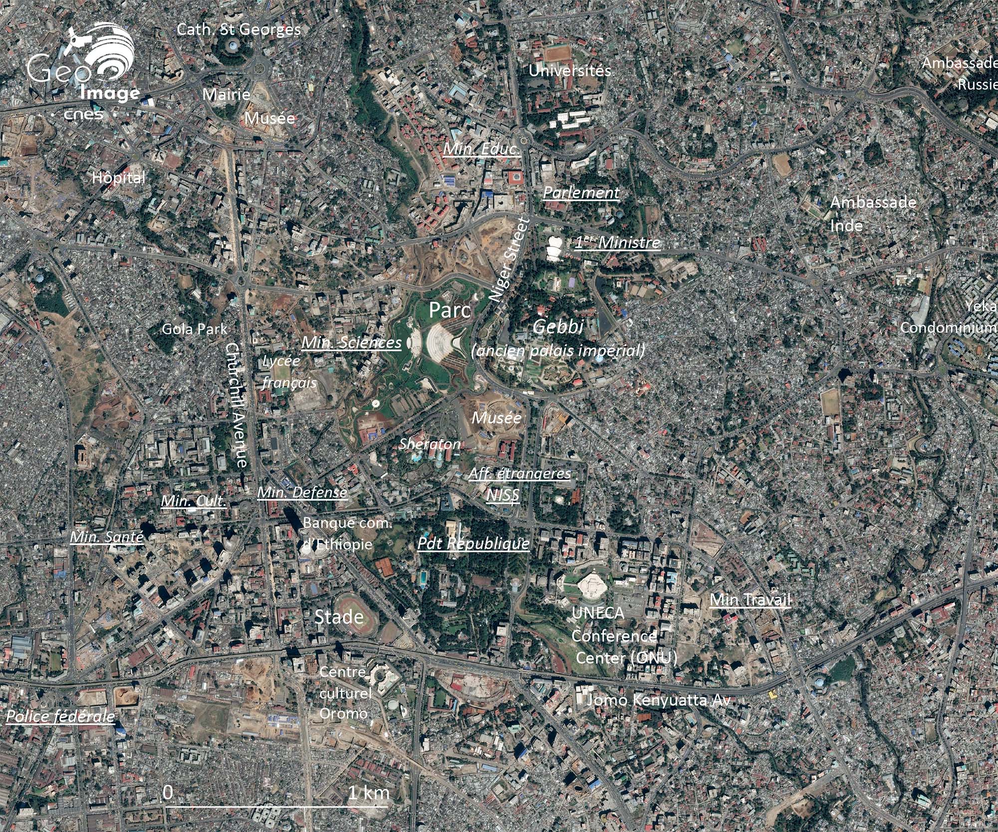 Cette image plus détaillée du centre témoigne à la fois du poids des héritages (site du Gebbi, ancien palais imprial), des deux axes urbains nord/sud structurants aux fonctions – politiques à l’est, économiques à l’ouest – bien différenciées et de l’importance des mutations en cours.