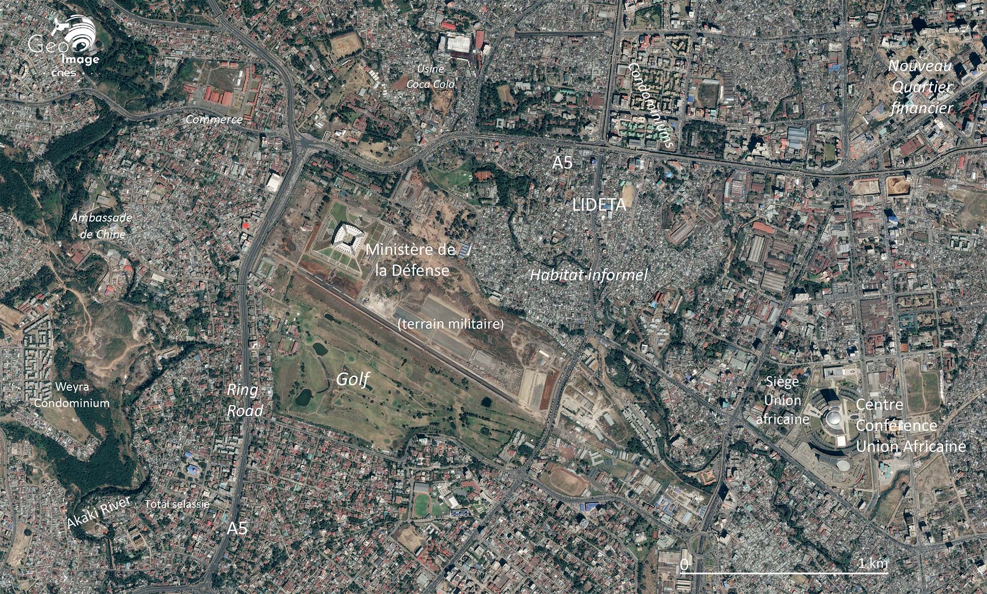 Si les anciennes pistes du vieil aérodrome de Lideta, construit par les Italiens à 4,8 km du centre-ville, sont bien visibles, cette emprise vaste emprise urbaine est occupée au sud par le plus grand golf d’Ethiopie, appartenant à l’armée et réservé aux élites politiques et écono-miques et, au nord, par un vaste complexe immobilier très récent du Ministère de la Défense.