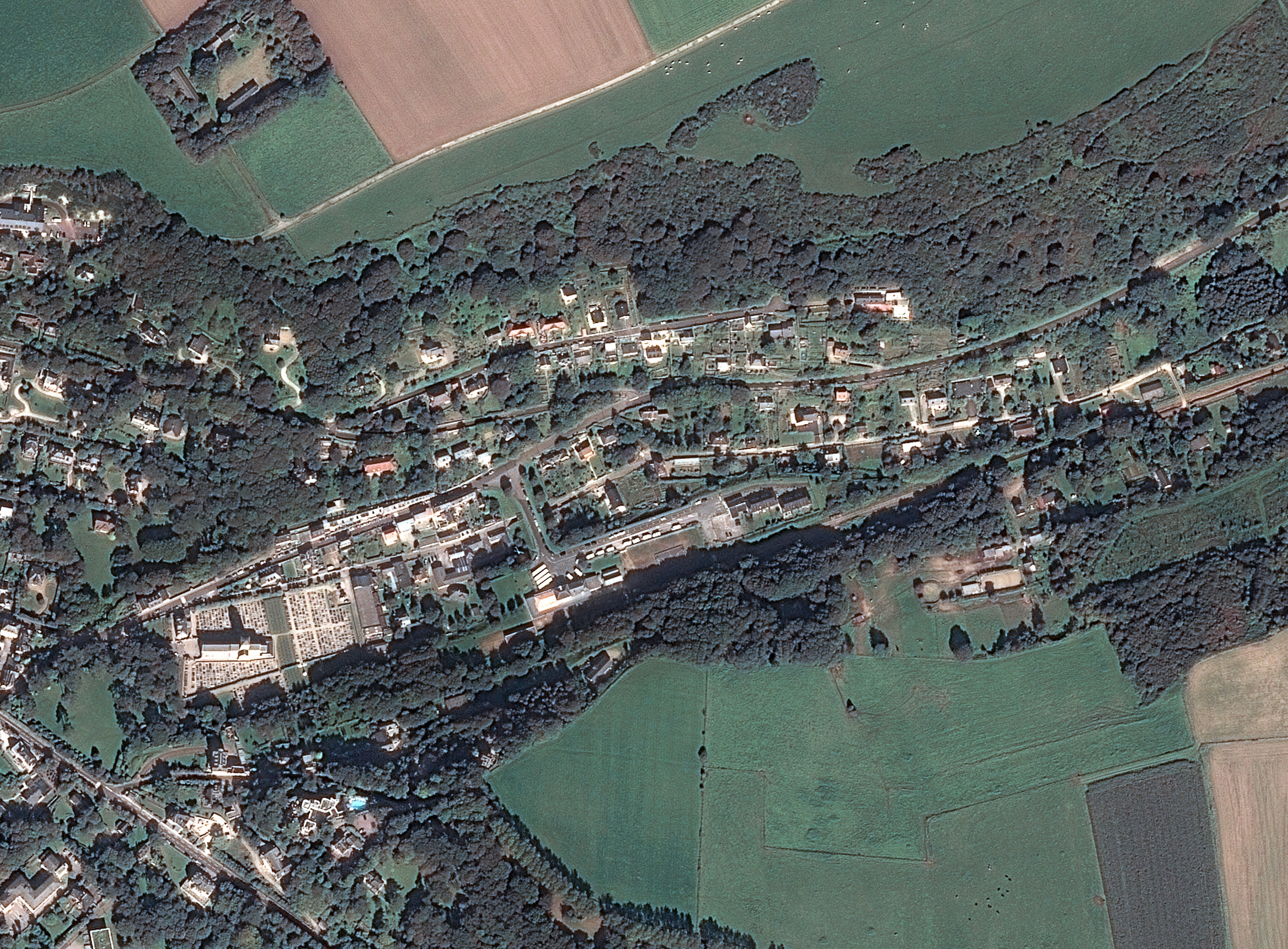 L’urbanisation n’atteint pas cependant le plateau crayeux du Pays de Caux caractérisé par un paysage d’openfield et la pratique d’une agriculture productiviste de grandes cultures. L’image met également nettement en évidence l’habitat agricole dispersé typique du Pays de Caux : les clos-masures, regroupements de bâtiments agricoles au sein d’une cour quadrangulaire ceinte par un talus planté d’arbres hauts afin de se mettre à l’abri du vent.