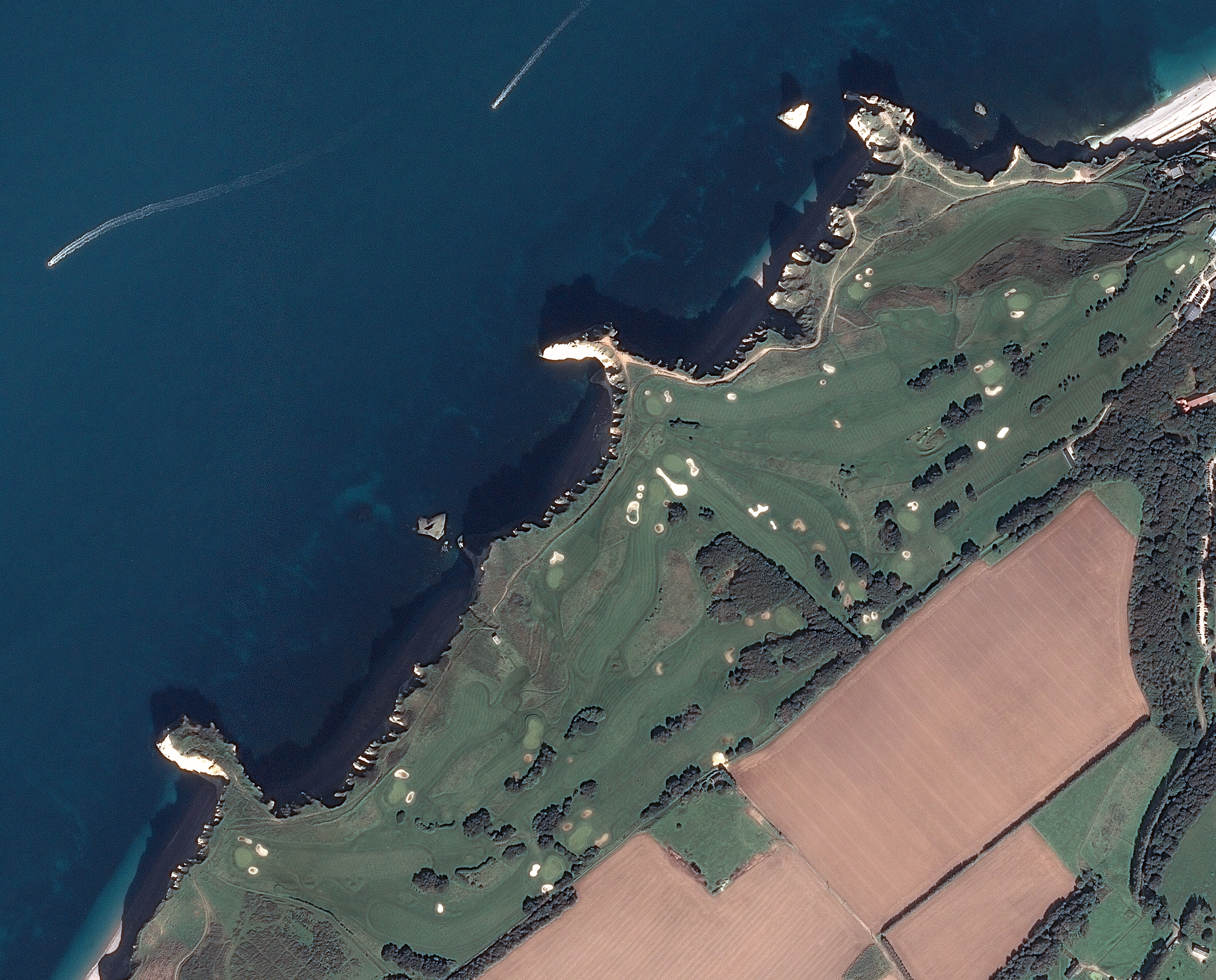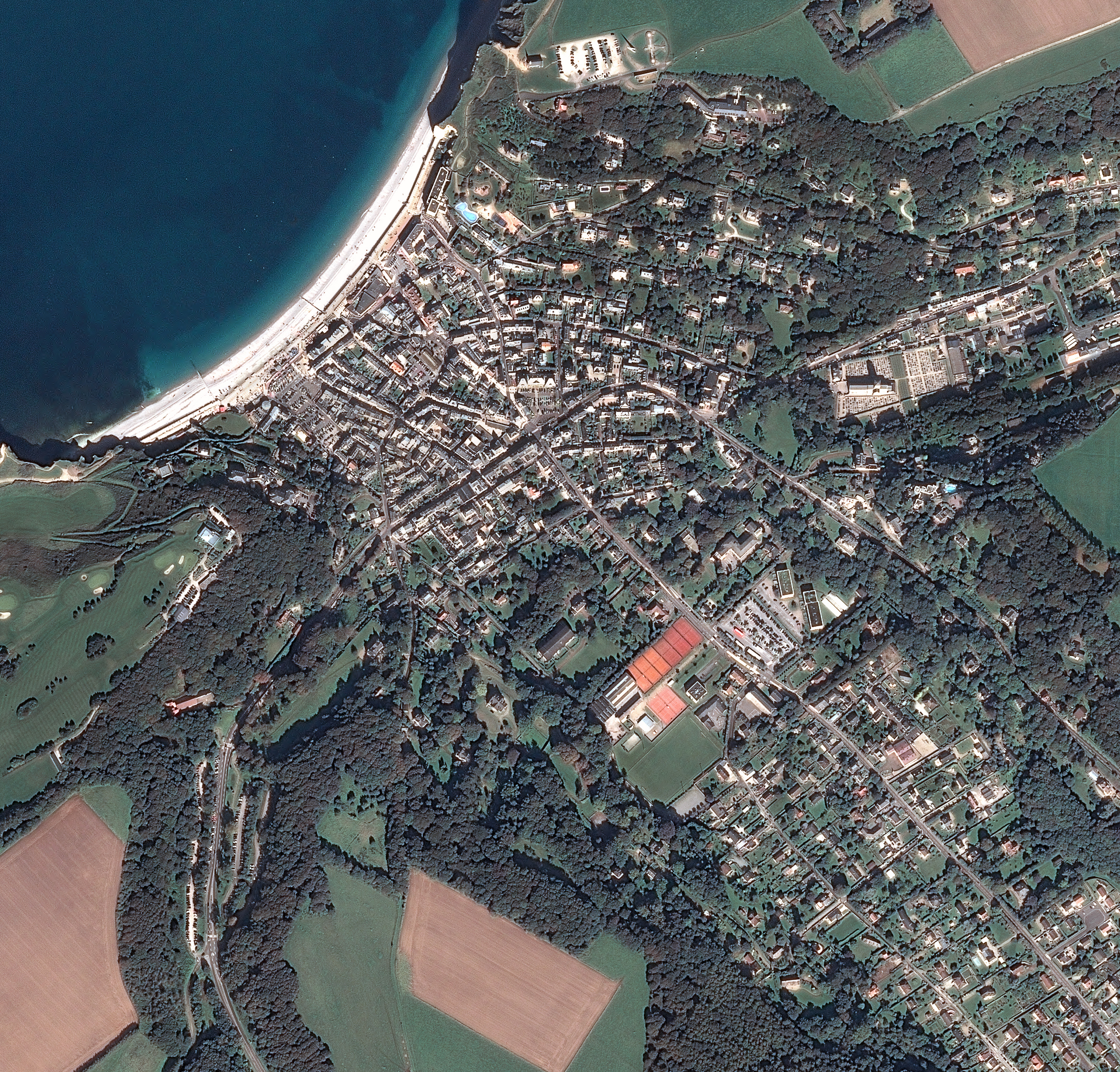 Cette image d'Étretat, station balnéaire de renom située dans le département de la Seine-Maritime en Normandie, a été prise par un satellite Pléiades le 20/09/2015. Il s’agit d’une image en couleurs naturelles, de résolution native à 0,70m, ré-échantillonnée à 0,5m.