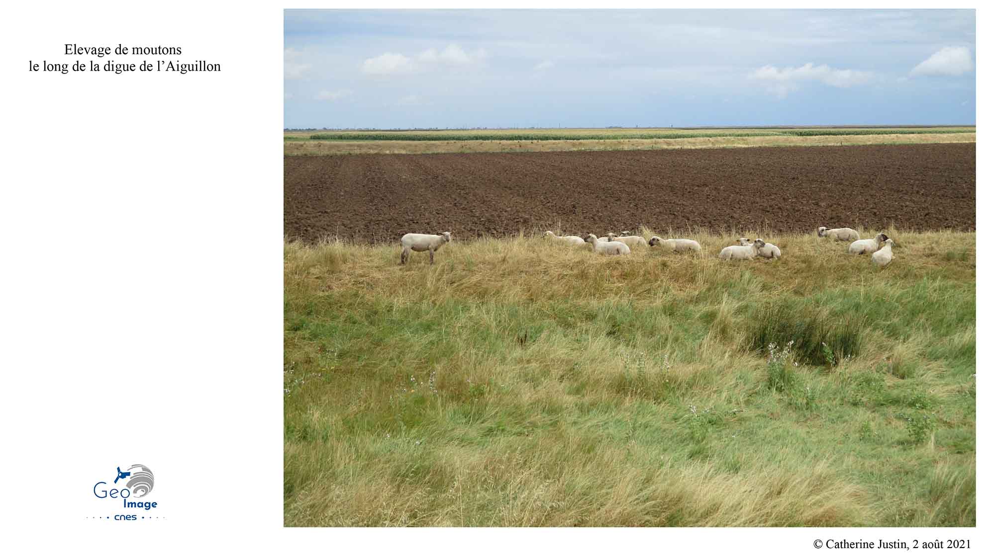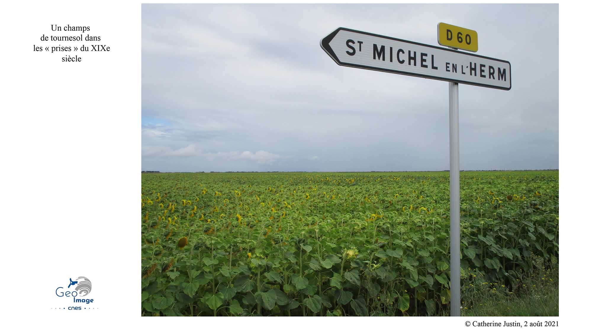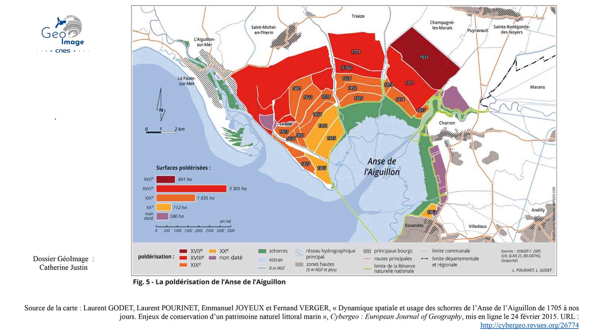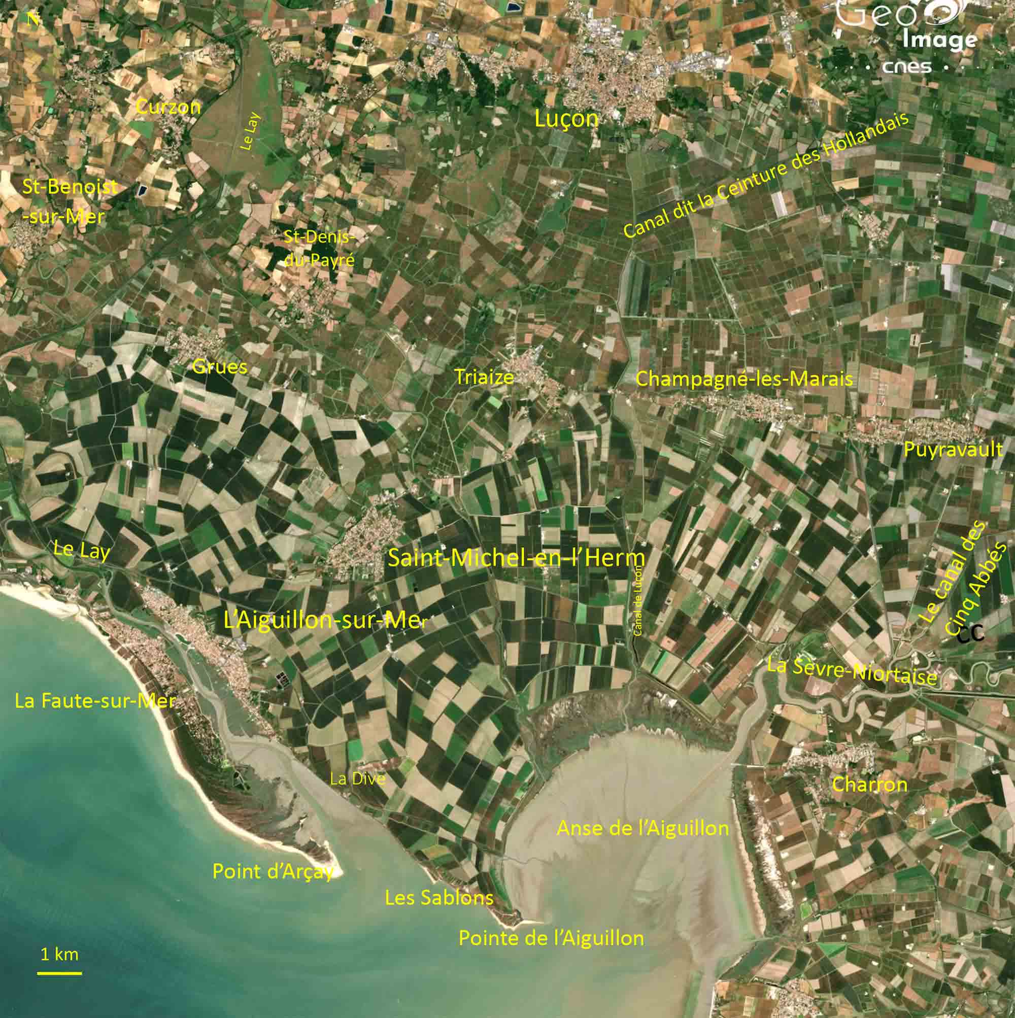 Un marais poldérisé. Les terres ont en effet été gagnées sur l’estran, en particulier sur le schorre, partie supérieure des étendues intertidales de la vasière de l’anse de l’Aiguillon, lors de différentes phases d’aménagement identifiables sur l’image.