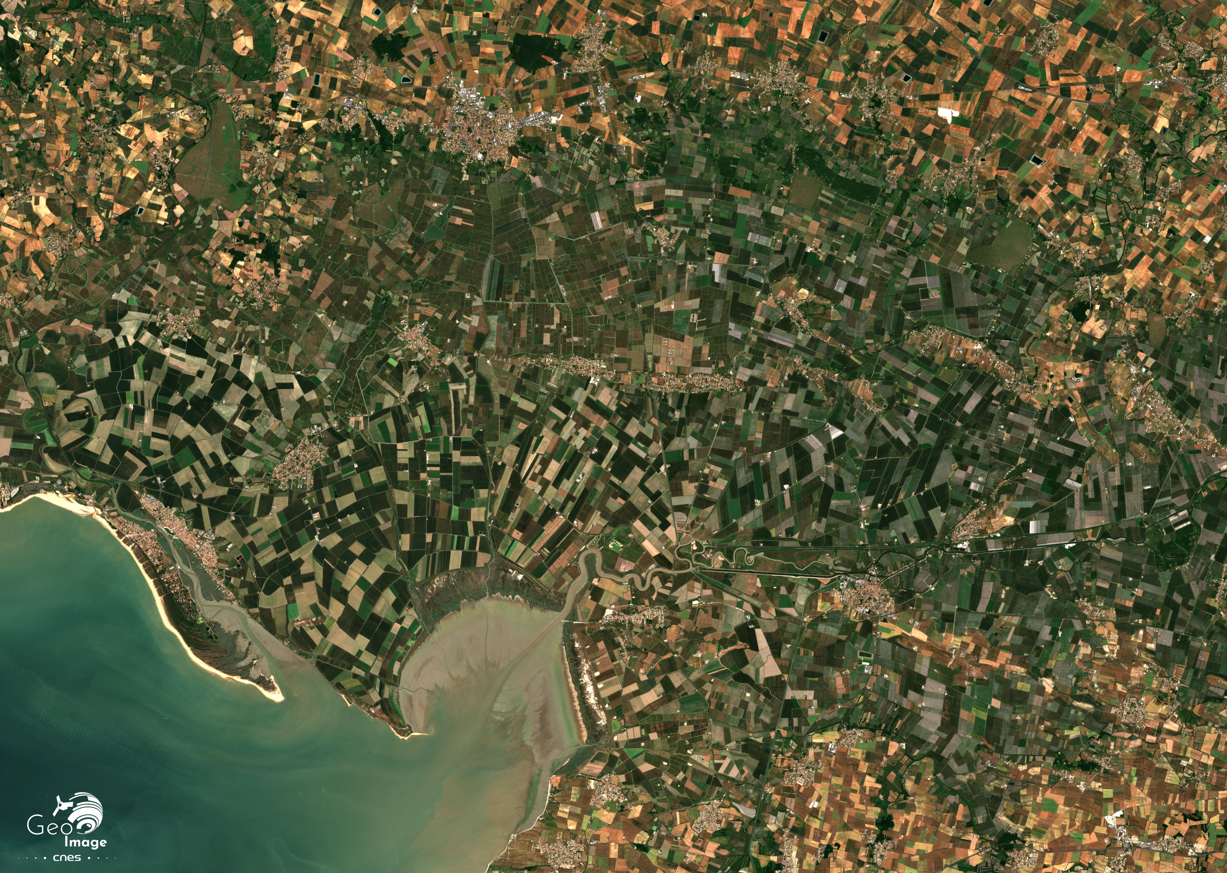Cette image du parc naturel régional du Marais poitevin, entre les estuaires de la Charente et de la Gironde, a été prise par un satellite Sentinel-2 le 28 mail 2022. Il s’agit d’une image en couleurs naturelles de résolution native à 10m.