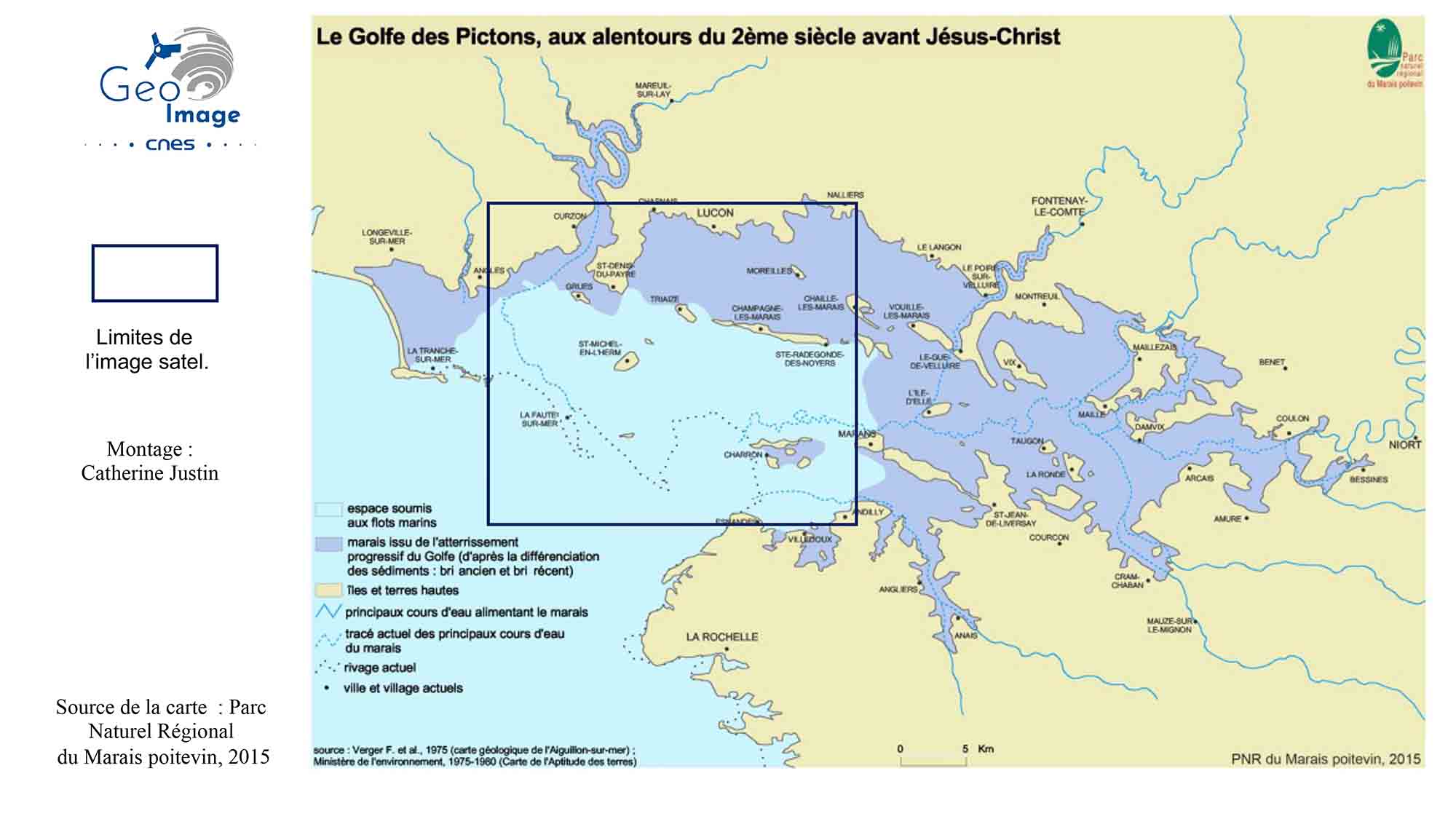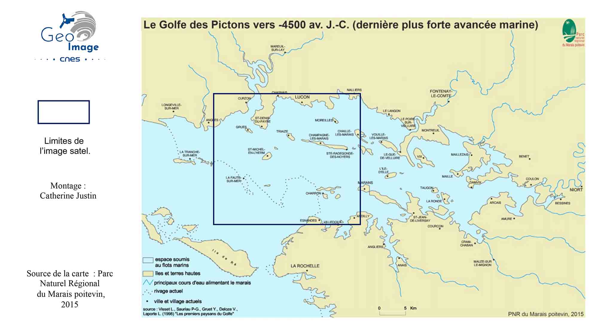 L’image est centrée sur la façade littorale du marais Poitevin, bordée par le Pertuis breton, baignée par l’océan Atlantique et protégée, côté maritime, par le parc naturel marin de l’estuaire de la Gironde et de la mer des Pertuis. Ce pertuis, mer intérieure peu profonde entre île de Ré et continent, est alimenté par les deux principaux fleuves du marais poitevin, le Lay et la Sèvre Niortaise qui draine l’anse de l’Aiguillon. Les marais dominent sur l’image ; ils ont été colmatés par le dépôt de bri, des argiles assez semblables aux vases actuelles de l’anse de l’Aiguillon, qui a été déposé sur de grandes épaisseurs par l’océan lors de la transgression flandrienne.