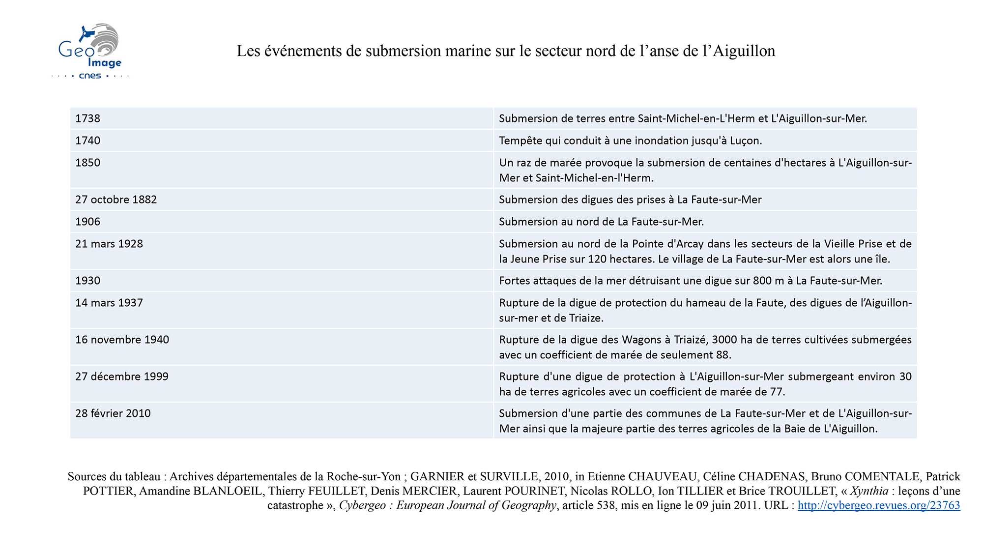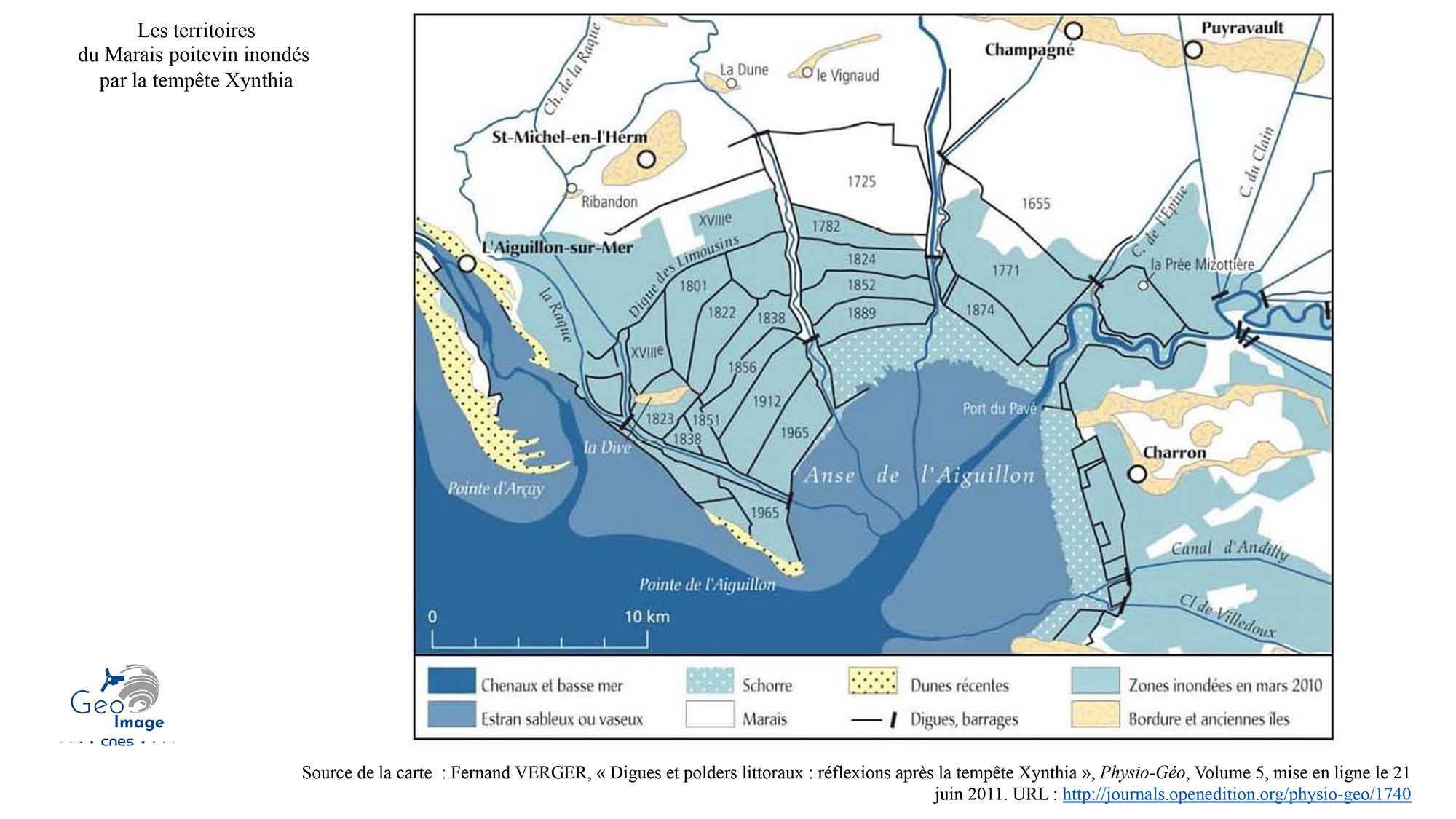 Depuis le Moyen-Age, les submersions marines sur ce territoire ont été régulières (doc. 9) mais ne touchaient jusqu’aux années 1950 que des zones faiblement bâties. Le risque était donc faible. Avec la littoralisation du peuplement dans la seconde moitié du XXe siècle, la tempête Xynthia en 2010 a amené à prendre conscience, dans des circonstances dramatiques, des risques à bâtir en zone inondable.