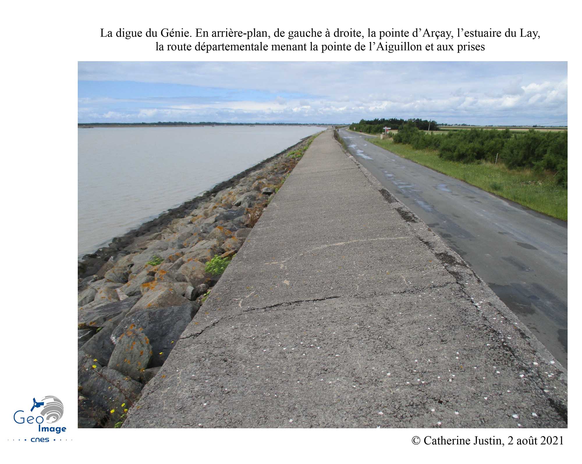 C’est est une flèche littorale bien visible au sud-ouest. Les épis transversaux, identifiables sur l’image par l’aspect dentelé de l’estran sableux, ont été édifiés pour retenir les dépôts sédimentaires et pour retarder l’érosion d’une flèche privée d’une partie de son alimentation sur sa façade océanique par la pointe d’Arçay. Dès le XIXe siècle, ce bilan sédimentaire négatif avait entraîné la construction d’une digue de protection, la digue du Génie, visible sur l’image par une ligne noire le long du liseré littoral (doc. 16).