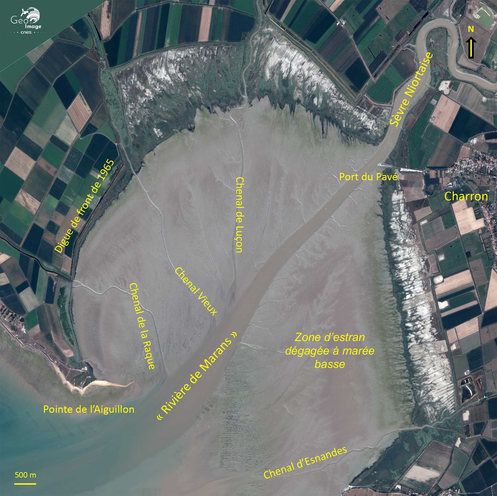 L’image montre l’anse de l’Aiguillon à marée basse dans laquelle débouche le large chenal unique de la Sèvre Niortaise qui s’écoule du nord-est vers le sud-ouest. Ce lit mineur de la partie maritime de la Sèvre niortaise, appelé « rivière de Marans », est entièrement situé au-dessous des plus basses mers connues. D’une superficie de près de 5 000 hectares, l’anse est une vasière composée de deux zones distinctes la slikke (3 700 hectares) et le schorre (1 000 hectares).