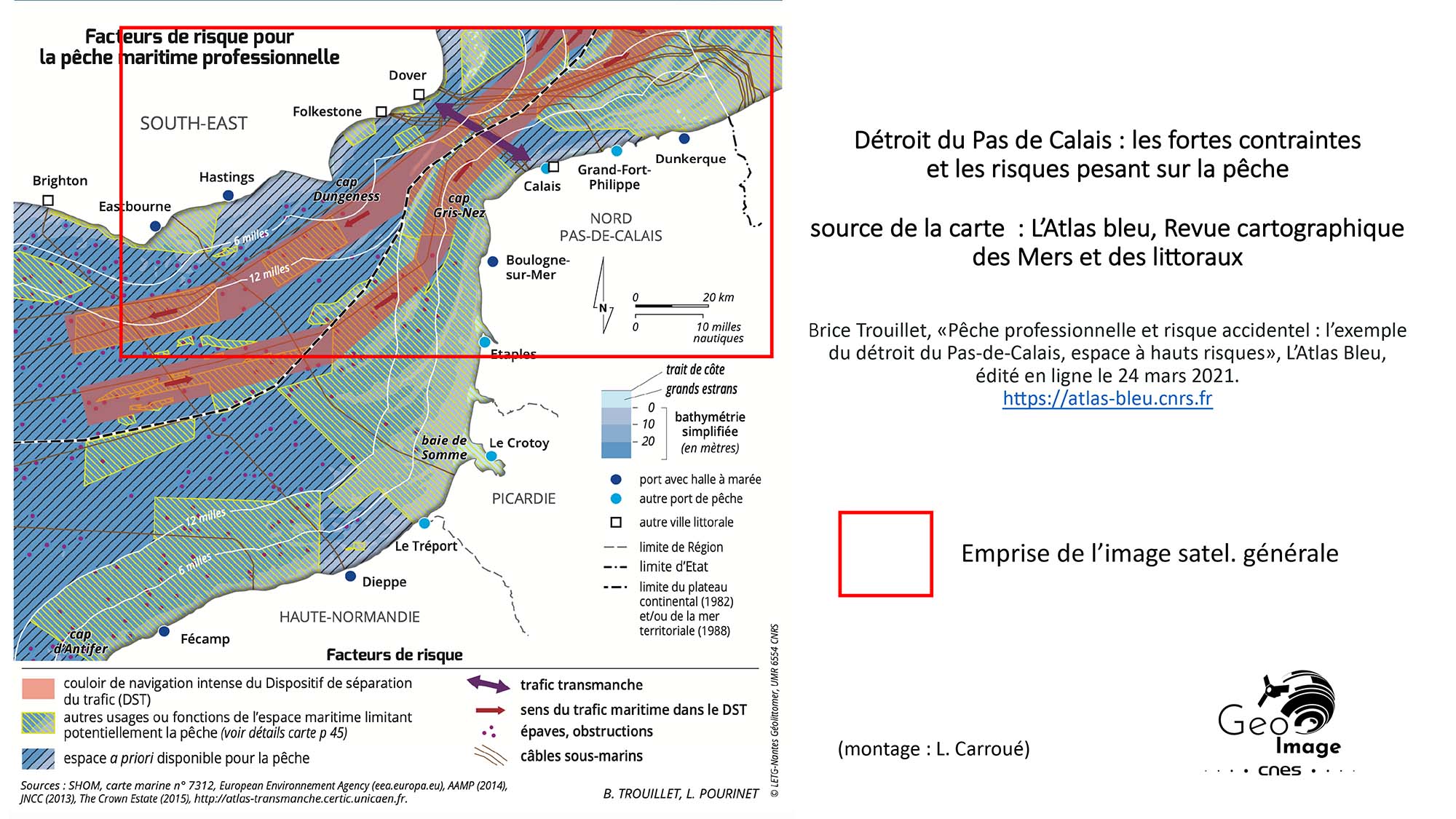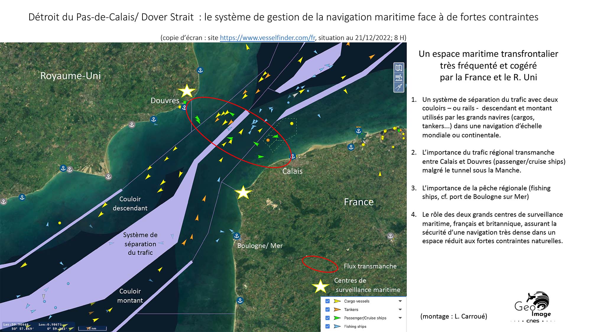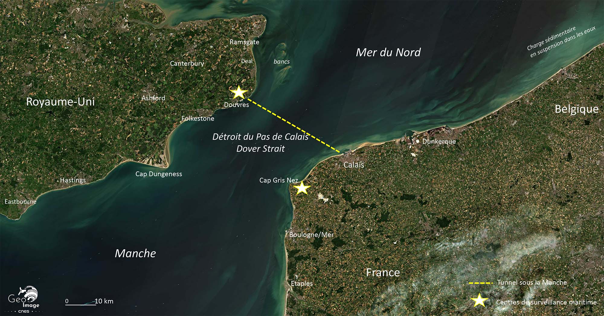 Comme le définissait le géographe Jacques Marcadon, les détroits sont des bras de mer plus ou moins resserrés entre les deux côtes qui les bordent ; ce sont des voies de communication qui mettent en relation deux étendues maritimes. Un détroit est aussi un point de plus grande proximité entre deux masses terrestres plus ou moins importantes ; ce sont donc aussi des ponts enjambant les mers. Ce sont bien ces deux logiques que l’on retrouve clairement exprimées sur l’image. Cette région maritime du détroit du Pas-de-Calais se caractérise par son étroitesse, sa faible profondeur, l’intensité de son trafic, la densité démographique et économique de ses rivages (cf. grands ports de la Northern Range), son caractère transfrontalier et son unité physique.