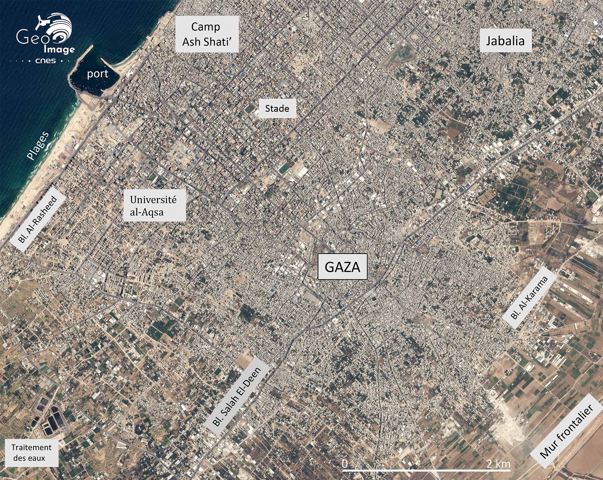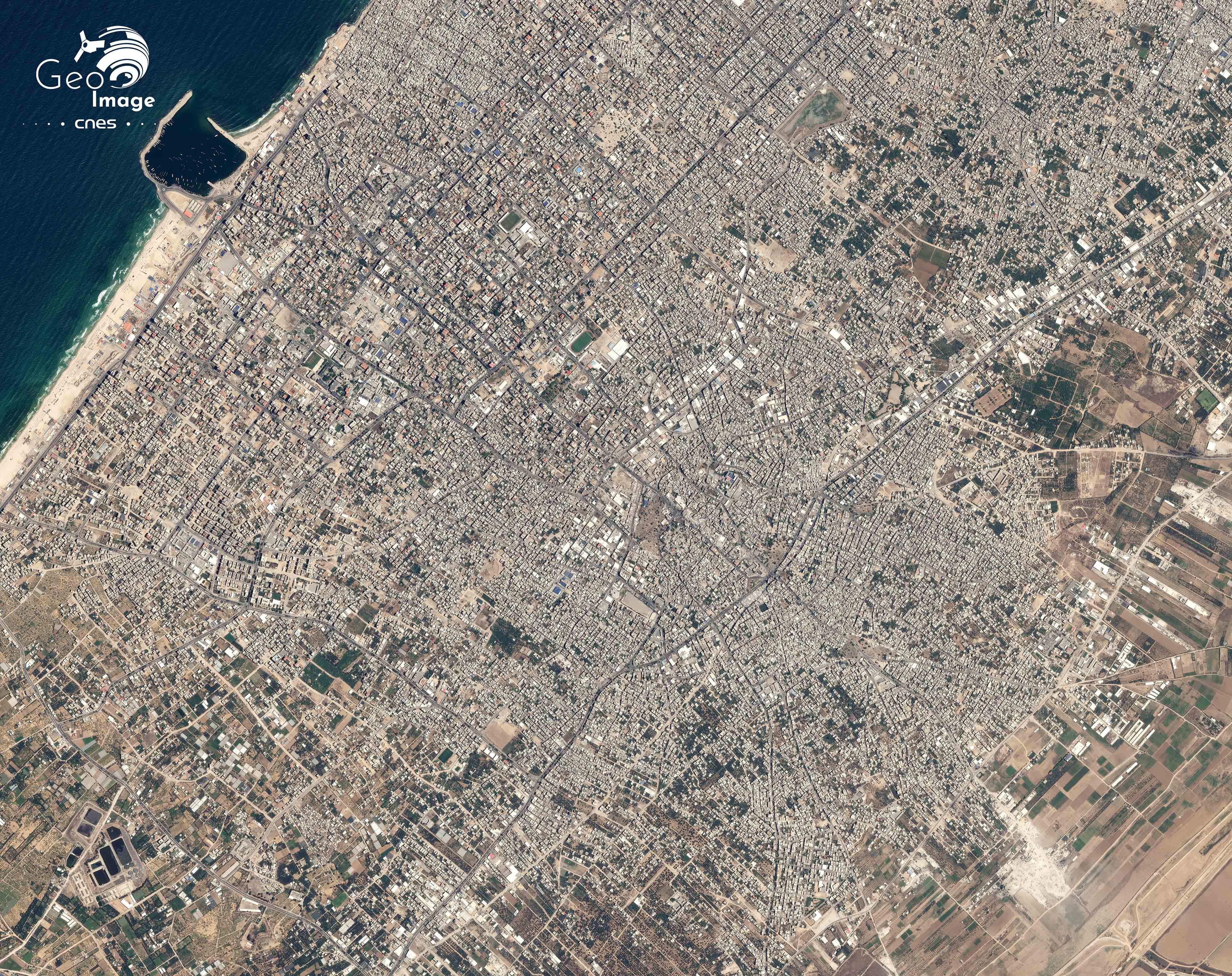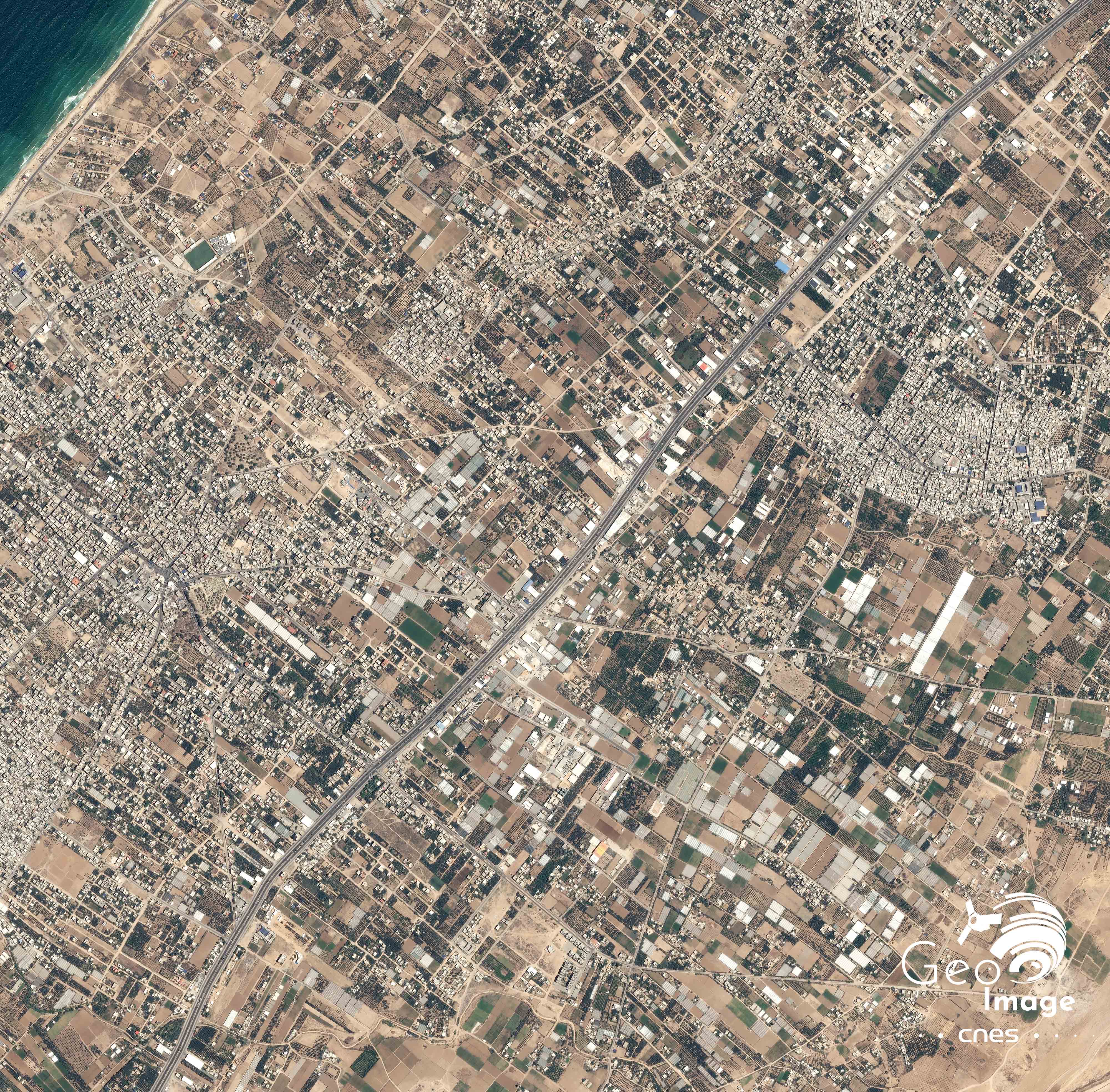 Aquí estamos en el corazón de la Franja de Gaza, sobre el casco antiguo de Gaza. La imagen muestra lo pequeña que es la zona: la distancia entre el pequeño puerto y el muro fronterizo es de sólo 7 km. Las principales vías de comunicación (Al-Rasheed, Salah El-Deen y Al-Karama) discurren paralelas a la costa. Por ello, la zona urbana parece especialmente densa, sobre todo en el campo de Ash Shati', al noroeste de la imagen. Las zonas agrícolas se ven cada vez más devoradas por el desarrollo urbano, como puede apreciarse en el tejido urbano de Yabalia y Gaza, o en las extensiones urbanas de Gaza hacia el sureste.