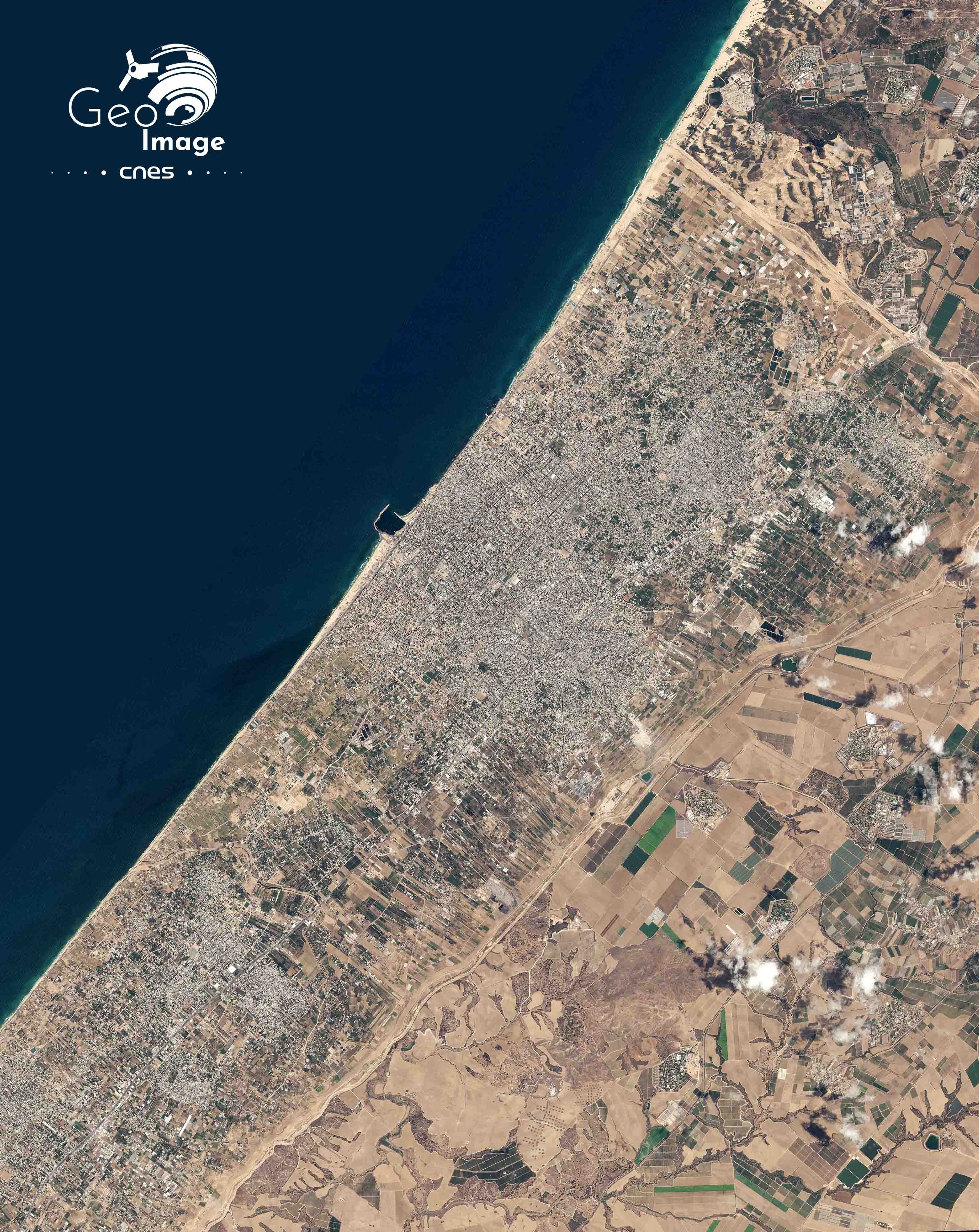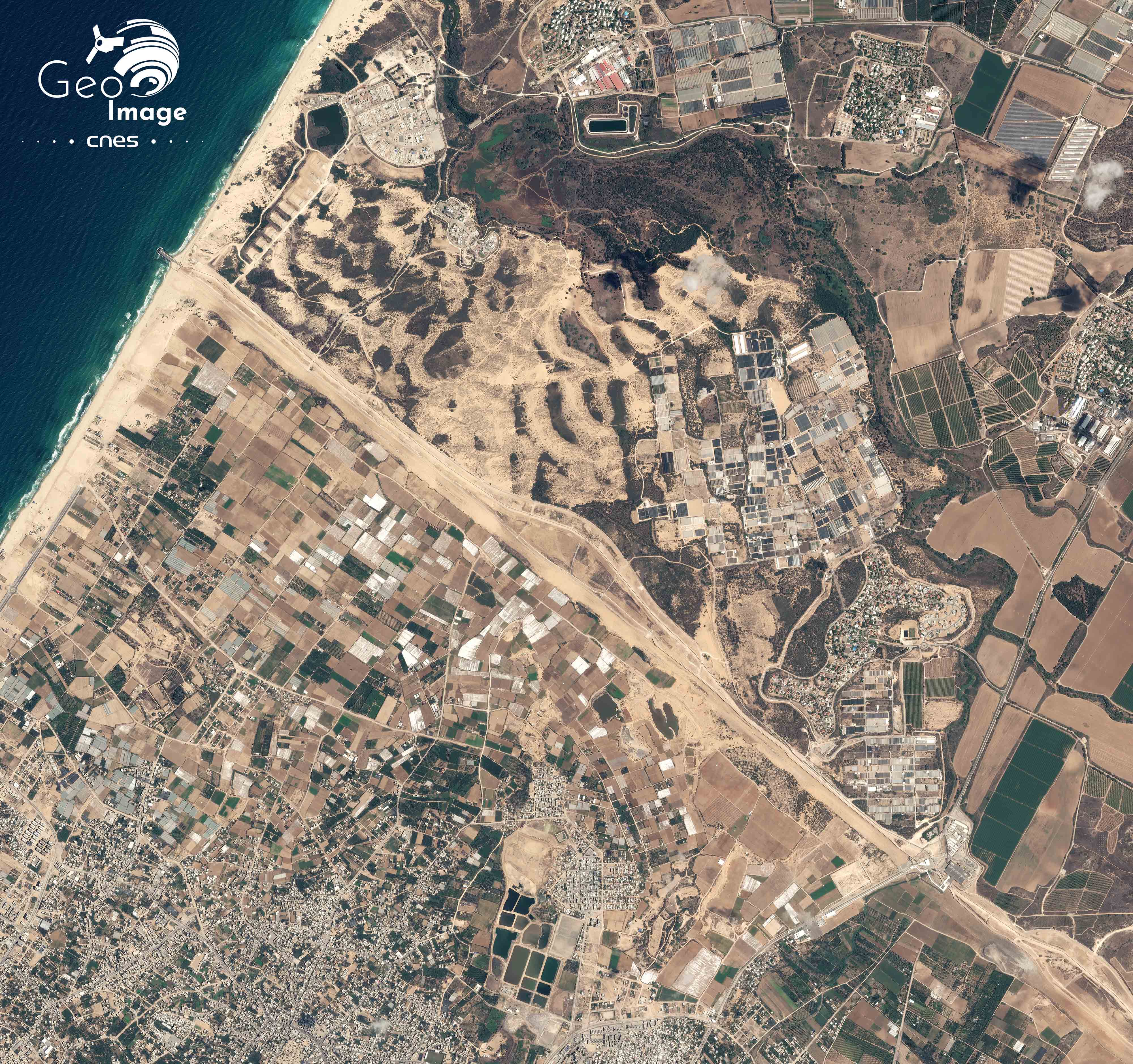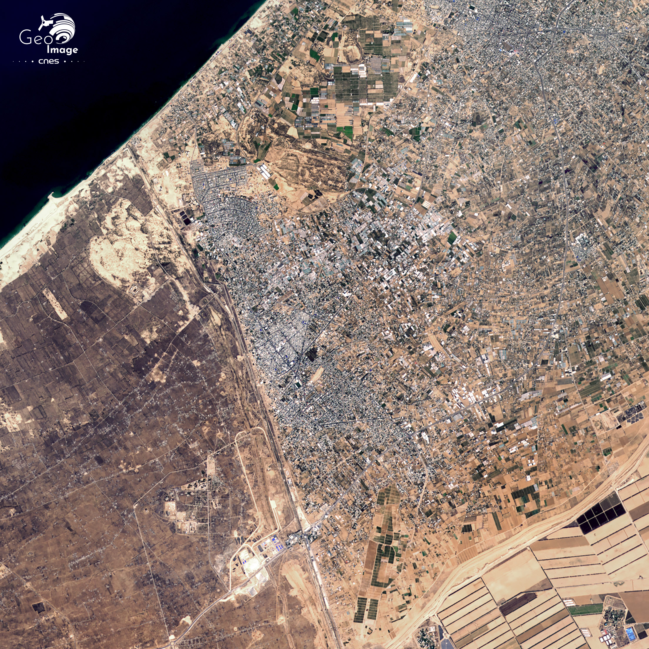 Aquí estamos en el corazón de la Franja de Gaza, sobre el casco antiguo de Gaza. La imagen muestra lo pequeña que es la zona: la distancia entre el pequeño puerto y el muro fronterizo es de sólo 7 km. Las principales vías de comunicación (Al-Rasheed, Salah El-Deen y Al-Karama) discurren paralelas a la costa. Por ello, la zona urbana parece especialmente densa, sobre todo en el campo de Ash Shati', al noroeste de la imagen. Las zonas agrícolas se ven cada vez más devoradas por el desarrollo urbano, como puede apreciarse en el tejido urbano de Yabalia y Gaza, o en las extensiones urbanas de Gaza hacia el sureste.