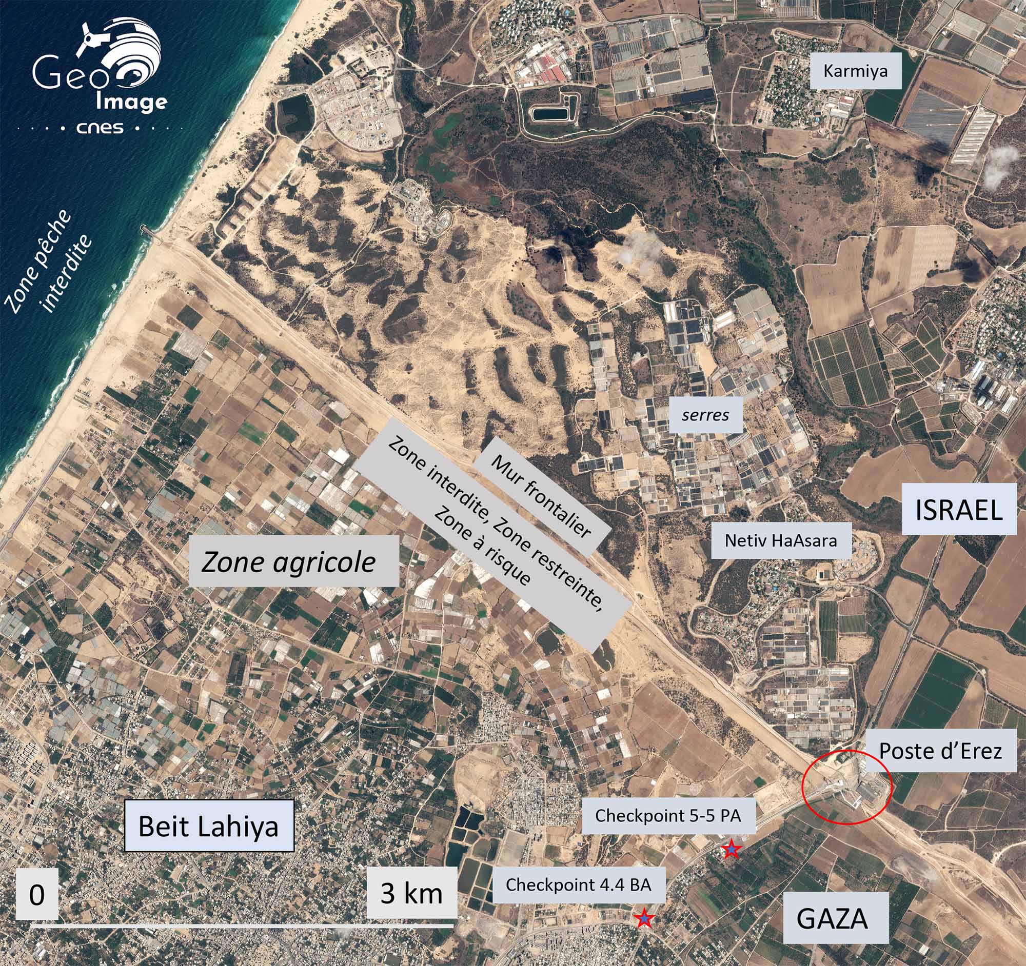 En la imagen, los efectos de esta zonificación son claramente visibles (muro, no-go-zone de 300 m de ancho, llana y despejada...). En total, una amplia franja de terreno dentro de Gaza, entre Beit Lahiha y el muro, parece no estar urbanizada y, por tanto, reservada únicamente a actividades agrícolas. En el lado israelí, el pueblo de Netiv HaAsara y sus zonas de invernaderos se extienden hasta el muro, aunque la parte costera está fuertemente militarizada. Por último, cabe señalar que esta parte del espacio marítimo de Gaza es una zona muy controlada en la que está prohibida toda actividad pesquera, mientras que la playa está especialmente vigilada.