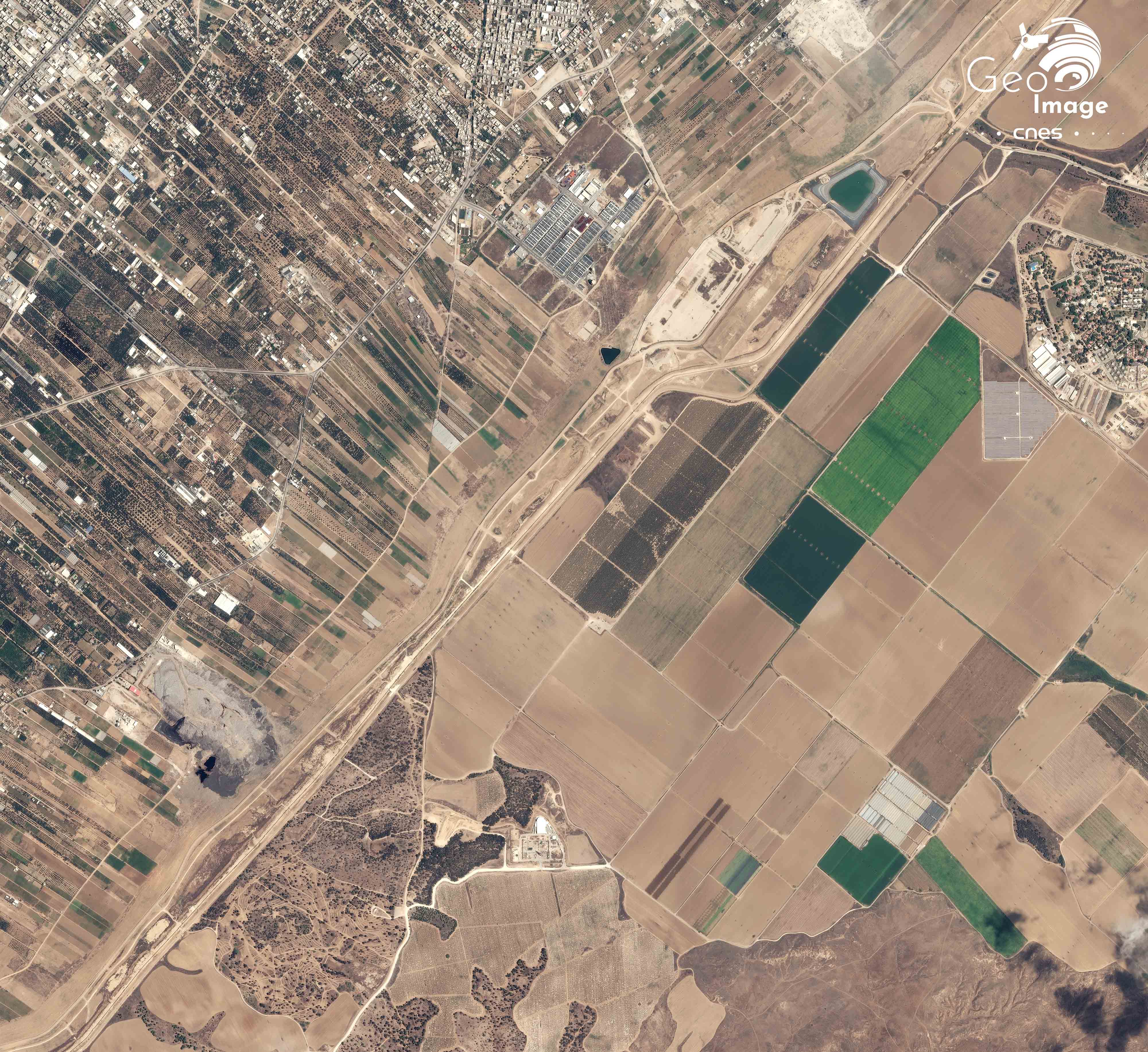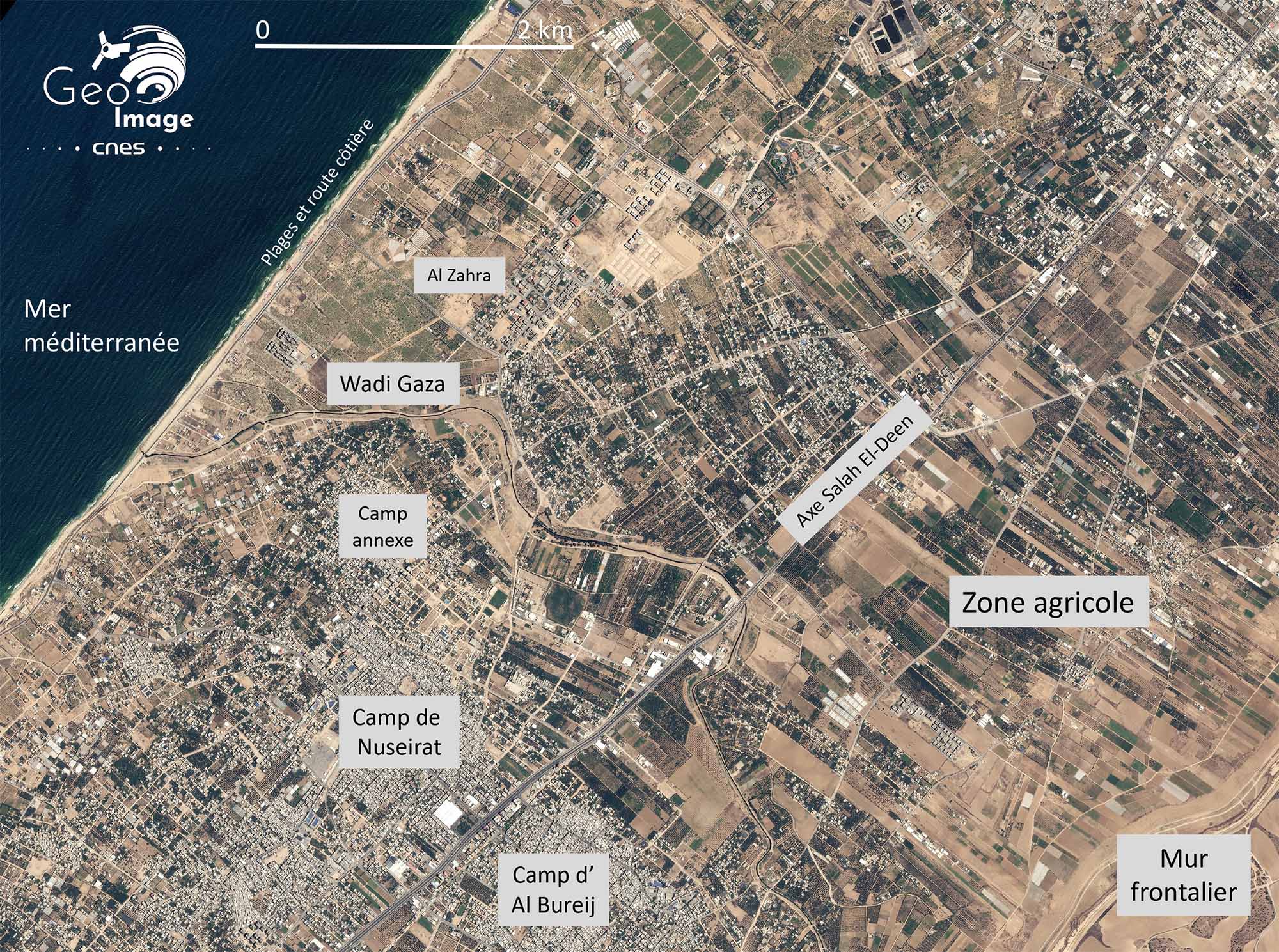 También aquí nos encontramos en una de las principales zonas agrícolas de la Franja de Gaza, que se extiende entre la ciudad de Gaza, al norte, y los campos de refugiados de Nuseirat y Bureij, al sur. En esta zona tampón, la tierra agrícola sigue siendo importante, pero la urbanización la va mordisqueando cada vez más. Por último, los dos campos de Nuseirat y Bureij son claramente visibles debido a su extrema densidad. Son un recuerdo de los sucesivos éxodos de la franja de Gaza. La imagen de Deir al Balah y del campo de refugiados de Al Maghazi, más al sur, pone de relieve la alta densidad y la dispersión de las tierras agrícolas.