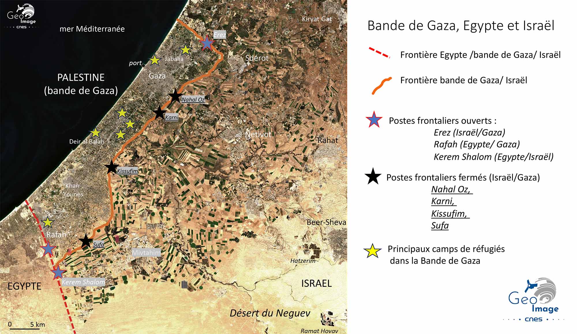 Como resultado de ello, la frontera de 59 km de longitud entre Gaza e Israel es objeto de la más alta vigilancia, que se reforzó aún más con la toma de Gaza por Hamás el 15 de junio de 2007. A pesar del compromiso de Israel de permitir las exportaciones de productos agrícolas y la circulación a la Cisjordania, los cinco pasos fronterizos cruce se han cerrado gradualmente como resultado de las tensiones e intervenciones israelíes (2008-2009, 2012, 2014, 2018). Realizadas contra los movimientos palestinos más radicales que lanzan cohetes contra territorio israelí, causan muchas bajas (2.251 muertos en 2014) y numerosos daños.