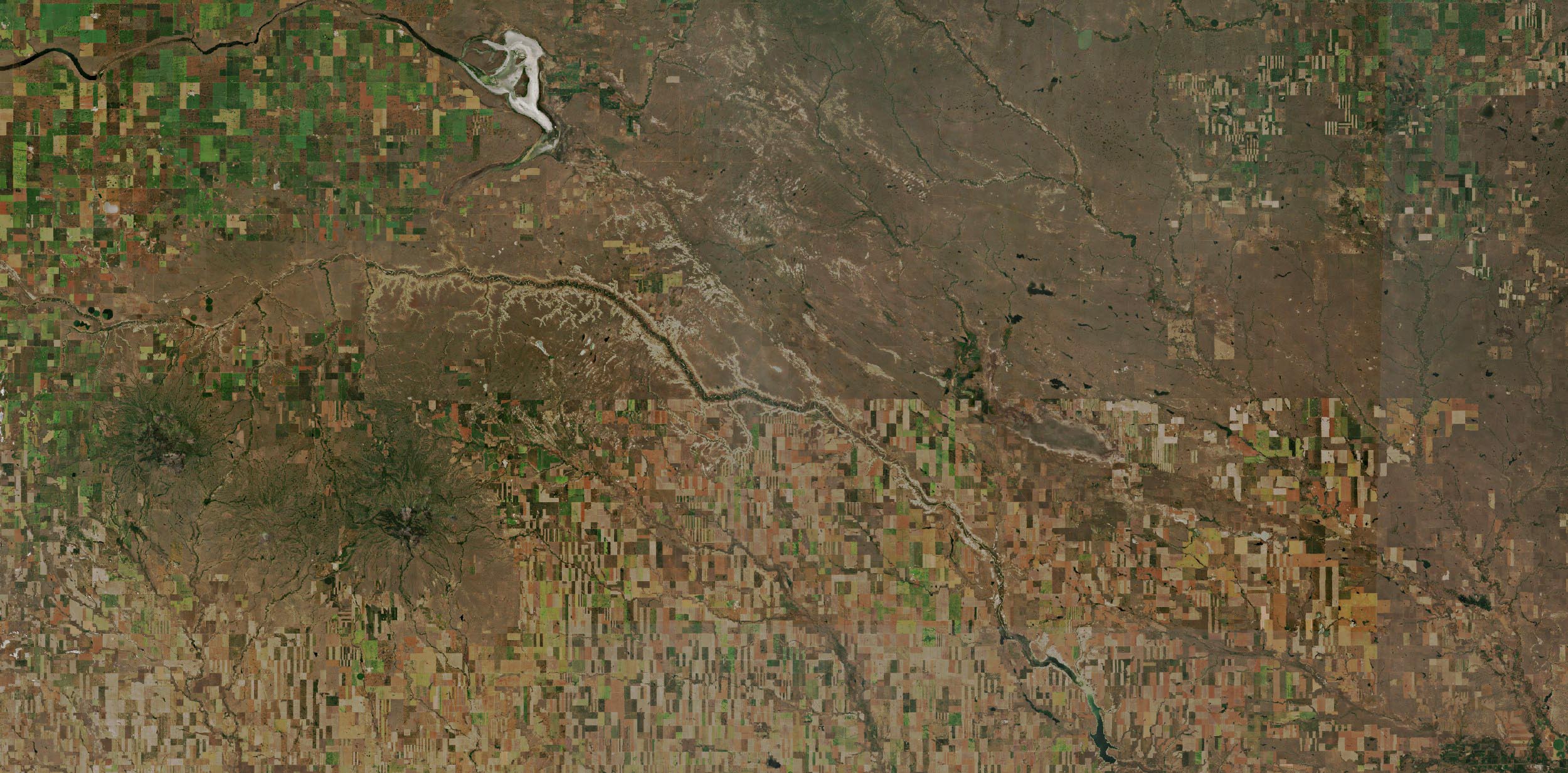 Nous sommes ici dans le nord-ouest des Grandes Plaines, la très vaste région qui organise tout le centre des Etats-Unis et la partie occidentale du Canada méridional. La très vaste chaine des Montagnes Rocheuses se trouve en effet hors image 250 km plus à l’ouest. Toute la région appartient au haut bassin hydrographique du Missouri/ Mississippi, qui draine toute la grande gouttière centrale des Etats-Unis pour se jeter dans le Golfe du Mexique, bien plus au sud donc.