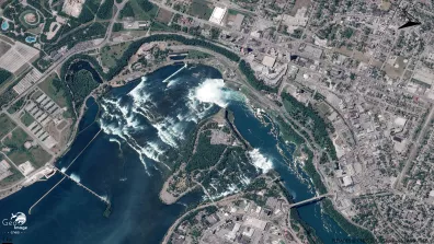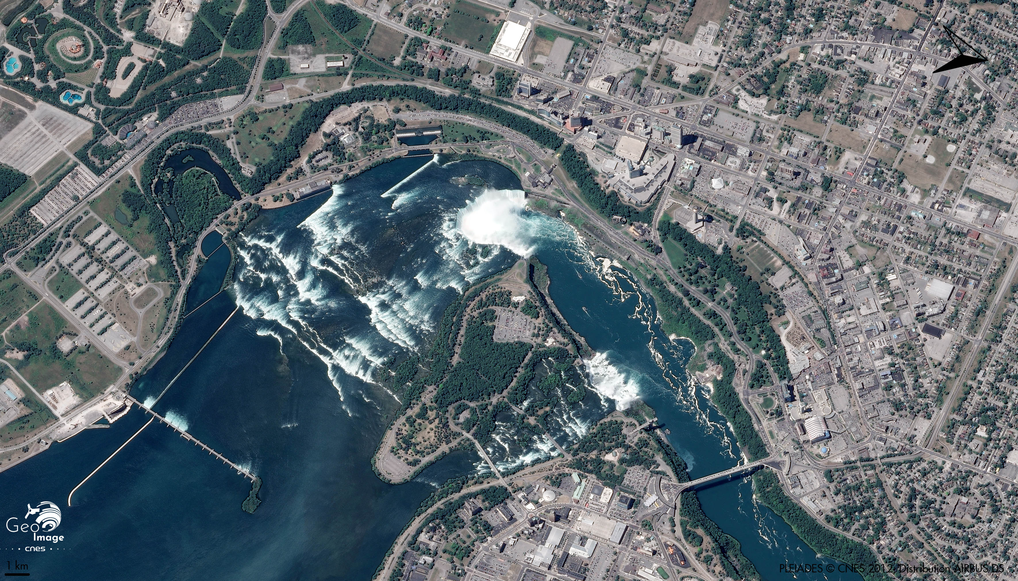 Cette image des chutes du Niagara témoigne à la fois de l’ampleur du site naturel, de sa valorisation urbaine et touristique, ainsi que de son caractère frontalier, la ville transfrontalière de Niagara Falls s’étendant sur les deux États d’Amérique du Nord. Au nord de l’image se trouve le Canada, au sud les États-Unis, reliés par le Rainbow Bridge, bien visible à droite.