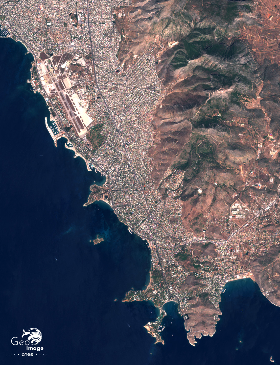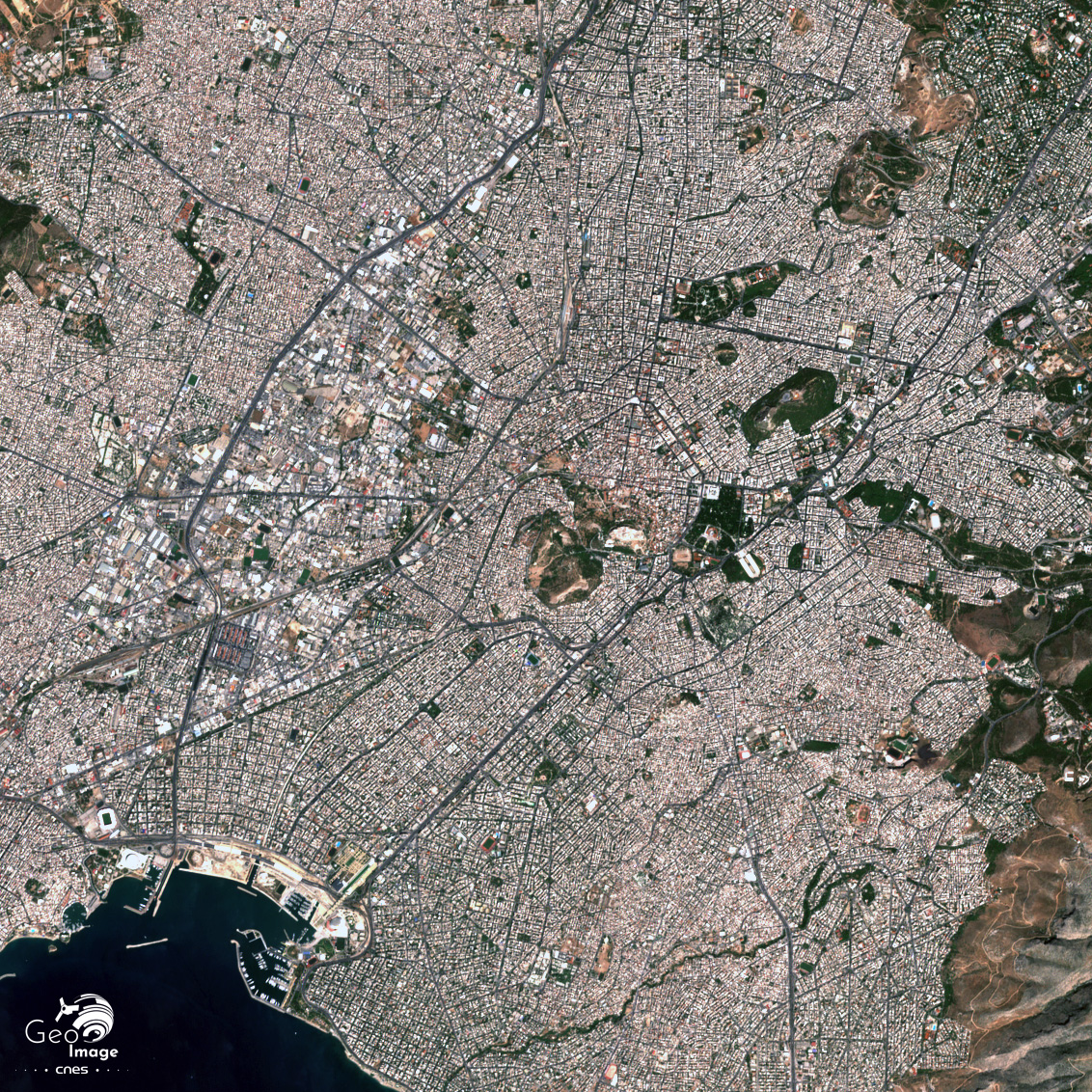 L'image du centre d'Athènes, présentée ci-contre a été prise par un satellite Pleiades le 6 mars 2018. Il s’agit d’une image en couleur naturelle, de résolution native à 0,70m, ré-échantillonnée à 0,5m.