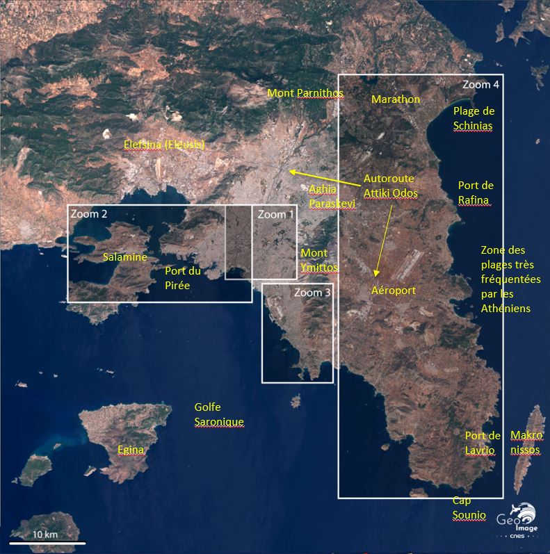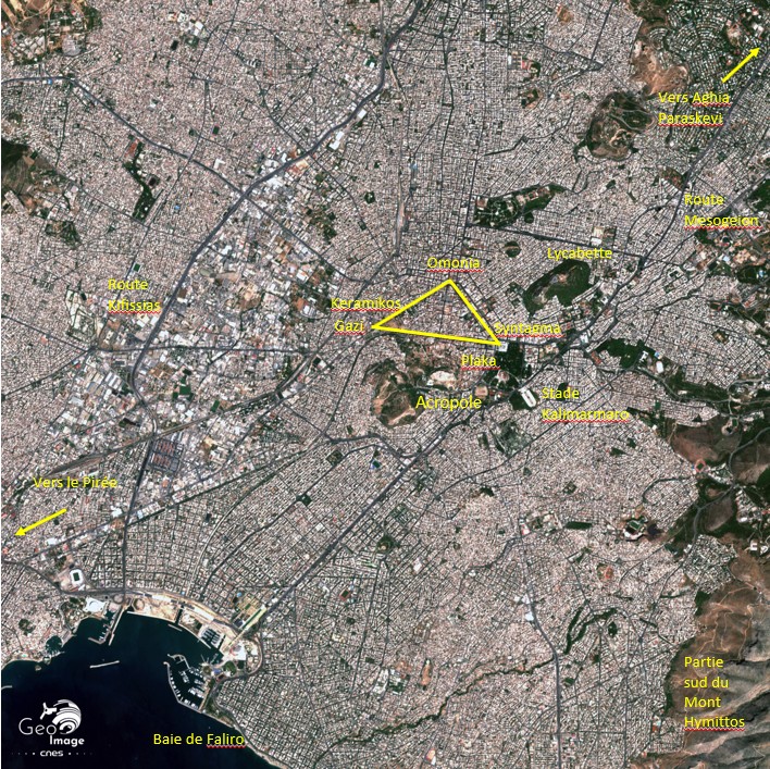 Athènes apparaît comme une métropole gigantesque qui s’est étalée essentiellement au nord/nord-est et au sud le long du littoral. Si la ville intramuros ne compte que 660 000 habitants, les communes périurbaines n’ont cessé de s’accroître telles Aghia Paraskevi à l’est, entre Parnithos et Ymittos, ou Elefsina (Eleusis) au nord ouest qui font maintenant partie intégrante de l’agglomération athénienne. Les politiques urbaines ont tenté de diriger l’urbanisation vers l’est le long de l’autoroute et du métro menant jusqu’à l’aéroport bien visible à l’est de l’image au milieu de plaine agricole.