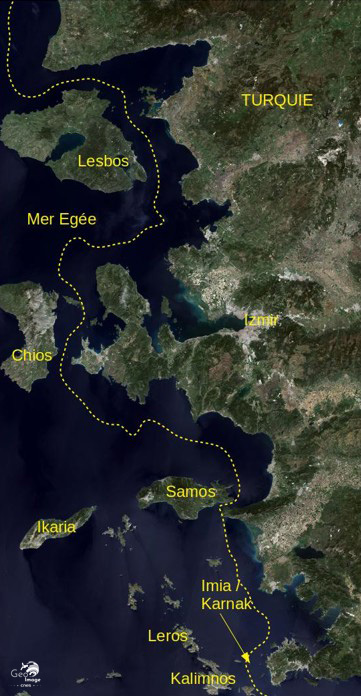 Ilots et rochers. Ainsi, la Turquie met en cause la souveraineté grecque sur certains îlots grecs inhabités comme ceux d’Imia et de Limnia, qui se situent au sud de l'image à l’est de l’île de Kalimnos où en 1996 l'armée turque débarque, ou aujourd’hui sur la petite île de Kastellorizo.