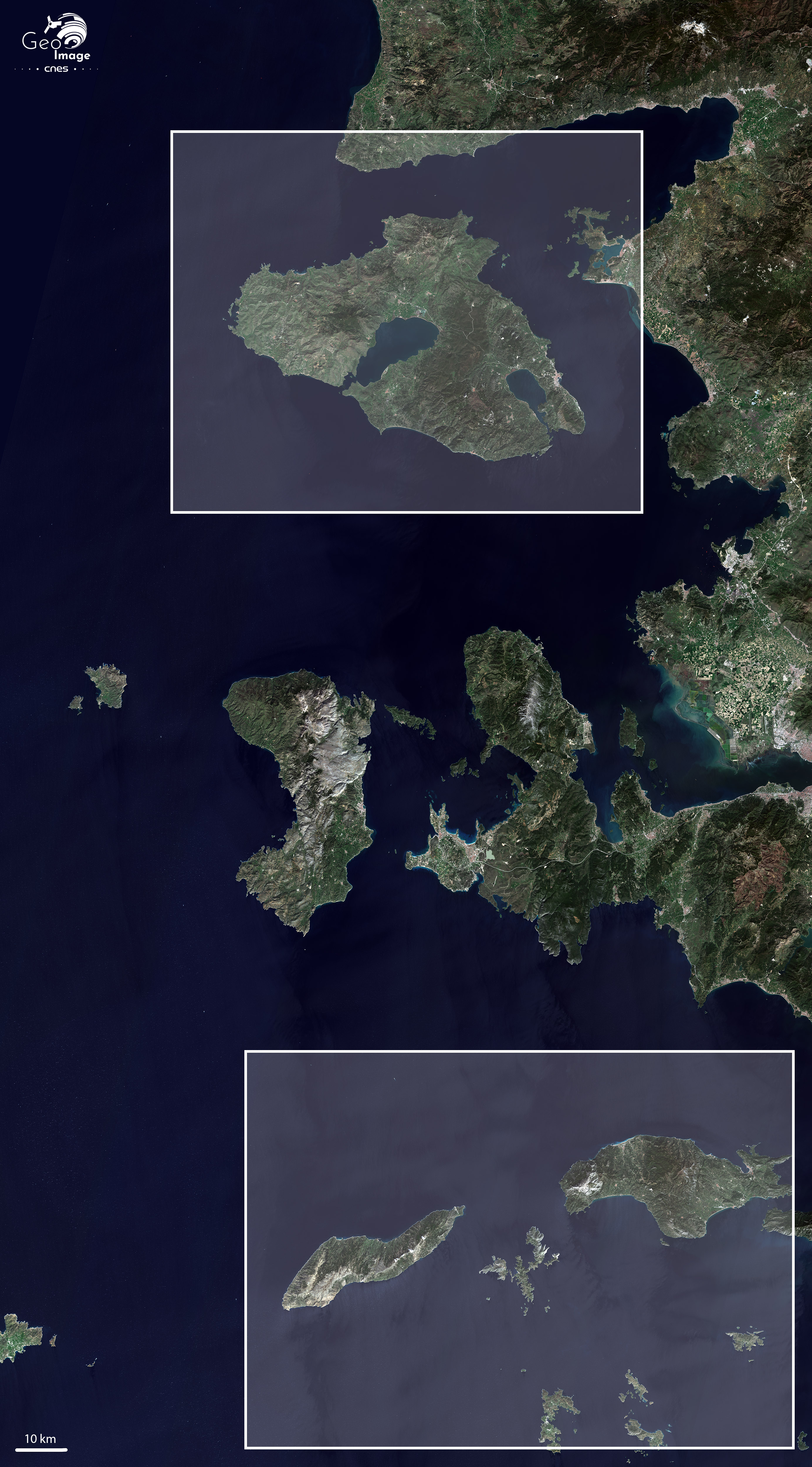 L’image présente à l’est un littoral avec deux caractéristiques majeures : il est accidenté car tombant souvent dans la mer du fait de l’absence de plaines littorales, il est très découpé par une multitude de caps, de presqu’îles, de détroits et de baies. Au centre de l’image se trouvent de nombreuses îles. Du nord au sud s’égrènent bien reconnaissables les principales îles de Lesbos, Chios et Samos ; accompagnées dans le détail – comme le montrent les changements d’échelle apportés par les zooms – par une myriade d’îles secondaires, d’îlots ou de simples rochers très largement inhabités.