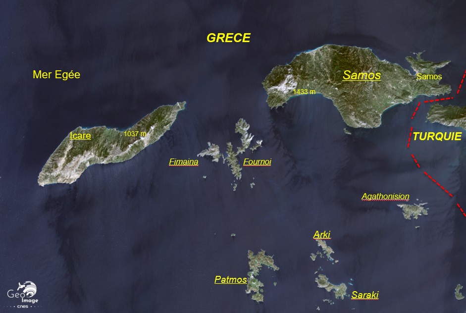 Comme on peut l’observer sur l’image, le relief de toute la région est montagneux. Le mont Lepetymnos à Lesbos culmine à 968 mètres. Sur l’île d’Ikaria – la fameuse Icare, non loin de Samos - le sommet « Fardi » (large) culmine à 1.037 mètres et le mont Kerkis atteint 1.433 mètres à l’ouest de l’île de Samos. De même, à l’est, la partie continentale est élevée. Face à Samos, le Samsun Dagi fait 1.229 m, dans la presqu’île face à Chios, le Ak Dag atteint 1.212 m, au nord-est de Lesbos, le chainon de Zeybek Dagi fait 1.767 m. Dans ce contexte, la grande ville d’Izmir, autrefois Smyrne, se déploie sur une petite plaine littorale au fond d’un golfe assez profond, l’Izmir Körfezi.