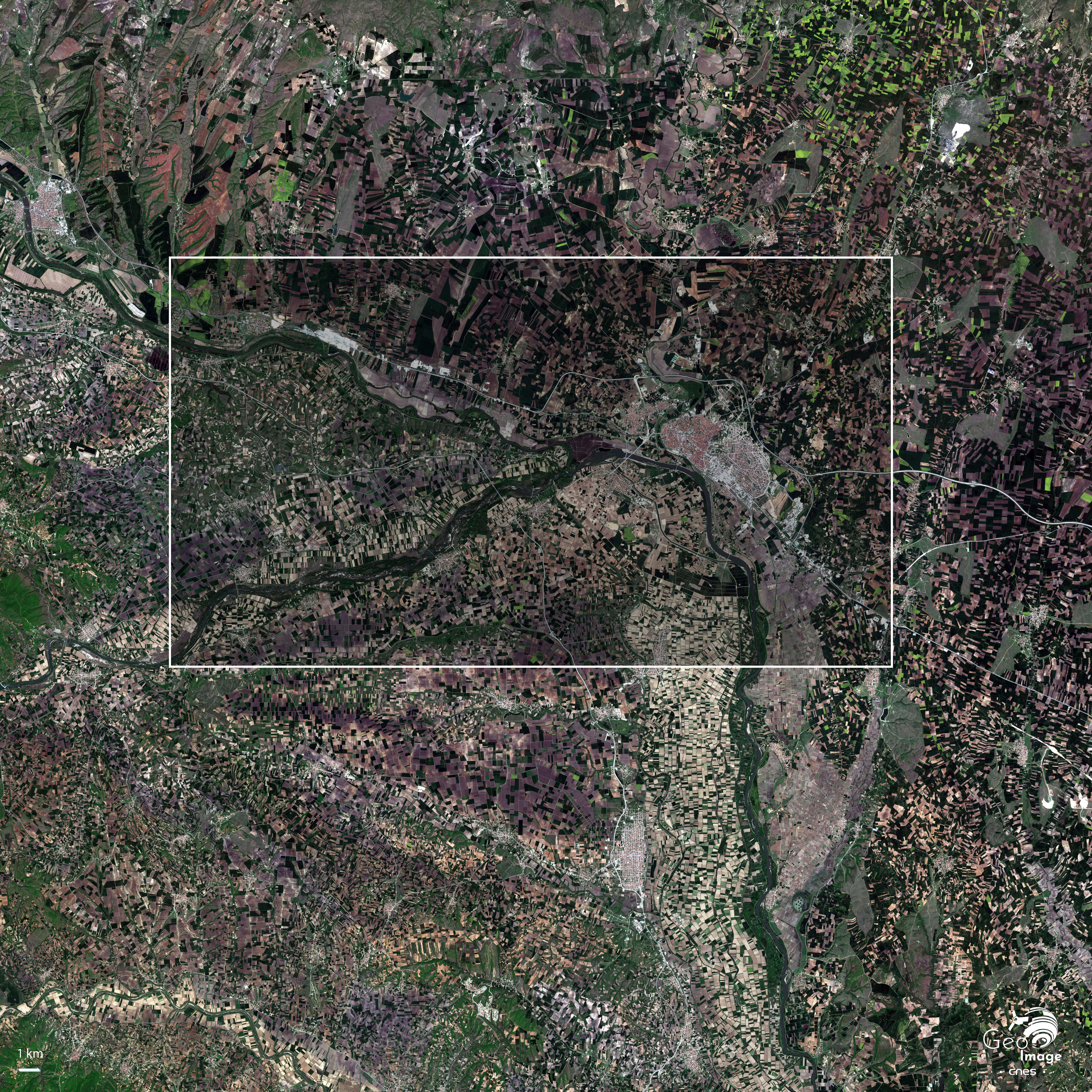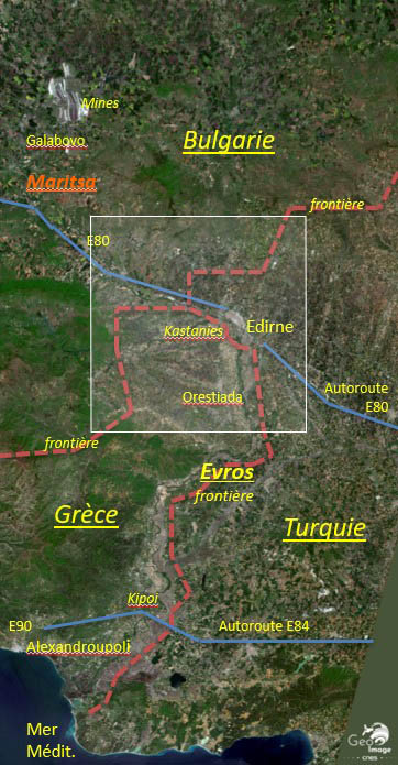 Au nord de l’image, l’Evros coule selon une orientation nord-ouest / sud-est car il vient du cœur historique de la Bulgarie – la Roumélie orientale – qui est comprise entre la chaîne des Rhodopes au sud, qui barre l’accès à la Méditerranée, et celle des Grands Balkans au nord, qui le sépare de la vallée du Danube. Au milieu de l’image, on distingue bien une tâche claire : c’est la ville d’Edirne/Andrinople, la capitale historique de la Thrace qui se trouve aujourd’hui en Turquie.