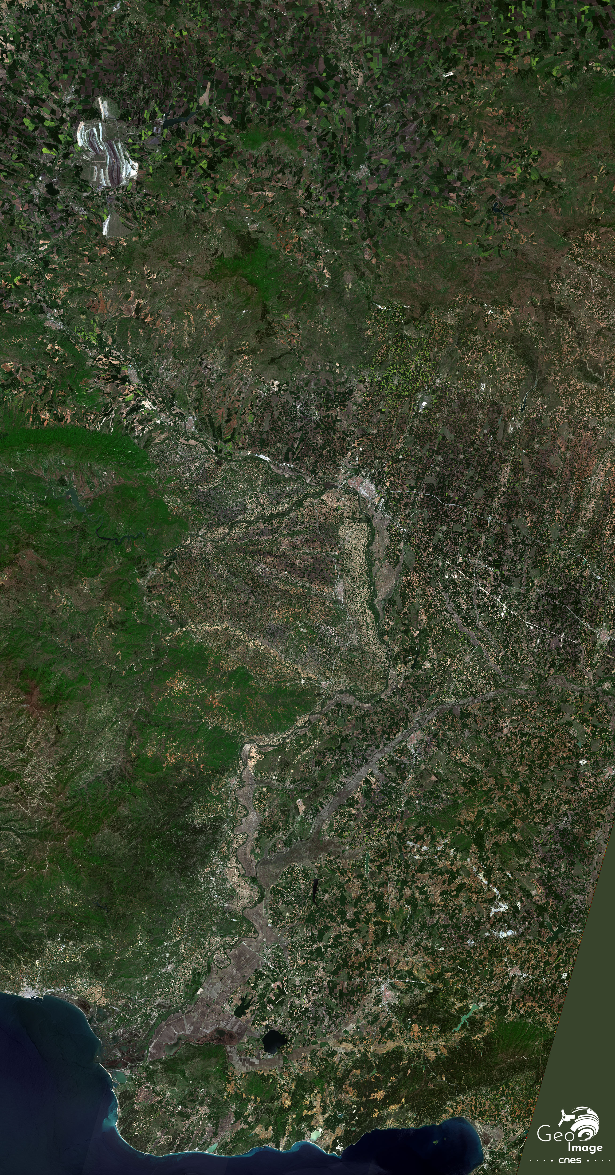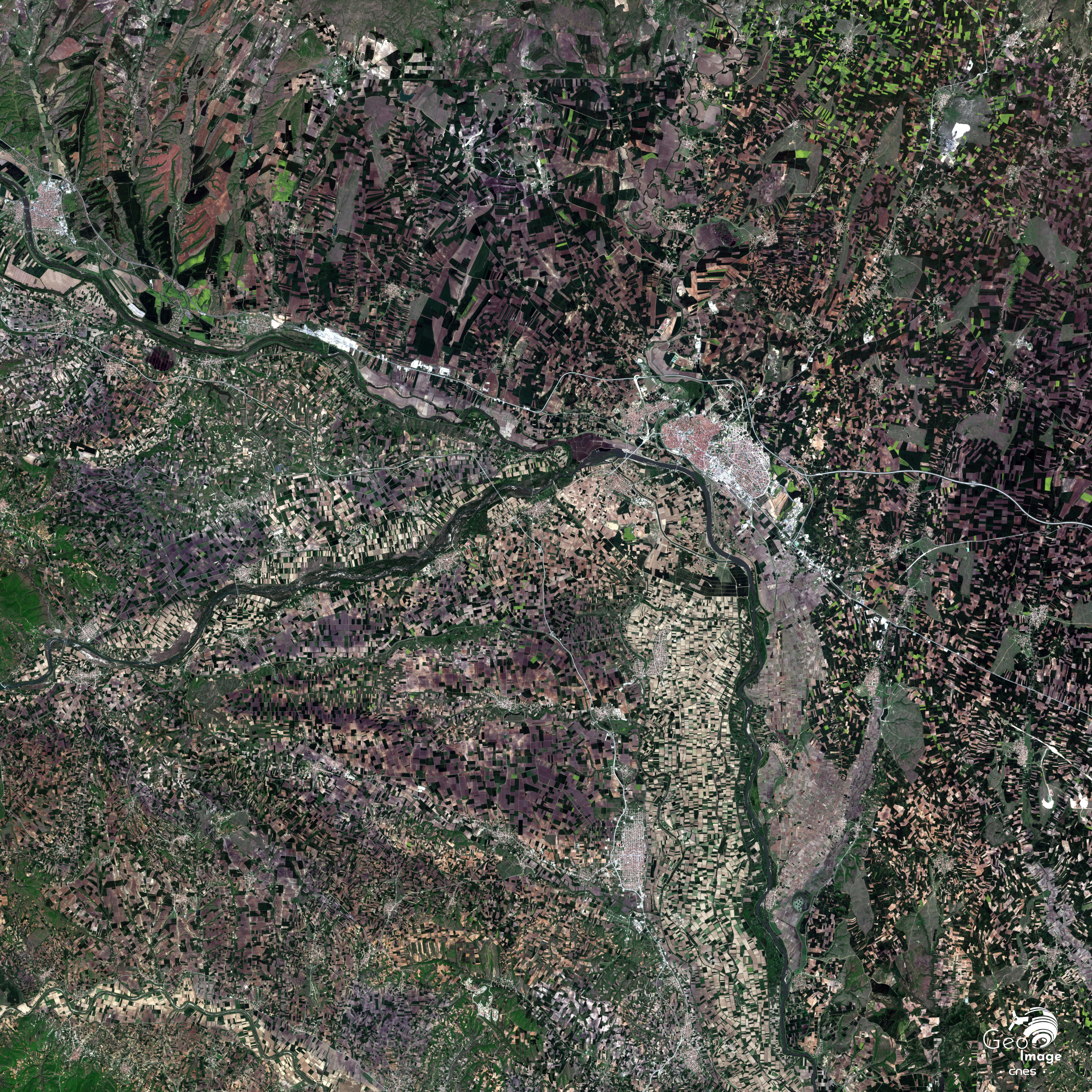 Prise au mois d’avril au début du printemps, l’image présente la vallée du fleuve Evros et son cadre montagneux. Long de 480 km, il joue un rôle majeur dans l’organisation de la partie orientale des Balkans qui juxtapose massifs montagnards, bassins d’effondrement et fossés tectoniques. Au centre de l’image, la vallée de l’Evros/Maristsa sert de colonne vertébrale à toute la Thrace. Ce fleuve prend en effet sa source en Bulgarie vers 2 400 m dans les montagnes de Rila (hors image) pour se jeter par un petit delta dans la mer Méditerranée au sud de l’image.