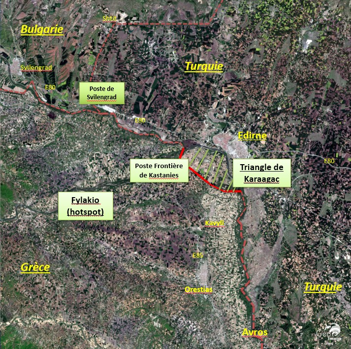 Cette excroissance - à fonction stratégique défensive - est dénommée le « triangle de Karaagac », du nom du gros bourg turc qui s’y trouve. Il est relié à Edirne par trois ponts dont un grand pont principal, bien visible, par lequel passe l’axe principal qui mène au poste frontière de Kastanies / Pazarkule, situé à 7 km d’Edirne. Le tracé frontalier du triangle de Karaagaç mesure 10 km de long. C’est un point de fixation pour les migrants souhaitant entrer en Grèce, et dans l’Union européenne. Afin de le contrôler, un système de barrières élevées (clôtures et barbelés) – souvent présenté comme un « mur » par les médias et les ONG - y a été construit côté grec.