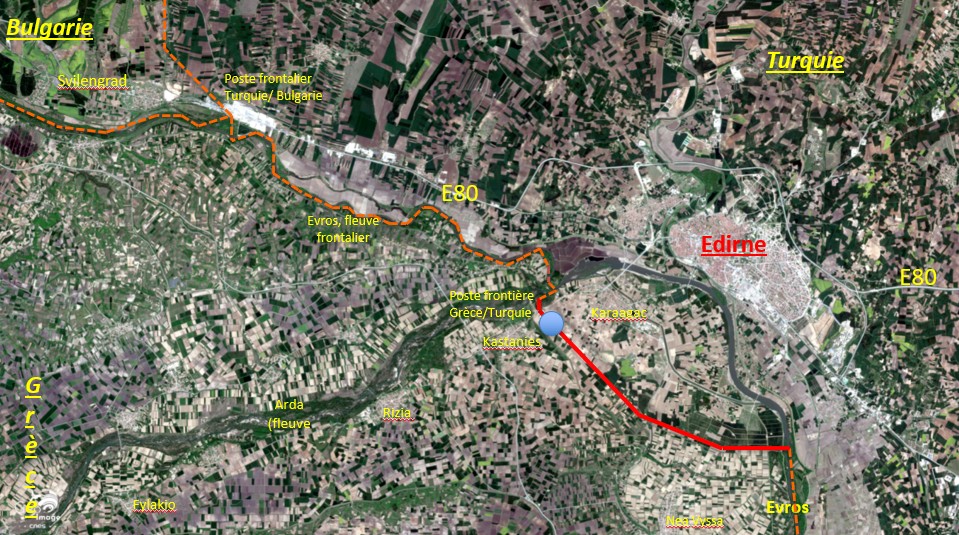 Le poste frontière de Kastanies, du nom du village grec de 600 habitants, est régulièrement fermé. Car il est le théâtre d'incidents violents entre forces policières turques et grecques et des milliers de migrants qui se sentent piégés. Les médias y viennent souvent en reportage ; tout comme certaines ONG. Mais comme le montre bien l’image, il serait possible d’y freiner, voir d’y interdire, l’arrivée des migrants en contrôlant tout simplement du côté turc les trois ponts sur le fleuve. En fait, une fois entrés dans le triangle de Kastanies les migrants se retrouvent pris dans une sore de souricière, entre fleuve et grillages/barbelés, entre intérêts turcs et grecs.